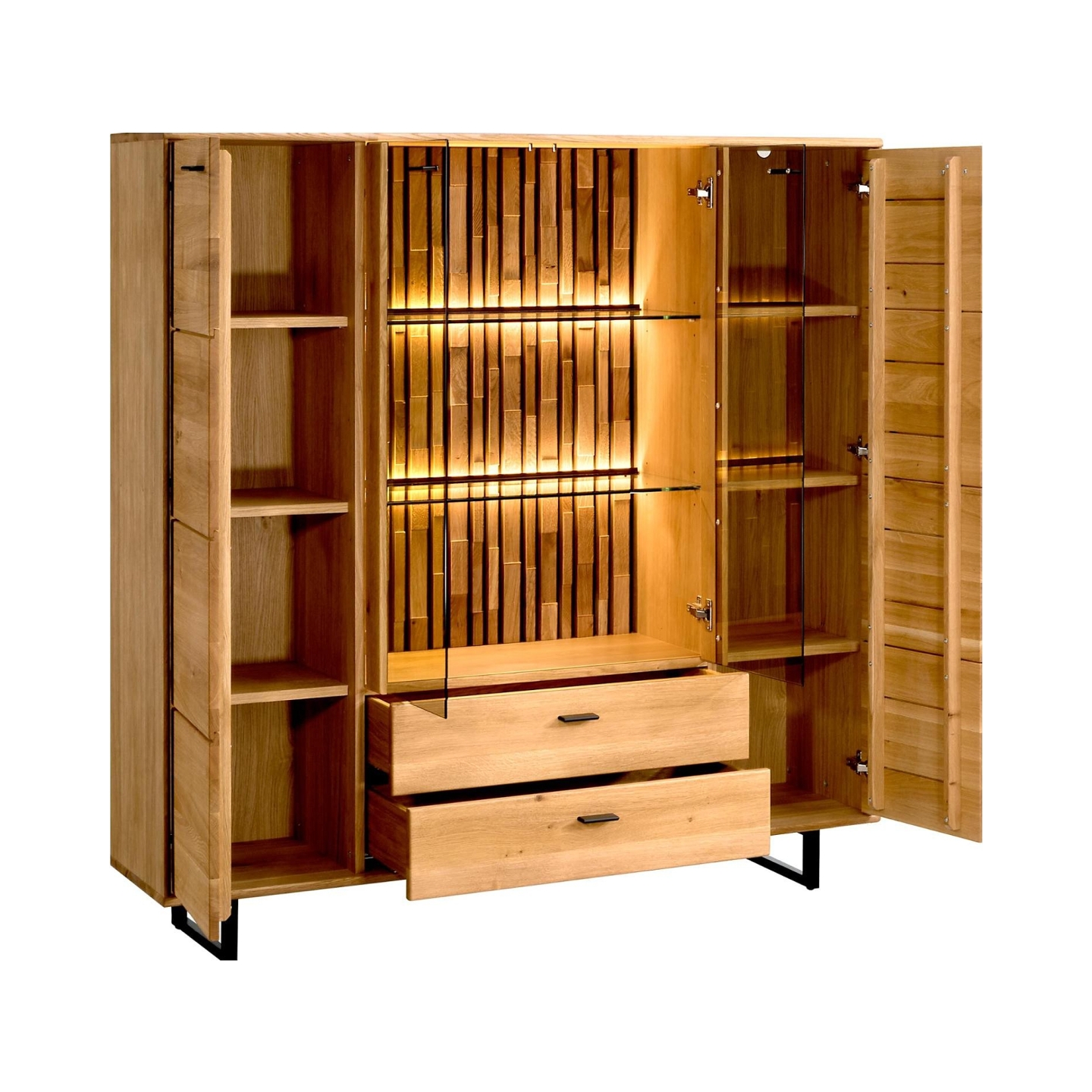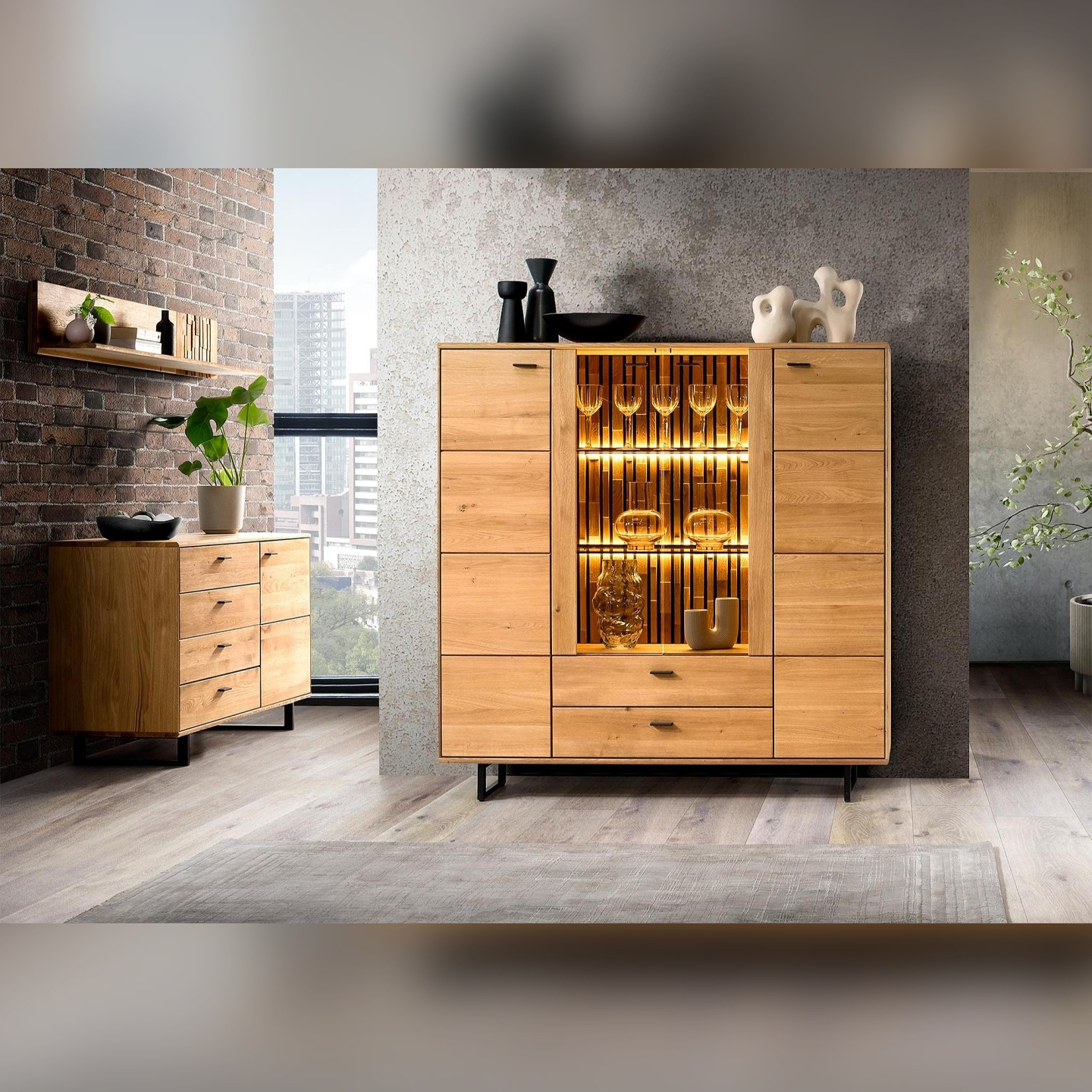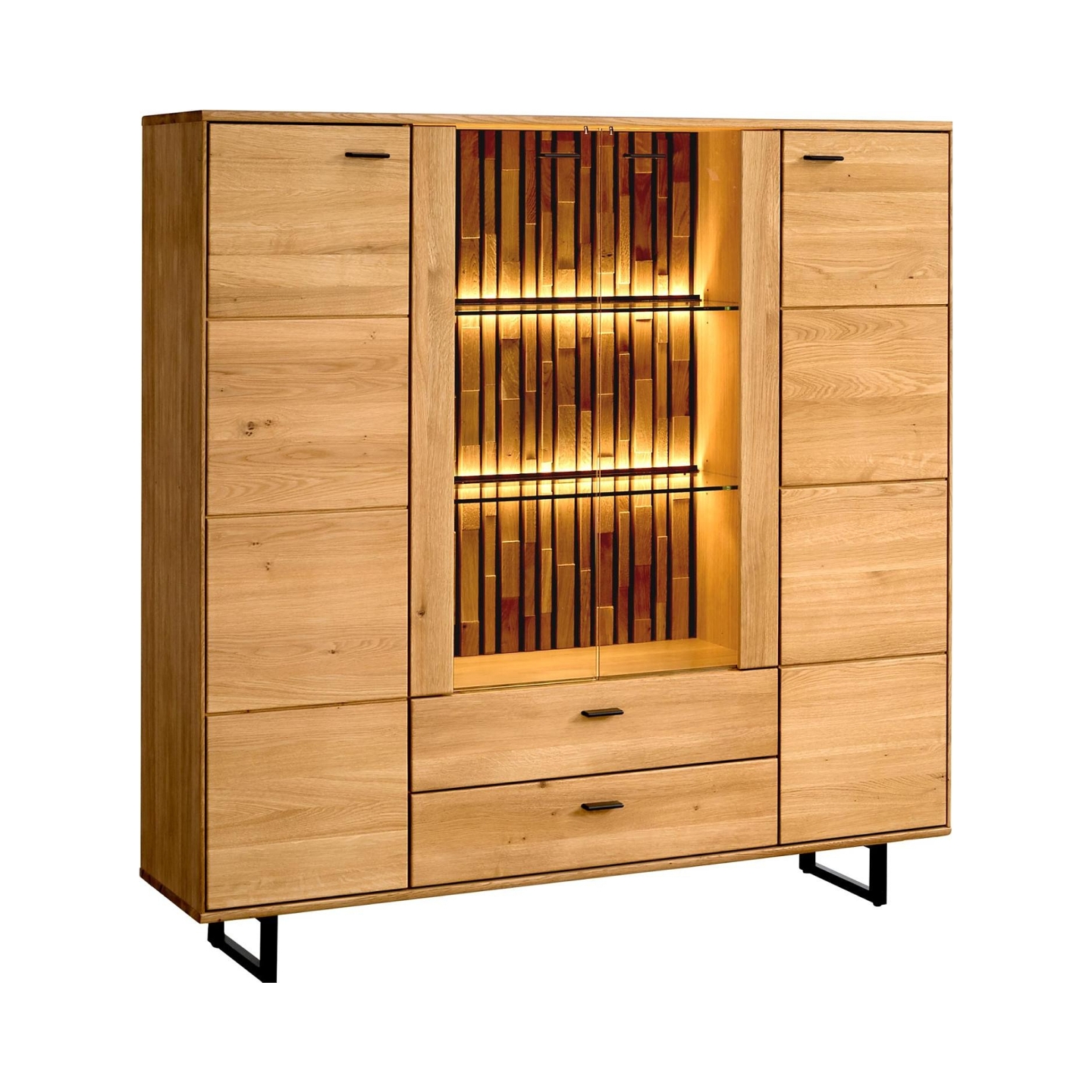 Przedstawiamy Kredens dębowy Tramonto – majestatyczny i funkcjonalny mebel, który stanie się centralnym punktem każdego wnętrza. Ten kredens, widoczny na załączonym zdjęciu, charakteryzuje się połączeniem szlachetnego dębu sęcznego z nowoczesnym designem, podkreślonym przez wbudowane oświetlenie. Jest to idealne rozwiązanie dla tych, którzy cenią sobie elegancję, przestronność i wysoką jakość wykonania. Mebel jest dostarczany w pełni zmontowany, co gwarantuje łatwość i szybkość aranżacji.