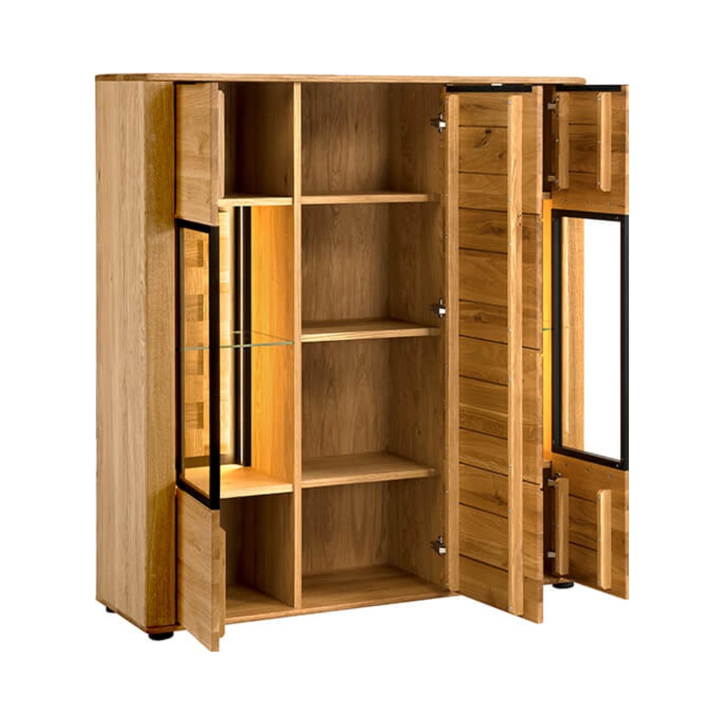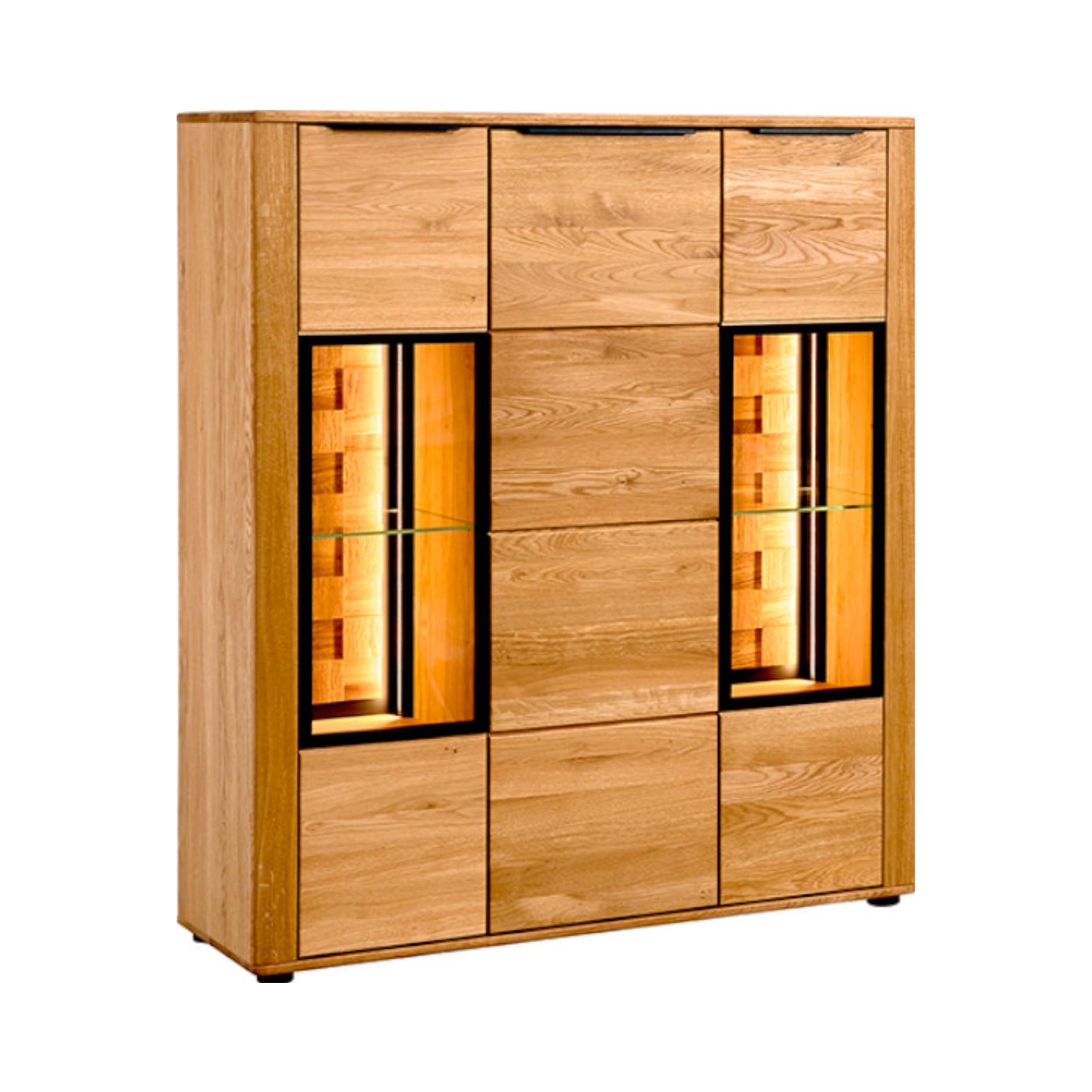 Kredens III nowoczesny Luna to mebel, który zaspokoi potrzeby najbardziej wymagających użytkowników. Jego przemyślana konstrukcja, widoczna na załączonym zdjęciu, z licznymi zamkniętymi szafkami i dwoma przeszklonymi witrynami z oświetleniem, pozwala na przechowywanie szerokiej gamy przedmiotów – od zastawy stołowej i eleganckiego szkła, po książki i dekoracje. Naturalny dąb w połączeniu z nowoczesną formą tworzy mebel, który jest zarówno praktyczny, jak i stanowi centralny punkt dekoracyjny w każdym pomieszczeniu. Ten kredens to inwestycja w piękno i funkcjonalność, która z pewnością podniesie estetykę Twojego domu.
