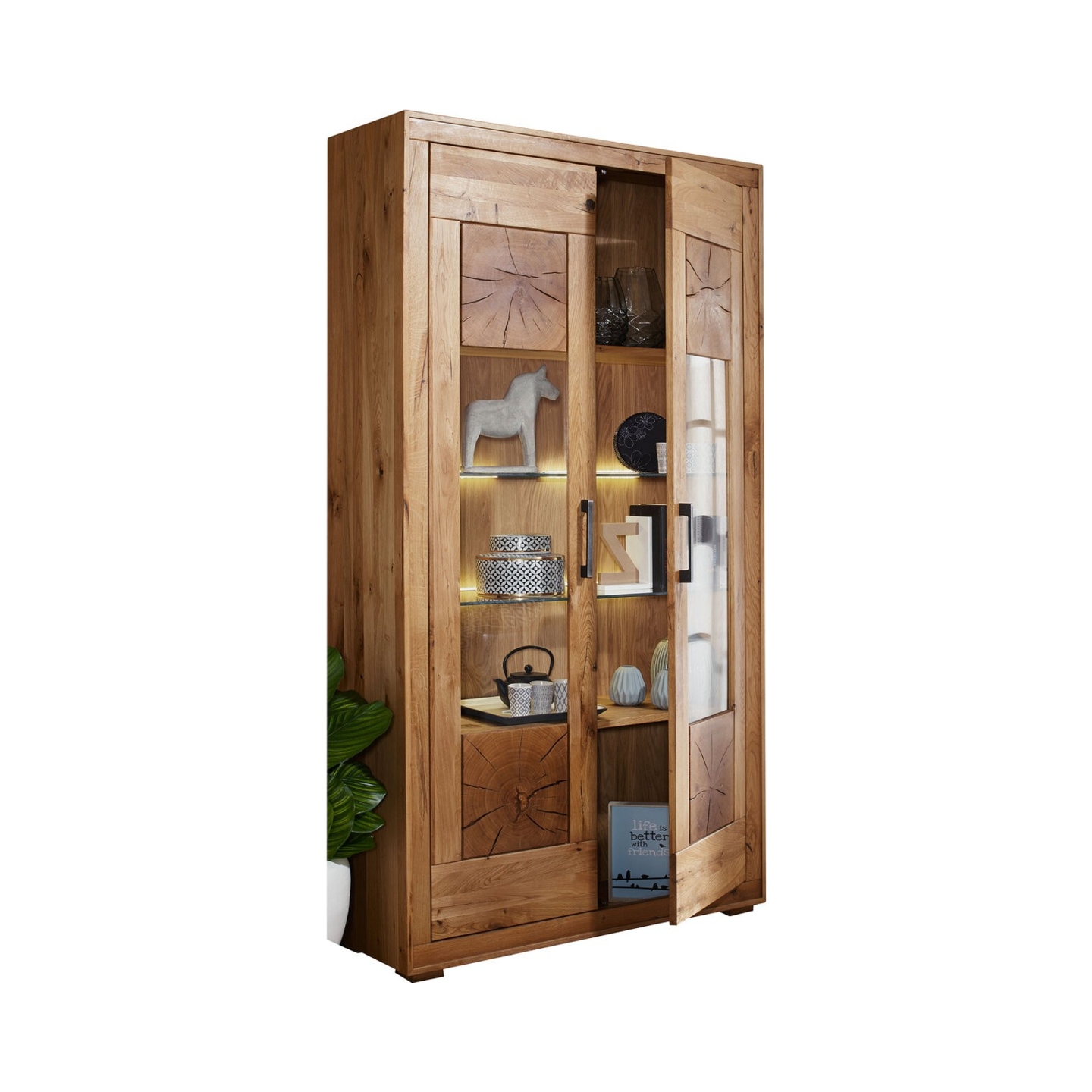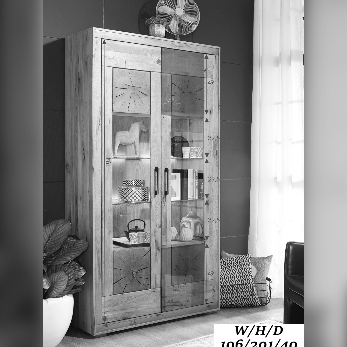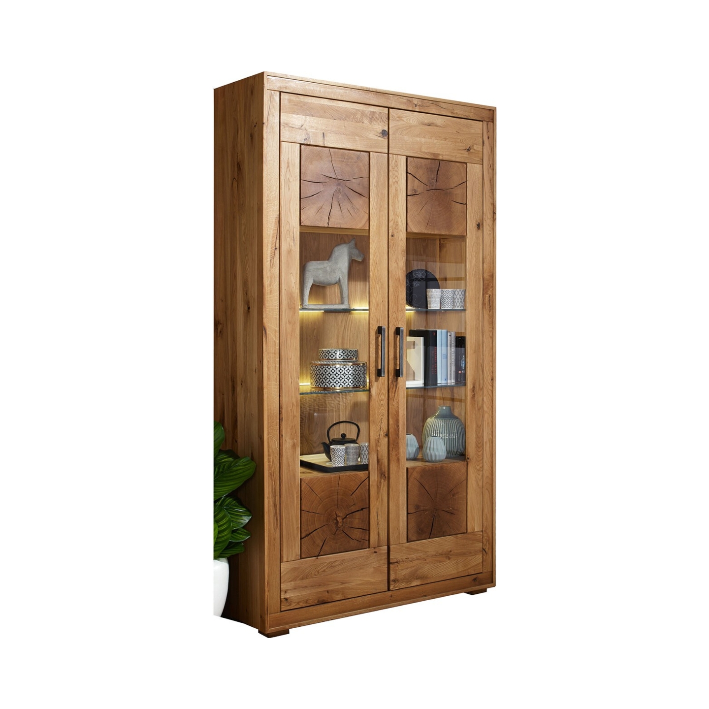 Witryna przyjeżdża w całości zmontowana, bez potrzeby składania czy klejenia. Matowy olej zabezpiecza powierzchnię, a jednocześnie pozwala zachować naturalną fakturę drewna. To mebel, który od razu staje się częścią wnętrza.