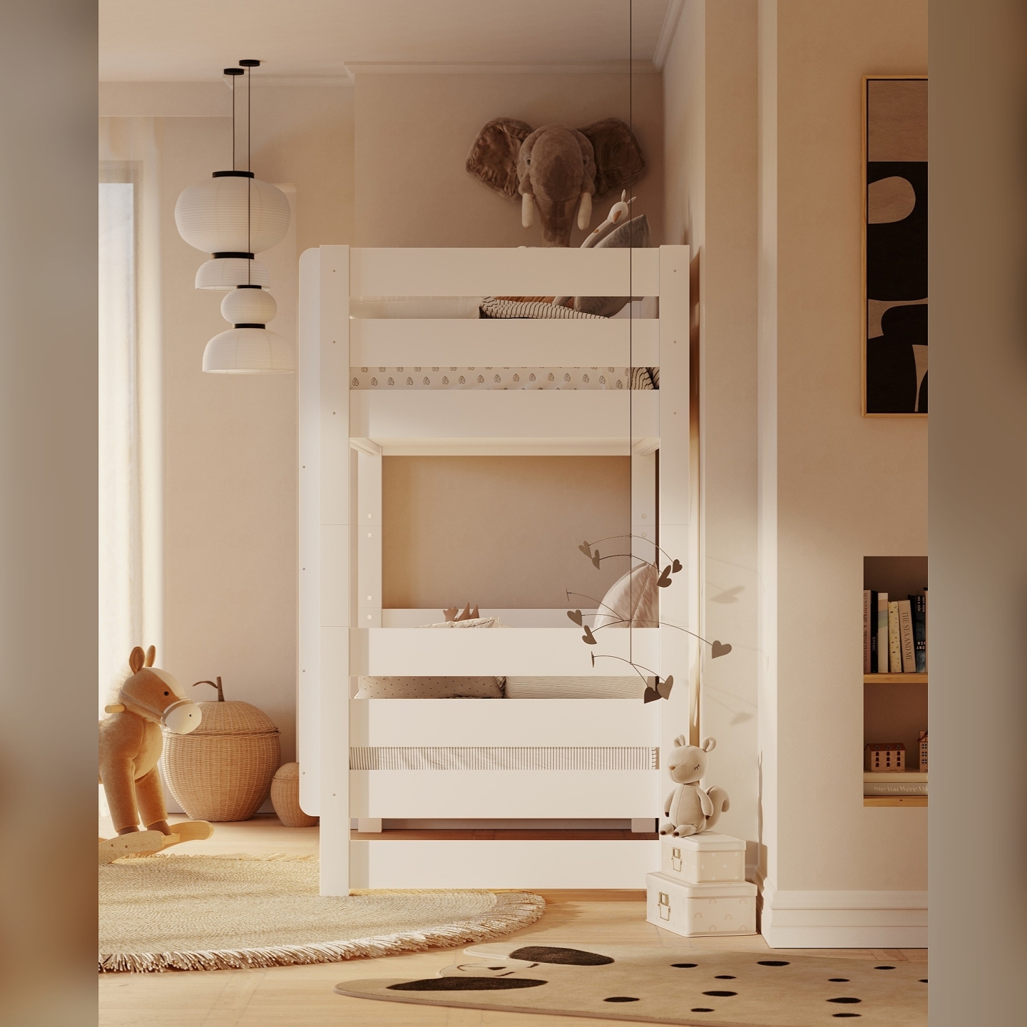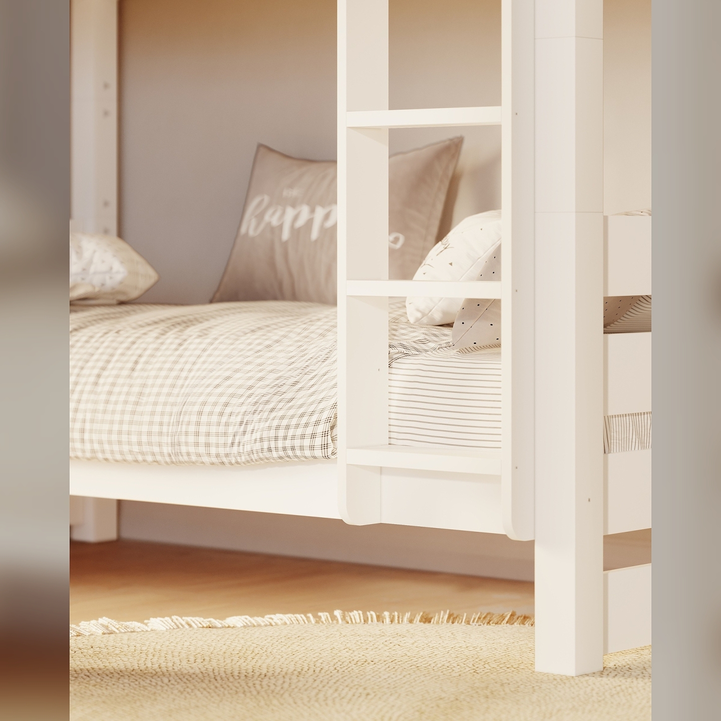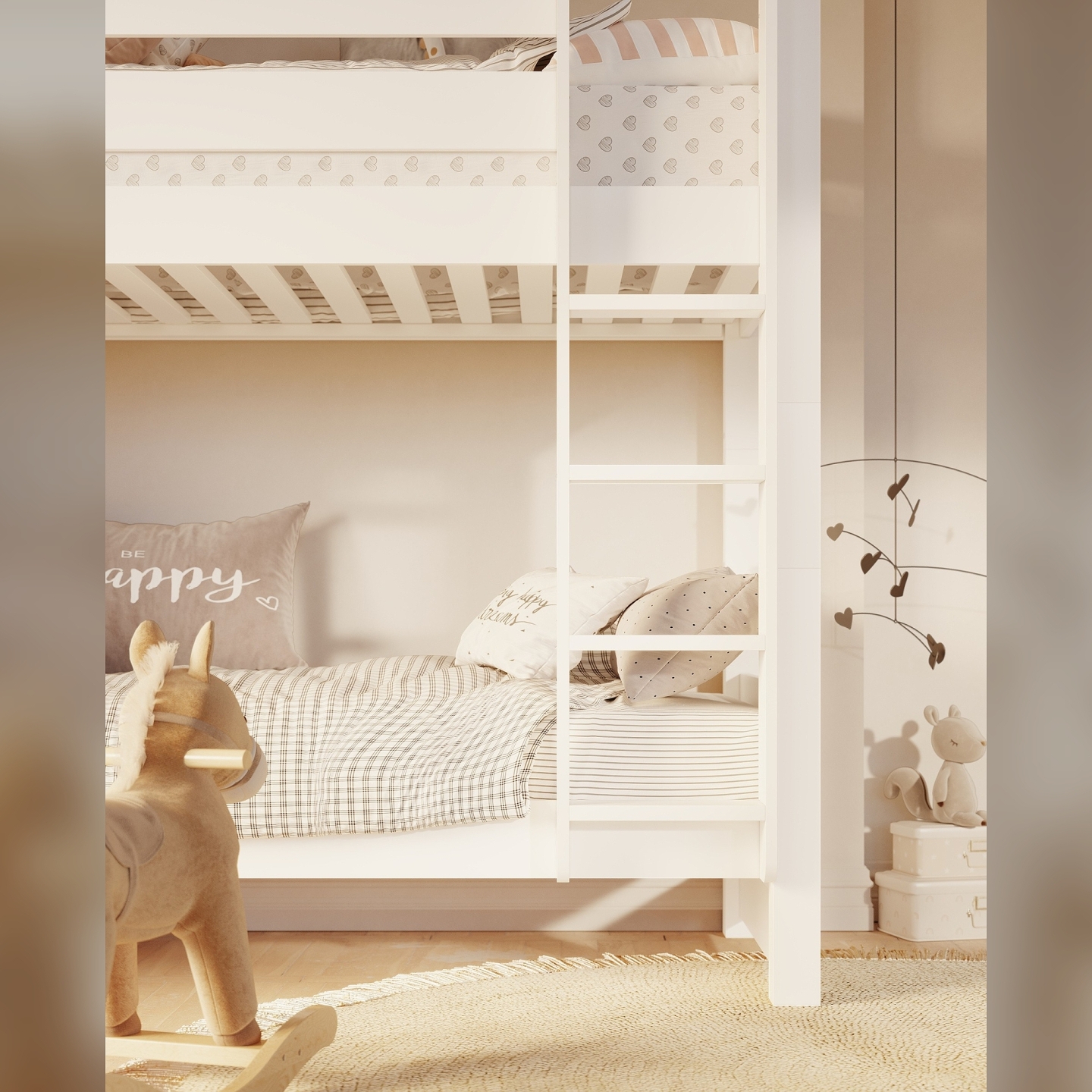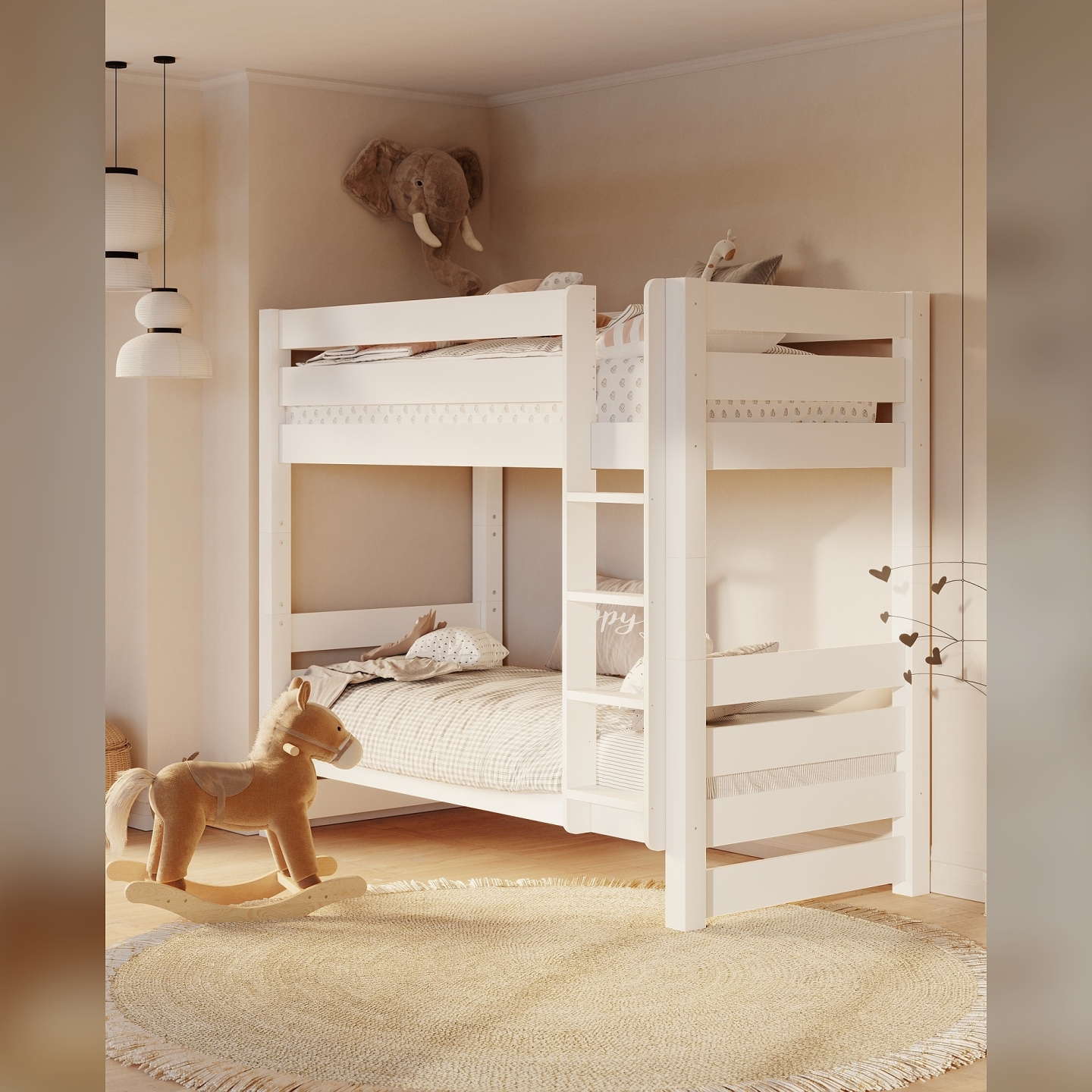 👉 Stabilna drabinka montowana z lewej lub prawej strony – dopasowanie do każdego pokoju.