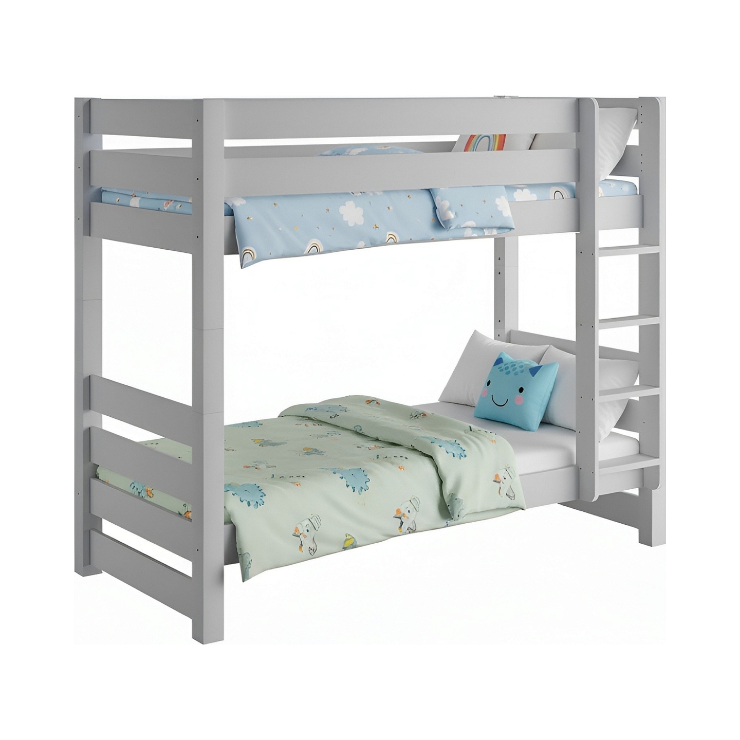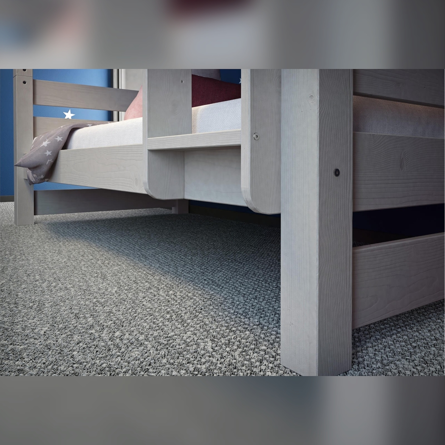 Szare łóżko piętrowe Jan z litego drewna sosnowego, dzięki solidnej konstrukcji, stanowi bezpieczne i stylowe rozwiązanie, które wprowadza nowoczesny akcent do każdego pokoju dziecka.