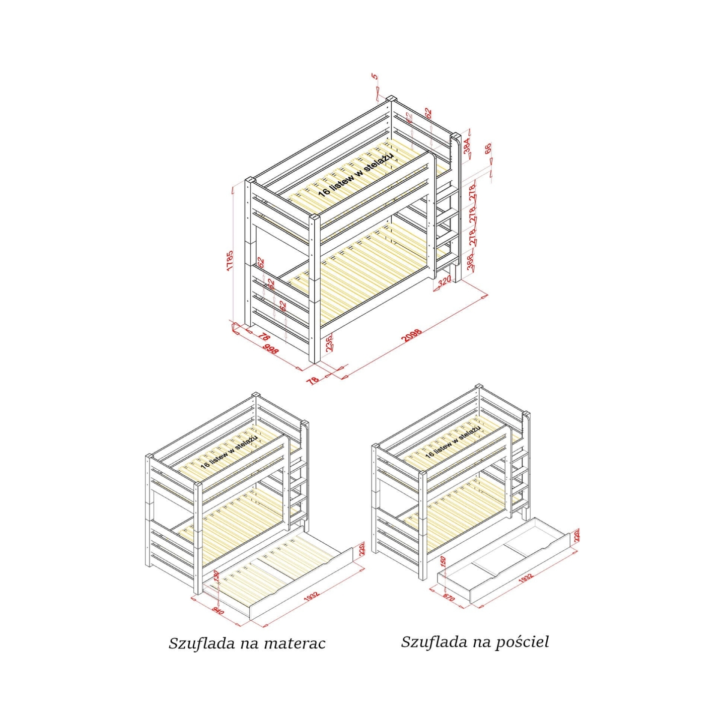 👉 Opcjonalna szuflada na pościel lub materac – dodatkowe miejsce do przechowywania lub spania.