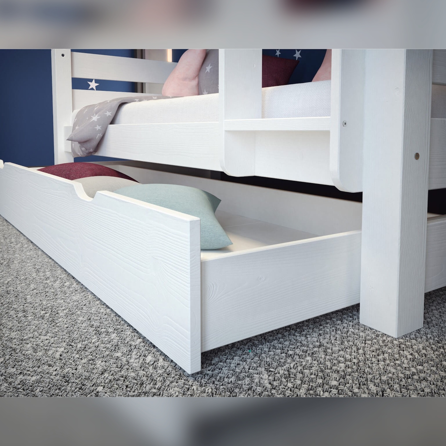 Szuflada na pościel to funkcjonalny i estetyczny dodatek, który pomoże Ci w utrzymaniu porządku w pokoju dziecięcym lub sypialni. Zaprojektowana z myślą o łóżkach piętrowych, idealnie do nich pasuje, tworząc spójną i elegancką całość. Wykonana z naturalnego drewna, w białym kolorze, dodaje wnętrzu lekkości i świeżości, a jednocześnie zapewnia solidność i trwałość. Jest to doskonałe rozwiązanie do przechowywania pościeli, zabawek, ubrań, a także innych drobiazgów.