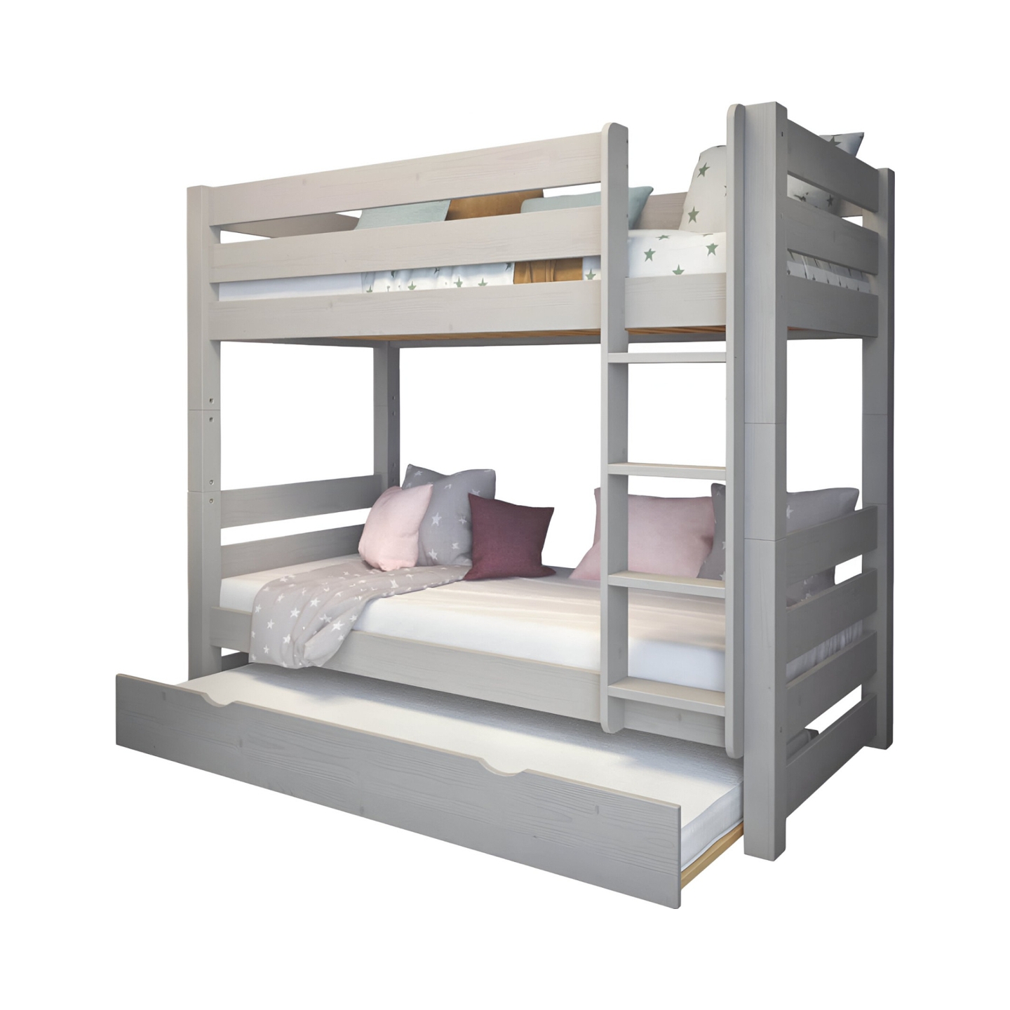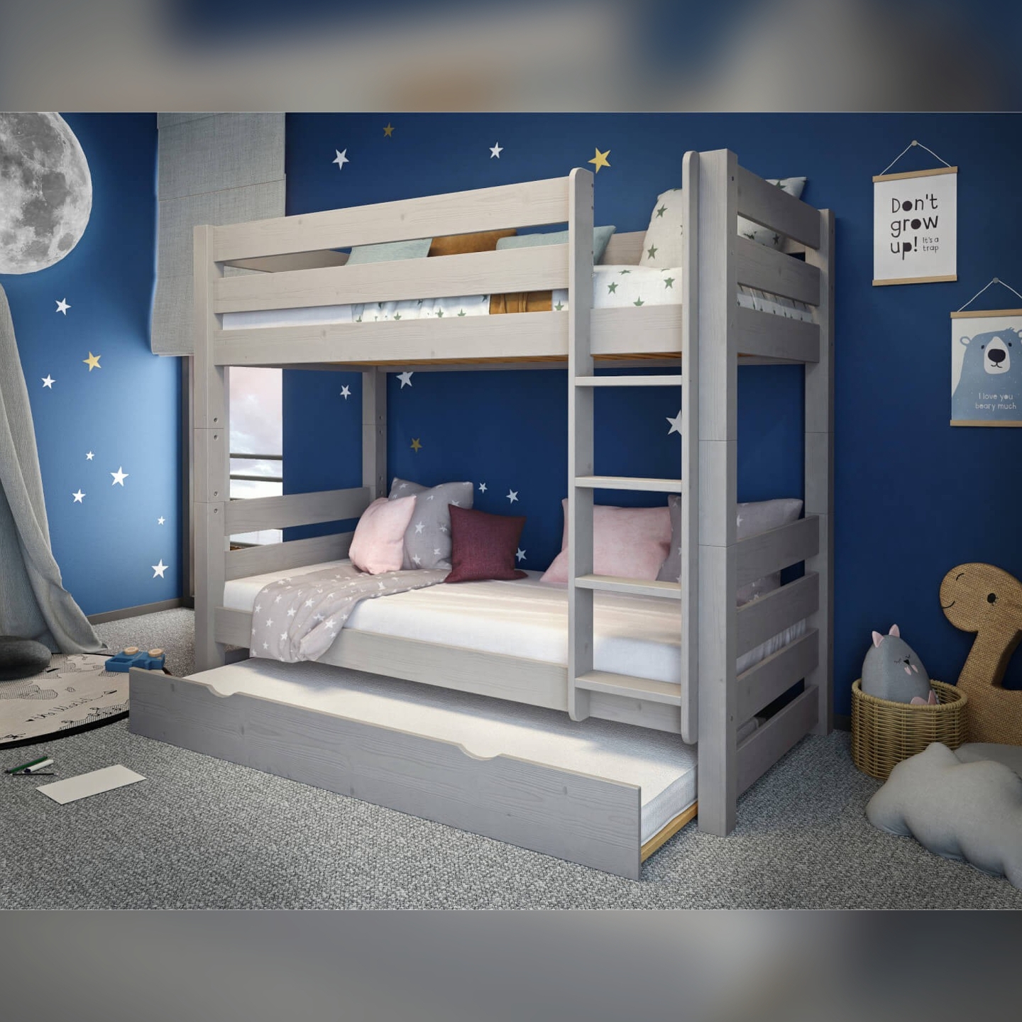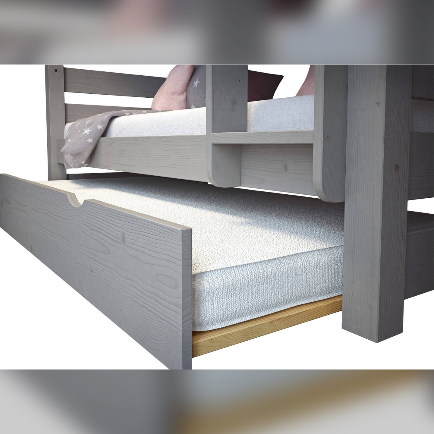 Zapewnij sobie dodatkową przestrzeń do spania i maksymalnie wykorzystaj potencjał pokoju dziecięcego dzięki tej praktycznej szufladzie na materac. To niezastąpiony element wyposażenia, który pozwoli Ci szybko przygotować nocleg dla gościa lub rodzeństwa. Szuflada, widoczna na zdjęciu, charakteryzuje się surowym, naturalnym wykończeniem drewna sosnowego, co podkreśla jej solidny i ekologiczny charakter.