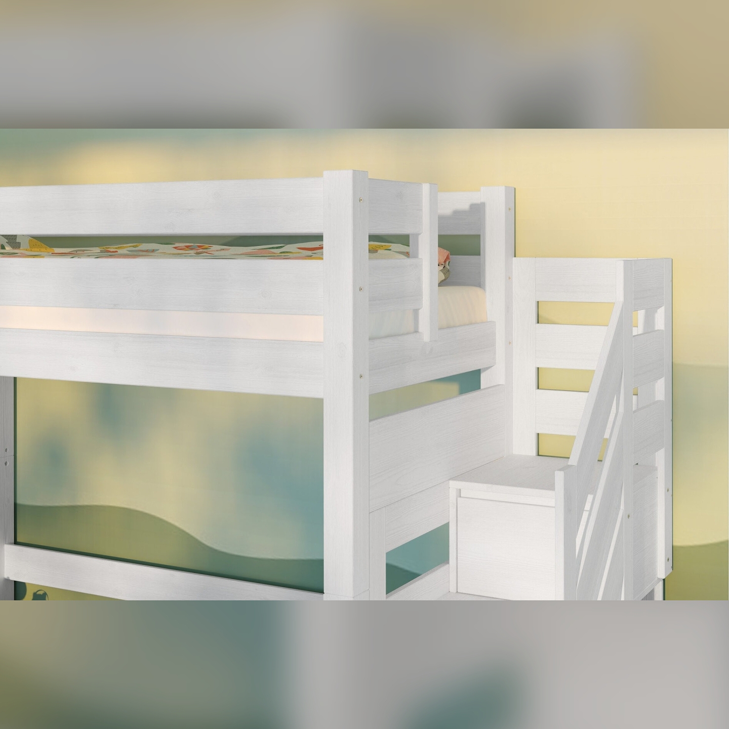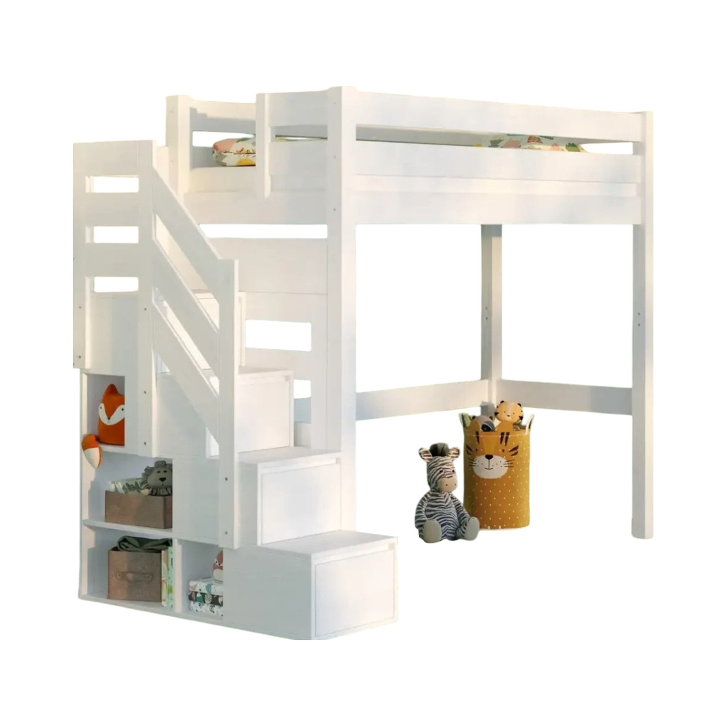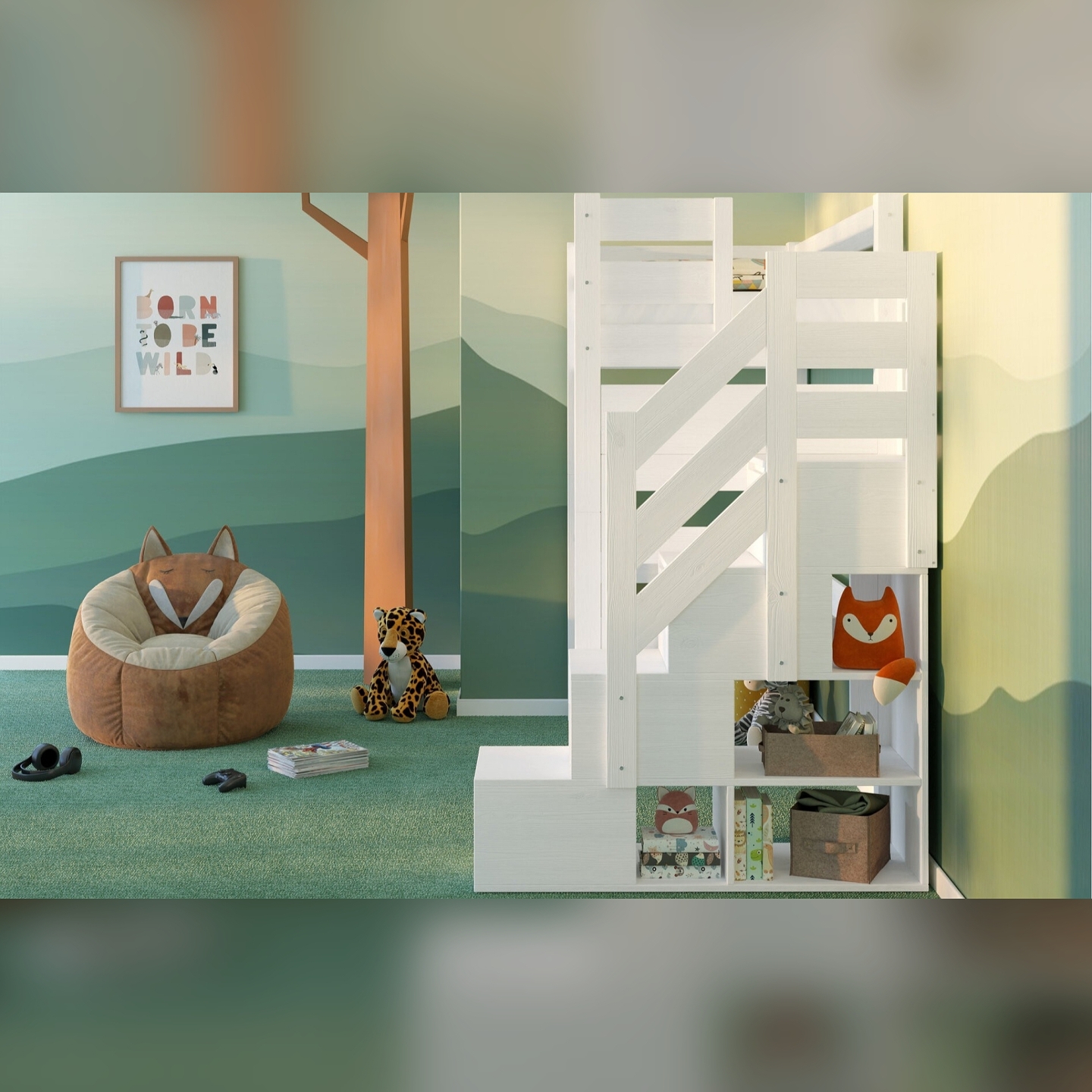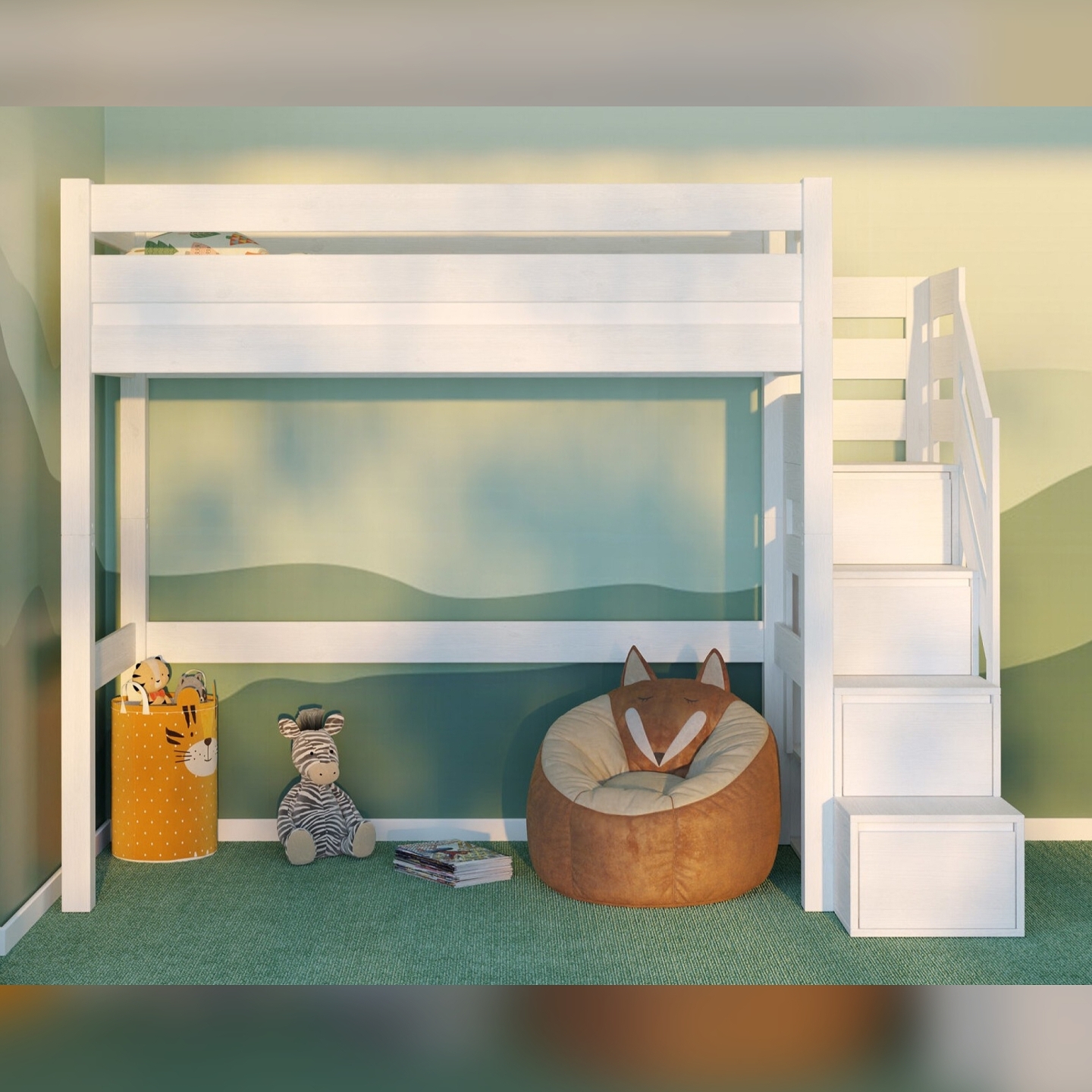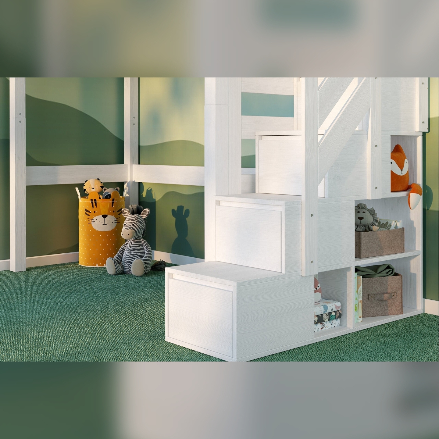 przestrzeniach. Wykonane w 100% z litej sosny, pochodzącej od polskich dostawców. Schodki z szufladami zapewnia wygodne wejście, miejsce do przechowywania i przestrzeń do zabawy pod łóżkiem.To mebel, który łączy komfort, porządek i bezpieczeństwo.