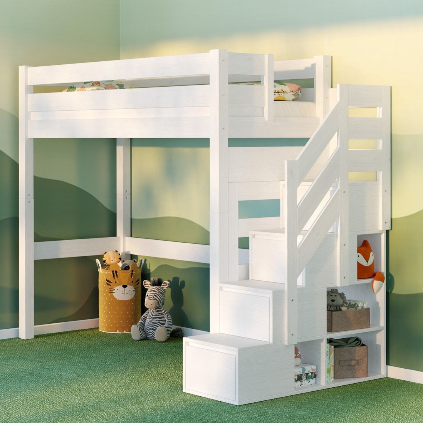 👉 Schody z szufladami – bezpieczne wejście i dodatkowa przestrzeń na zabawki, ubrania, pościel.