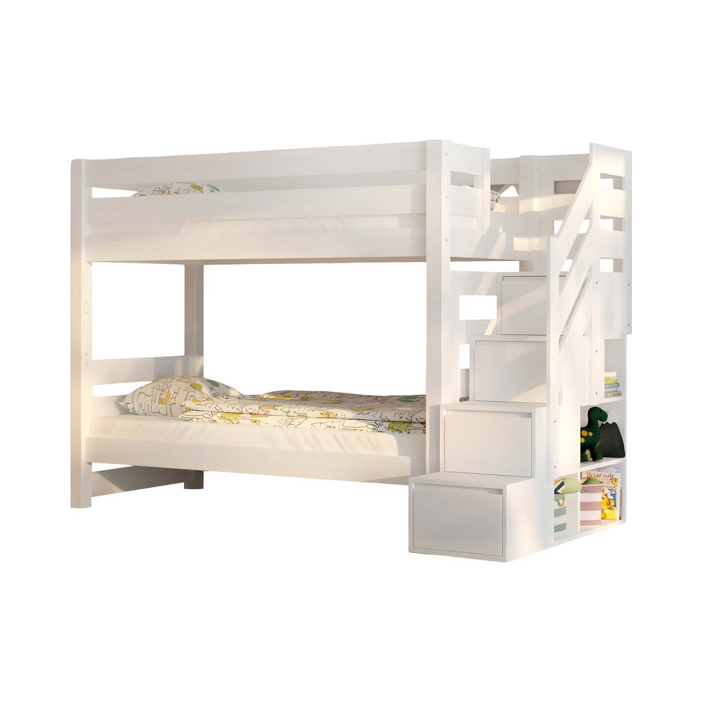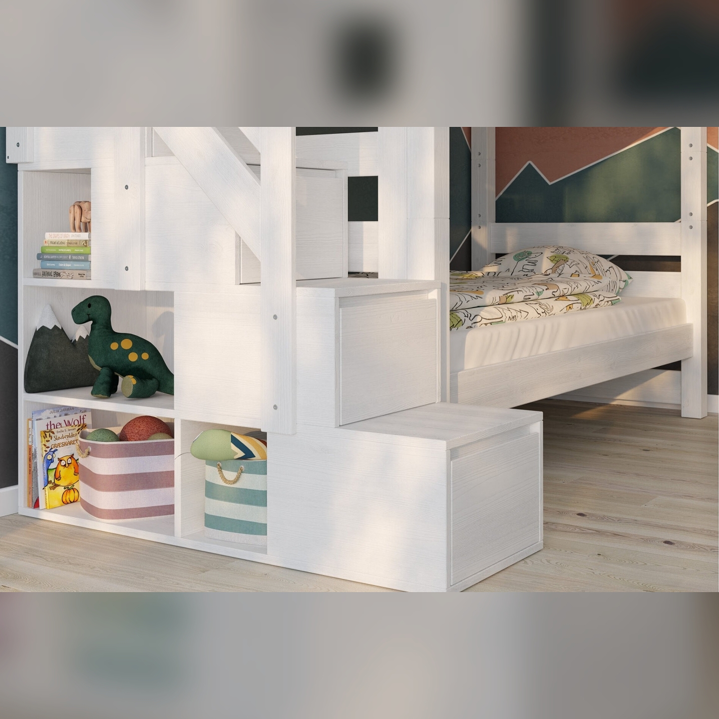 👉 Schodki z szufladami – pełnią funkcję wygodnych stopni i pojemnych schowków na zabawki lub pościel.