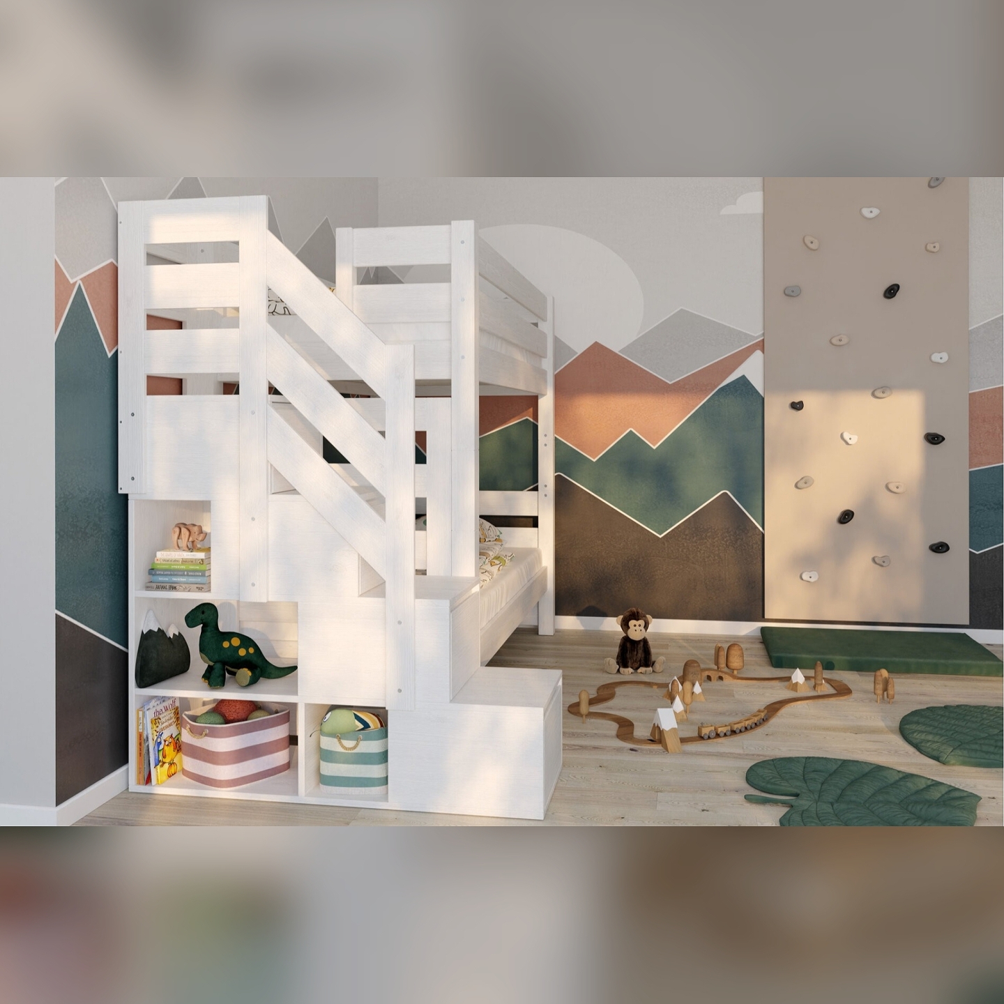 👉 Modułowy montaż – schodki można zamontować po lewej lub prawej stronie, w zależności od ustawienia pokoju.