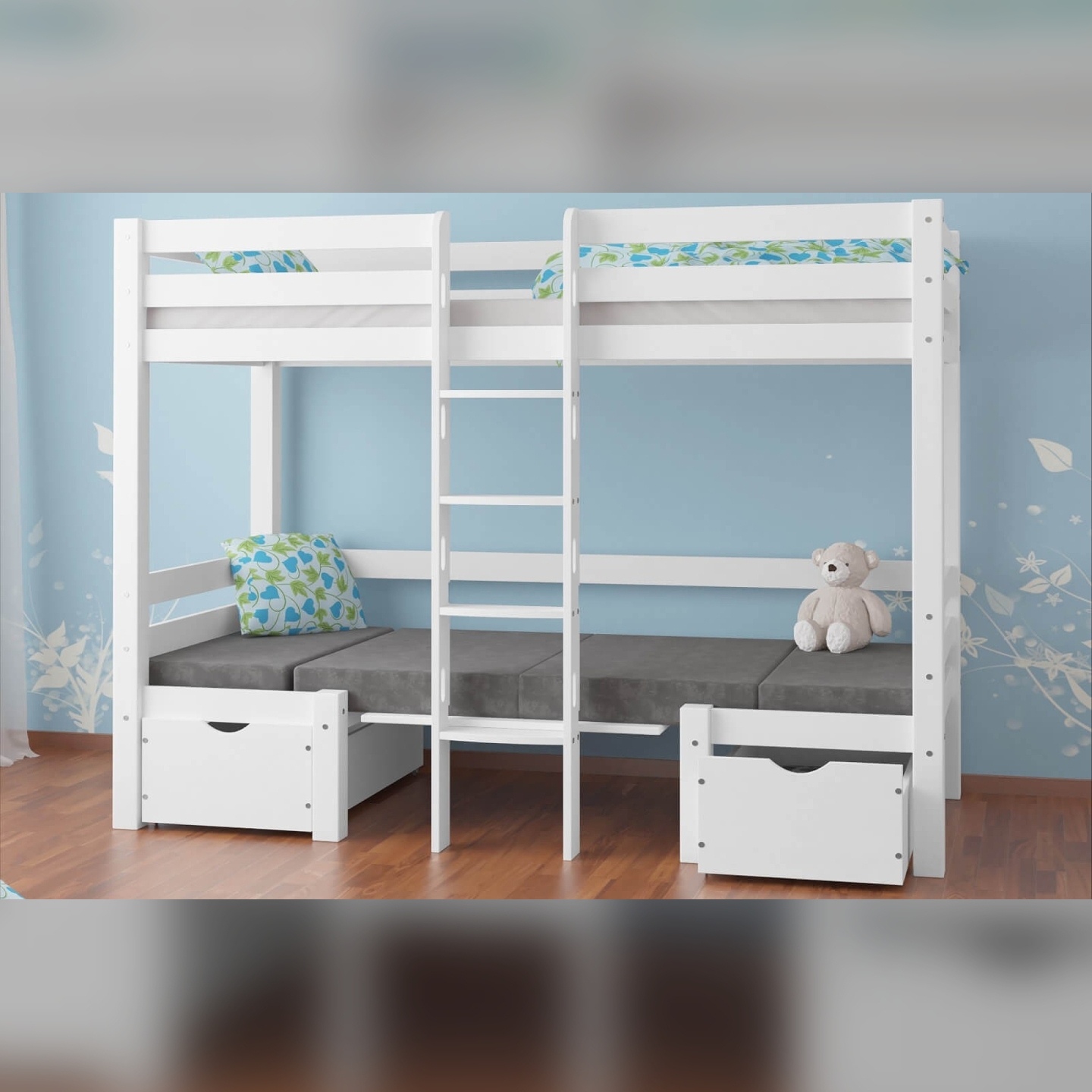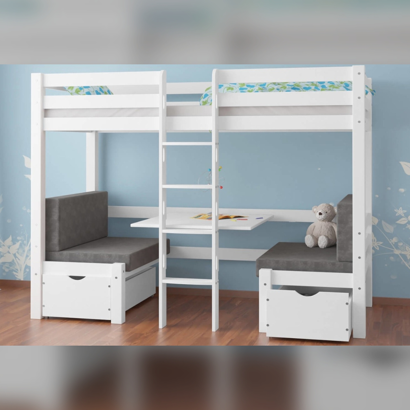 Białe łóżko piętrowe Elen to wielofunkcyjne łóżko piętrowe 3w1 wykonane z litej sosny polskiego pochodzenia, które łączy spanie, naukę i przechowywanie w jednej, solidnej konstrukcji.