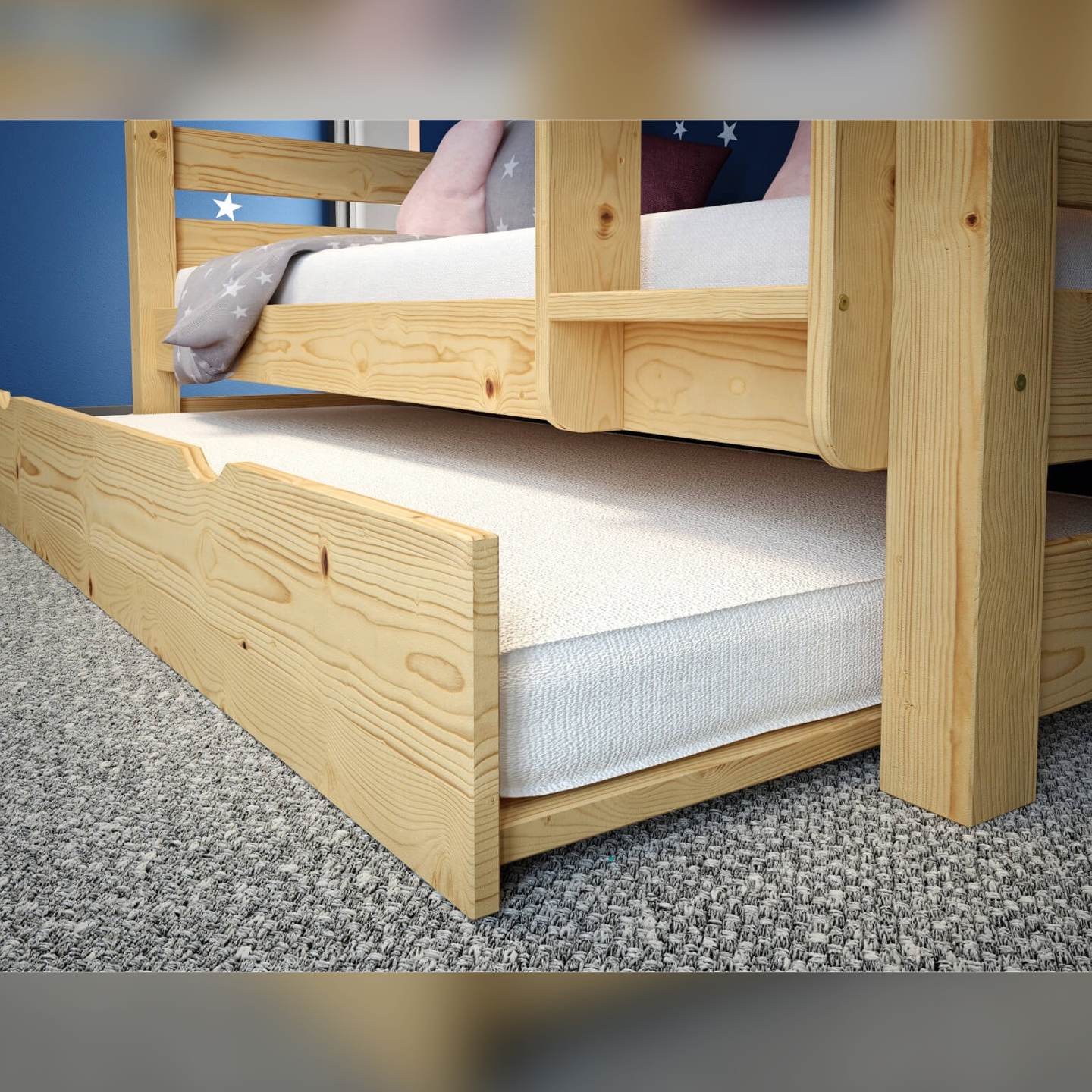 Zapewnij sobie dodatkową przestrzeń do spania i maksymalnie wykorzystaj potencjał pokoju dziecięcego dzięki tej praktycznej szufladzie na materac. To niezastąpiony element wyposażenia, który pozwoli Ci szybko przygotować nocleg dla gościa lub rodzeństwa. Szuflada, widoczna na zdjęciu, charakteryzuje się surowym, naturalnym wykończeniem drewna sosnowego, co podkreśla jej solidny i ekologiczny charakter.