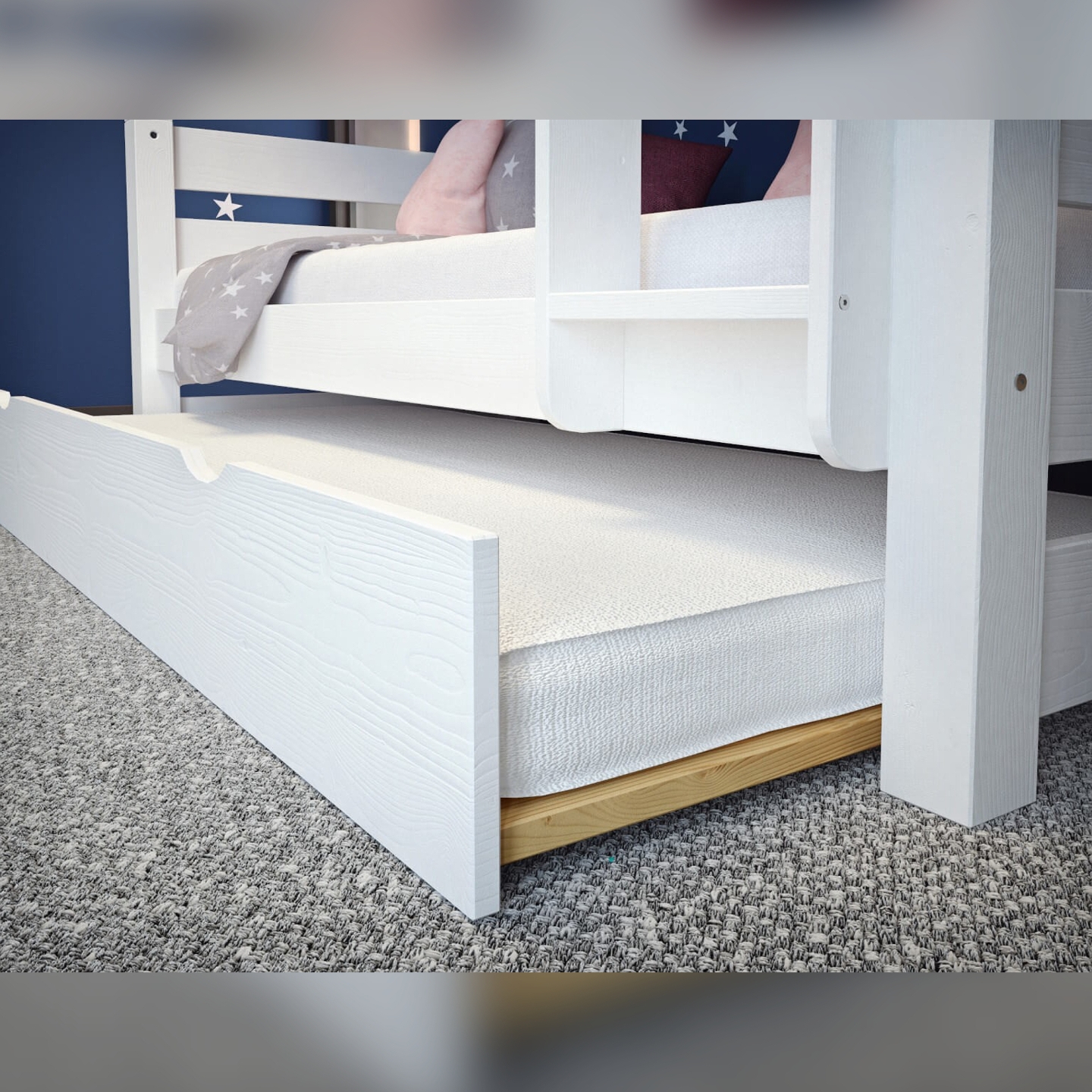 Zaprojektowana z myślą o funkcjonalności i eleganckim wyglądzie, szuflada na materac to idealne rozwiązanie do pokoju dziecięcego lub gościnnego. Stanowi doskonałe uzupełnienie łóżek 3 osobowych, harmonijnie komponując się z ich minimalistycznym designem. Wykonana z solidnego drewna i pomalowana na biało, szuflada wniesie do każdego wnętrza świeżość i lekkość. To niezastąpiony element, gdy potrzebujesz dodatkowego miejsca do spania, a jednocześnie chcesz zachować porządek i przestrzeń.