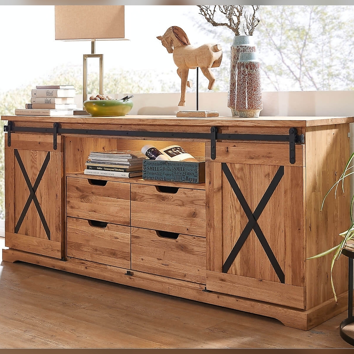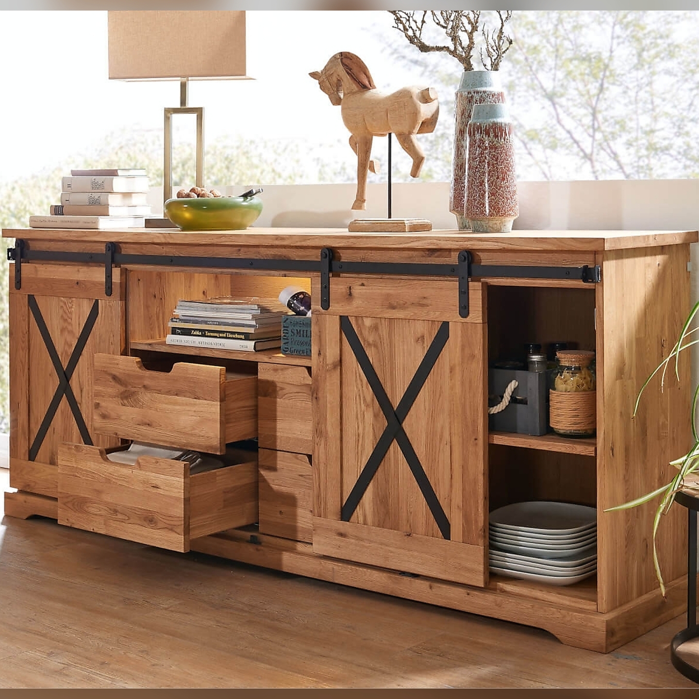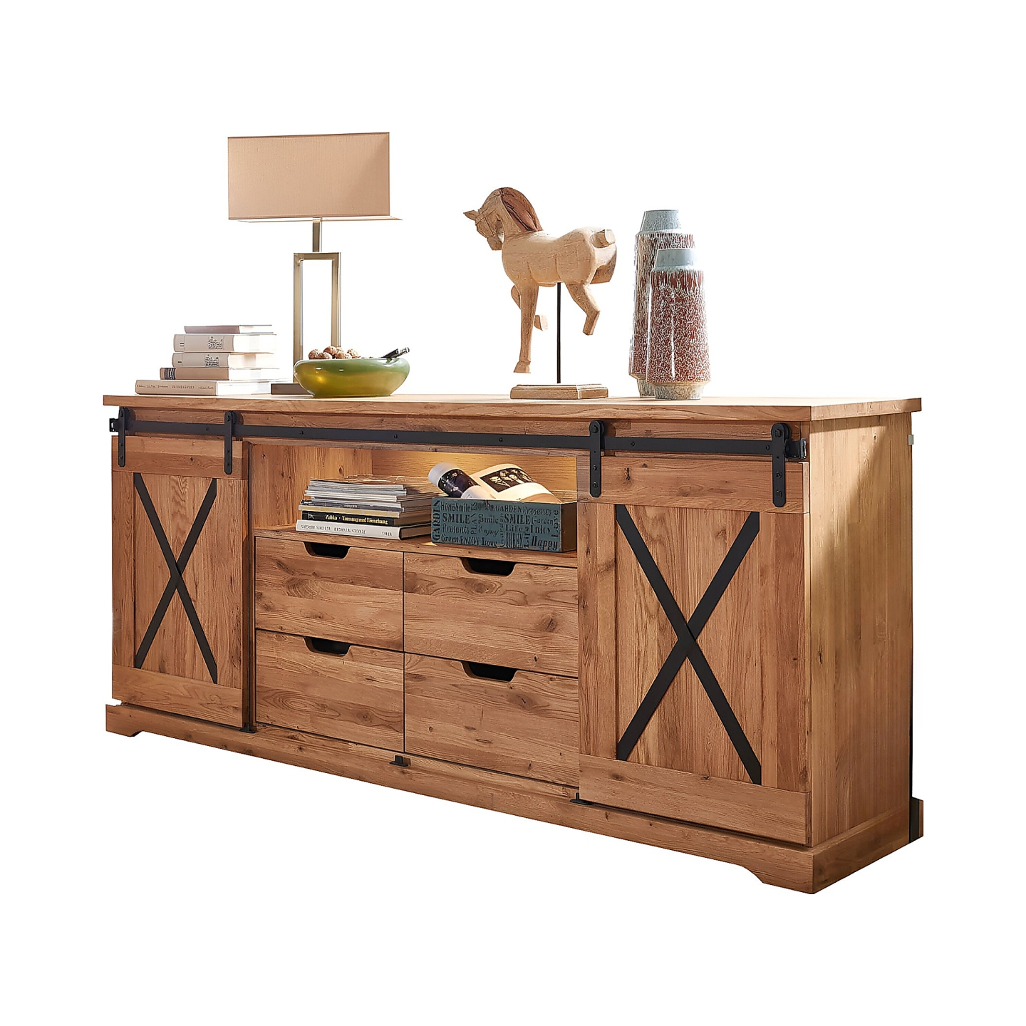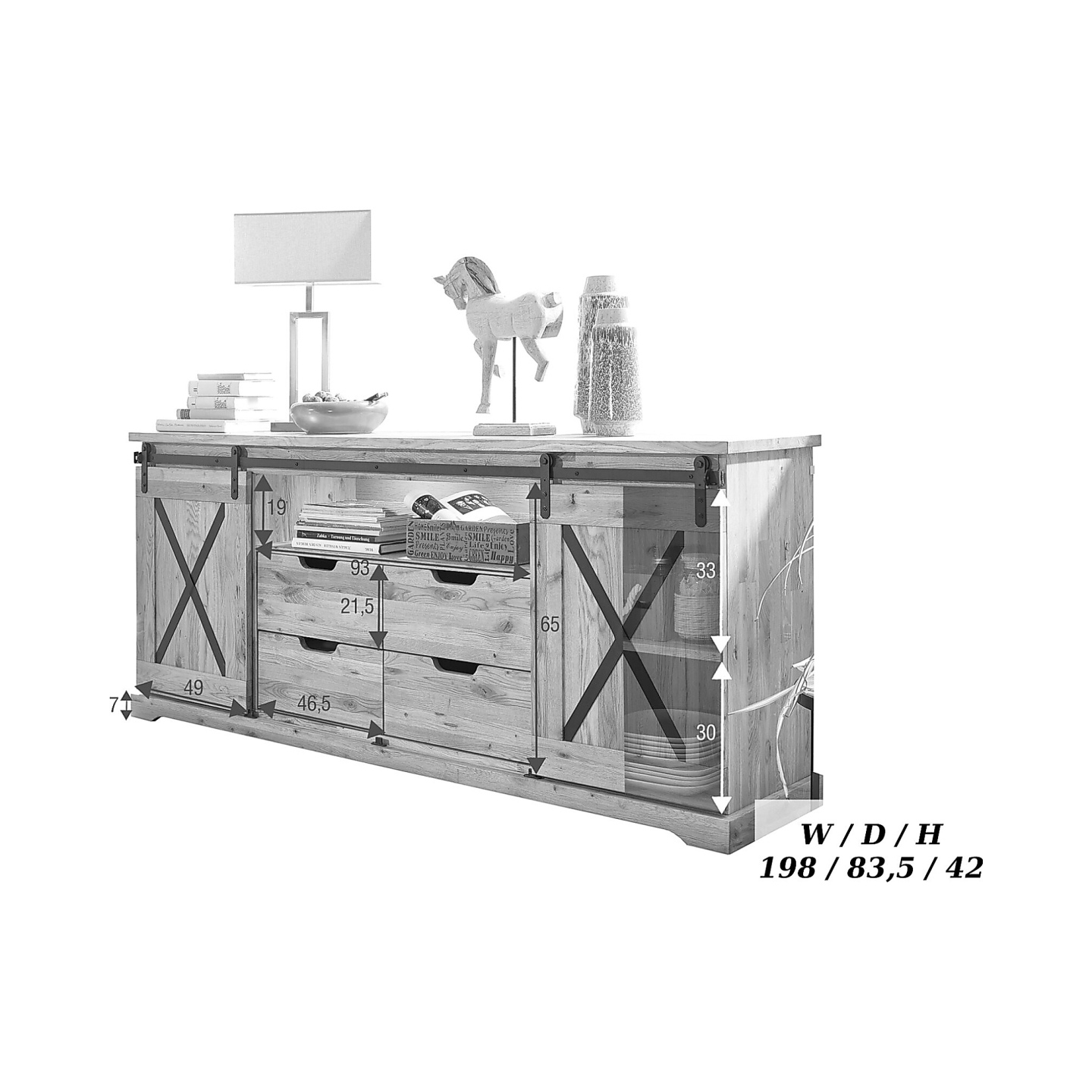 | Dodatkowe informacje | 4 szuflady i 2 szafki, metalowe znaki X i szyny, mebel zmontowany, cena nie zawiera oświetlenia |