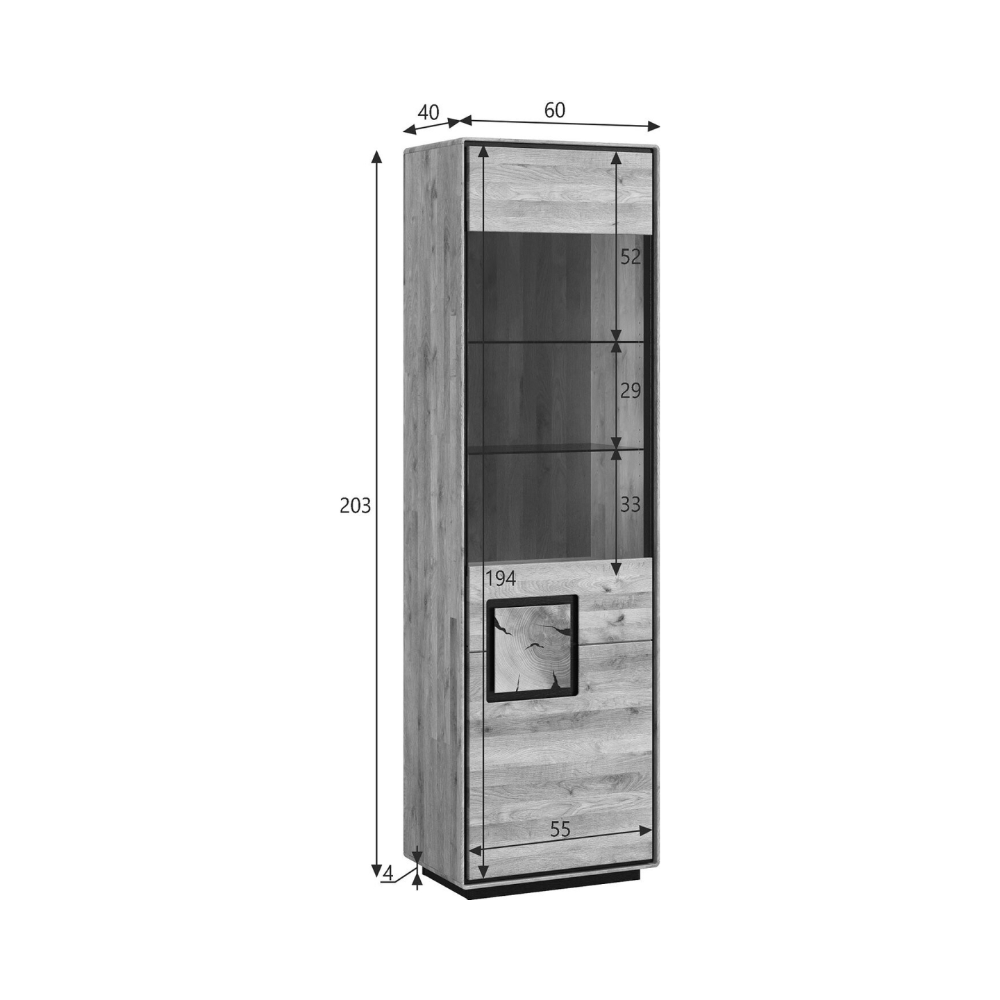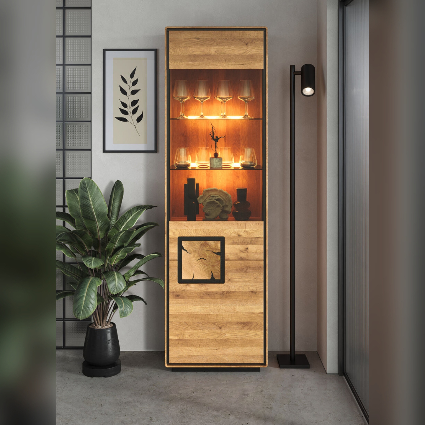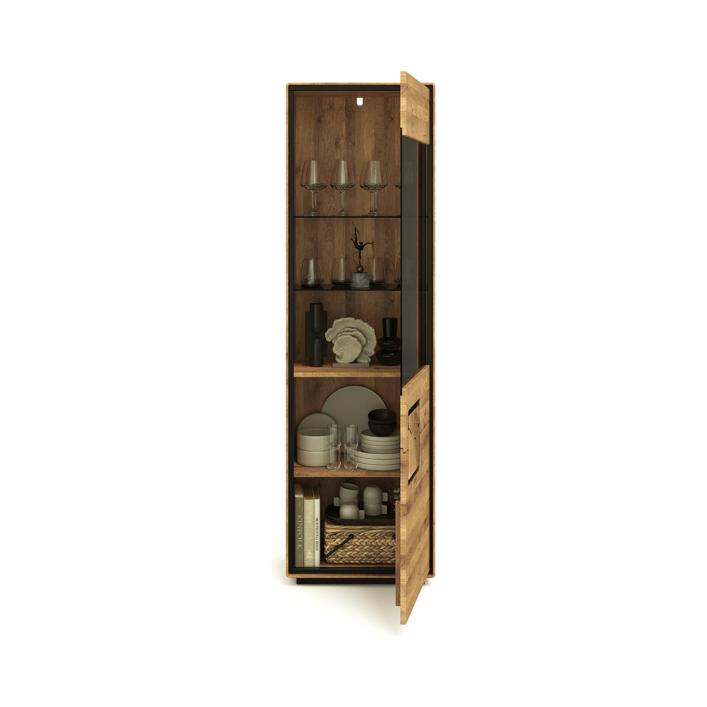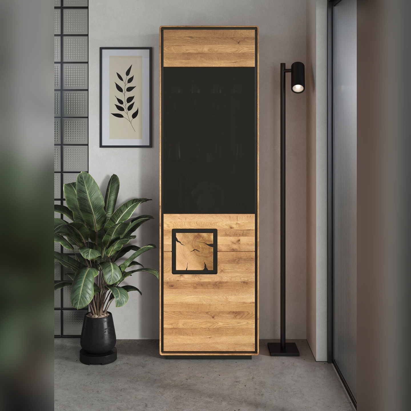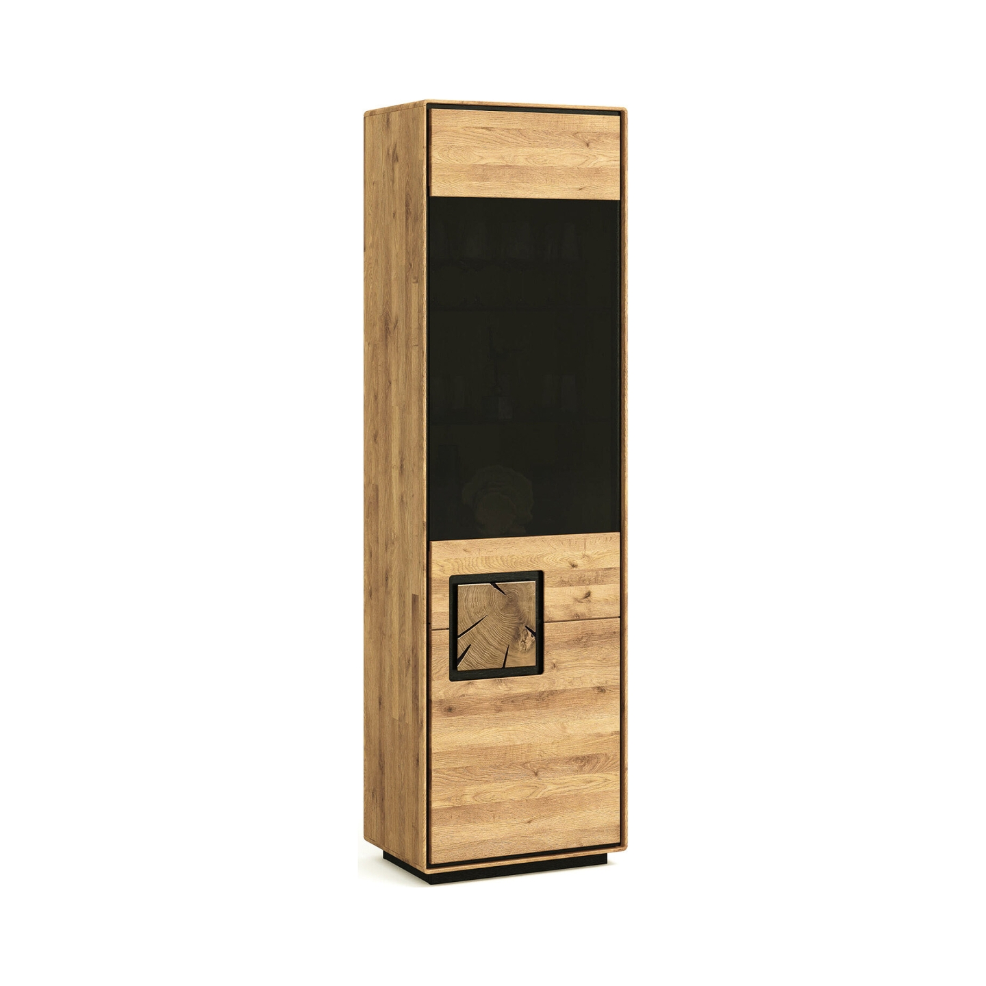 Wzbogać swój salon lub jadalnię o element nowoczesnej elegancji, jakim jest witryna dębowa I prawa Lunare. Ten zgrabny i wysoki mebel łączy solidność wykonania z litego drewna dębowego z wyrafinowanym designem. Przeszklenie wykonane z modnego szkła dymionego, zlokalizowane po prawej stronie, umożliwia subtelną ekspozycję Twoich dekoracji i cennych przedmiotów, dodając wnętrzu nowoczesnego charakteru. Wykończenie olejem (bezbarwnym lub czarnym) podkreśla głębię naturalnego drewna. Witryna o wysokości 203 cm i szerokości 60 cm jest idealna do mniejszych przestrzeni, zapewniając jednocześnie znaczną pojemność. Solidna konstrukcja, potwierdzona wagą 71,4 kg, oraz zastosowanie systemu cichego domyku gwarantują długotrwałe i komfortowe użytkowanie. Mebel jest dostarczany w całości zmontowany.