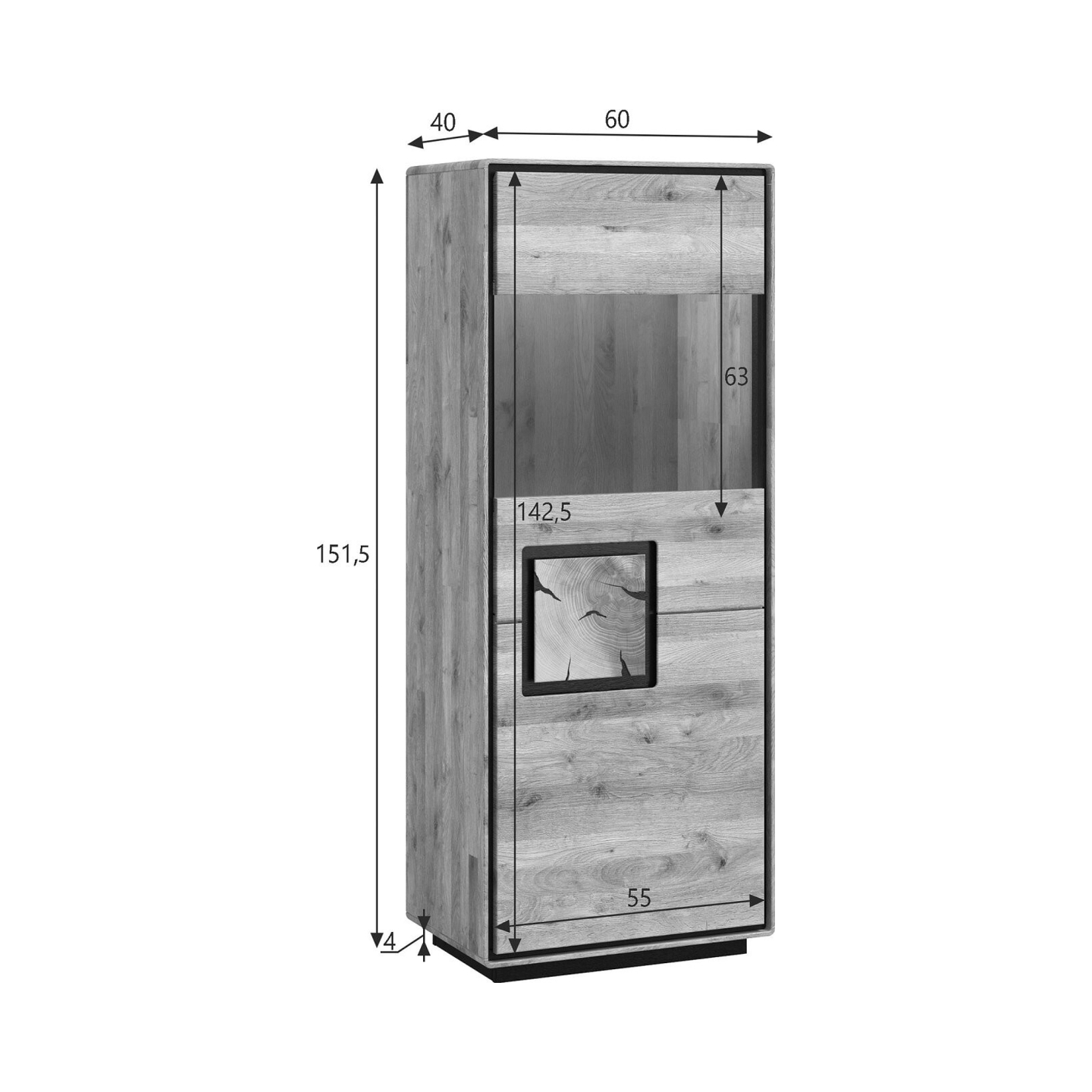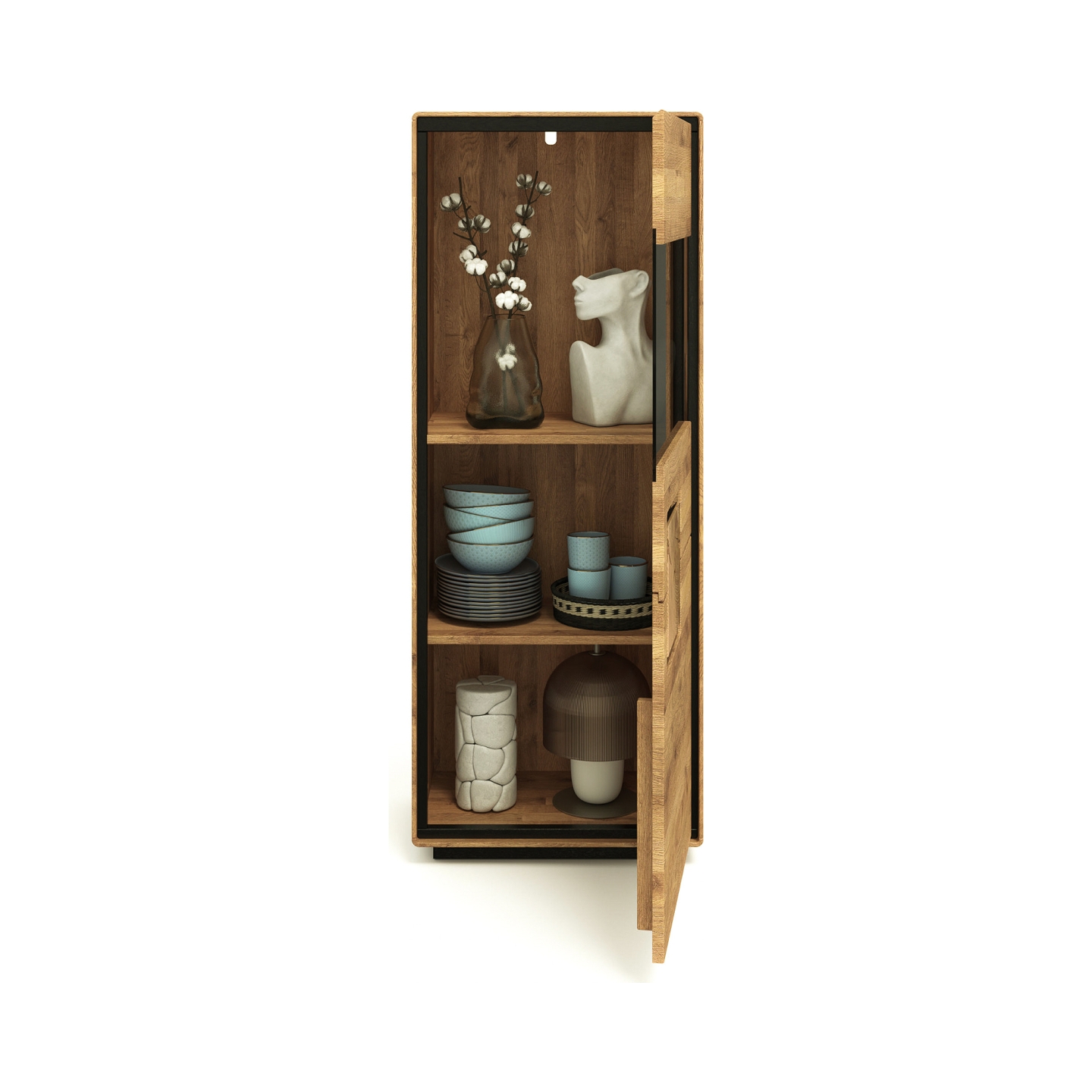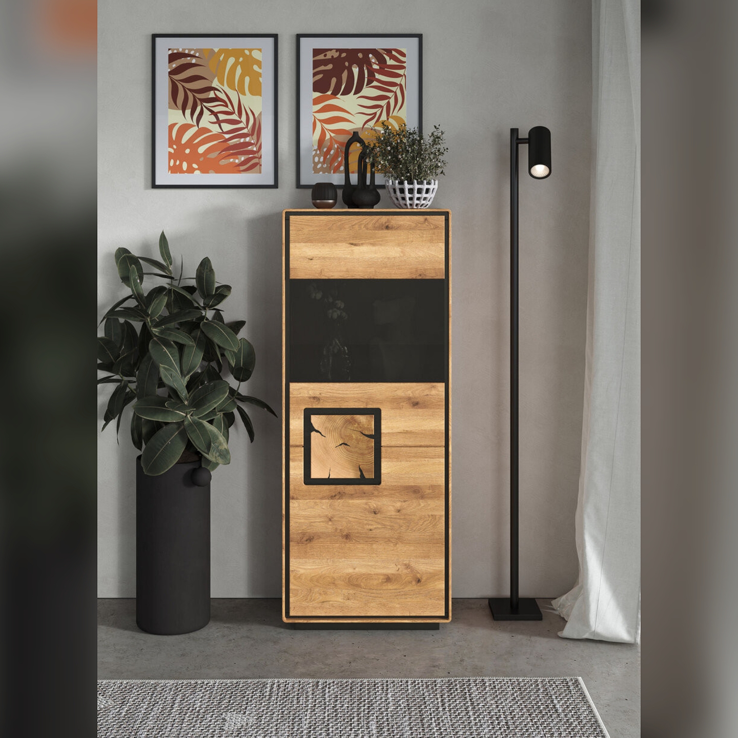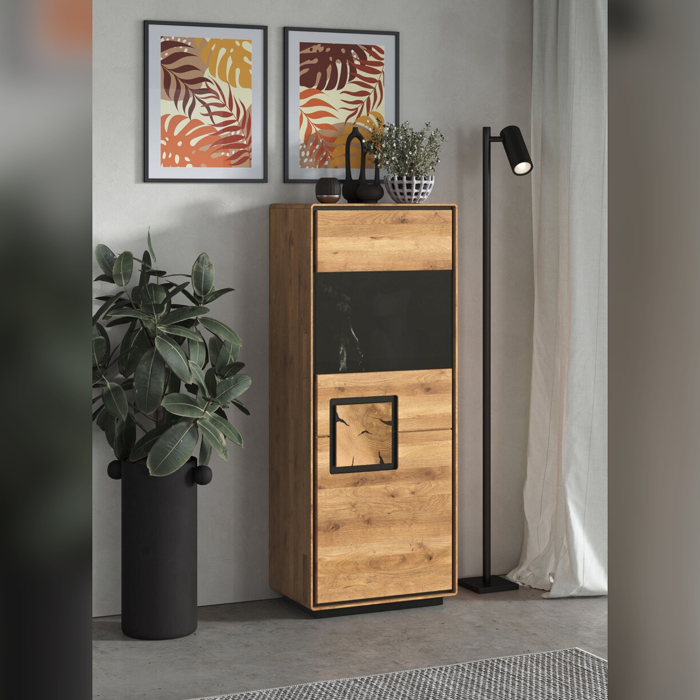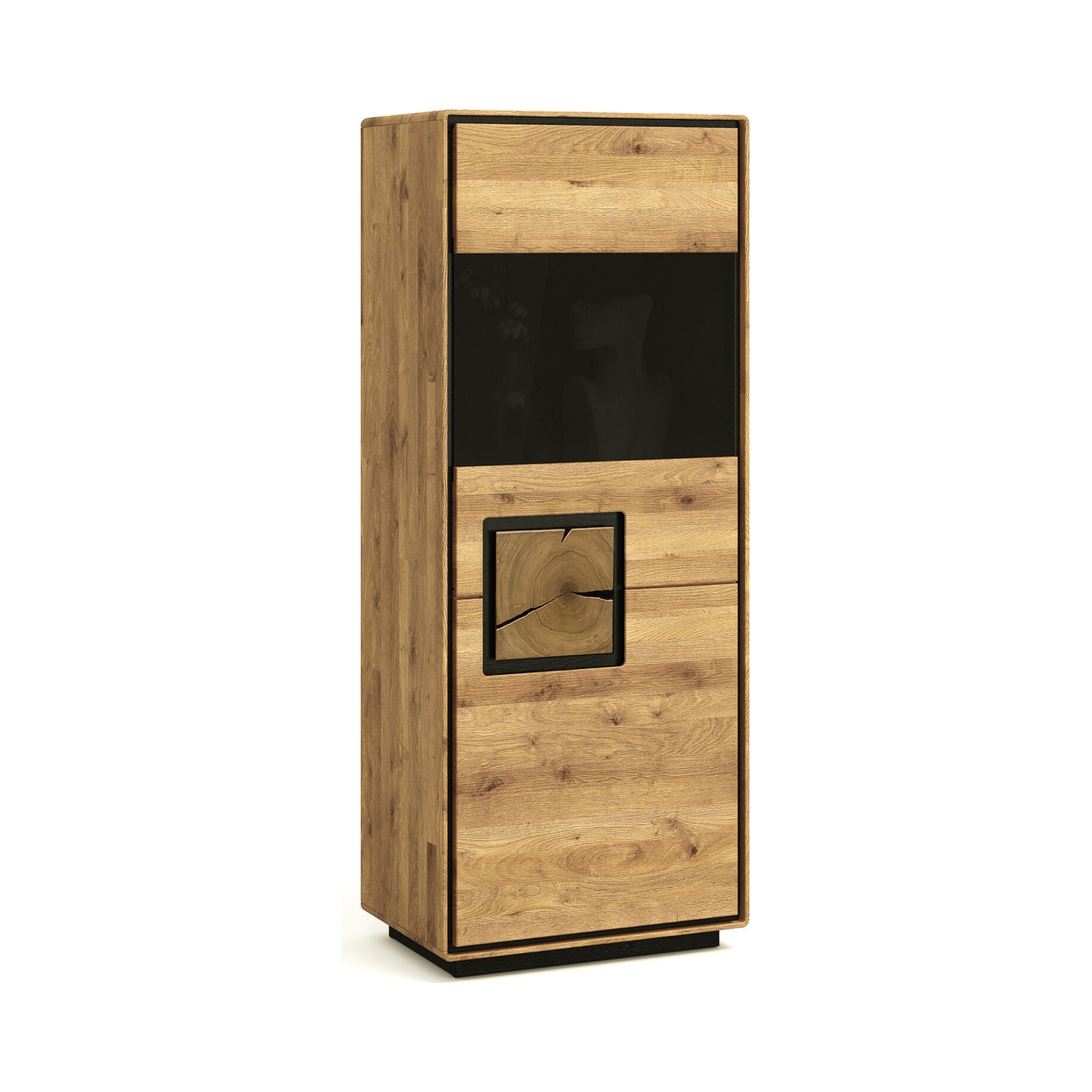 Wybierz Kredens Dębowy I Prawy Lunare – kompaktowy mebel (szerokość 60 cm) z przeszkleniem z dymionego szkła, idealny do mniejszych przestrzeni. Wykończenie olejem bezbarwnym i czarnym podkreśla elegancję drewna, dodając mu nowoczesnego charakteru. Kredens ten łączy funkcjonalność i estetykę, stając się ozdobą każdego wnętrza. Mebel jest wykonany z litego dębu, charakteryzuje się niewidocznymi uchwytami (frez od góry drzwiczek) oraz cichym domykiem w drzwiach. Kredens jest solidny (waga 53,1 kg) i dostarczany w całości zmontowany. Cena nie zawiera oświetlenia.