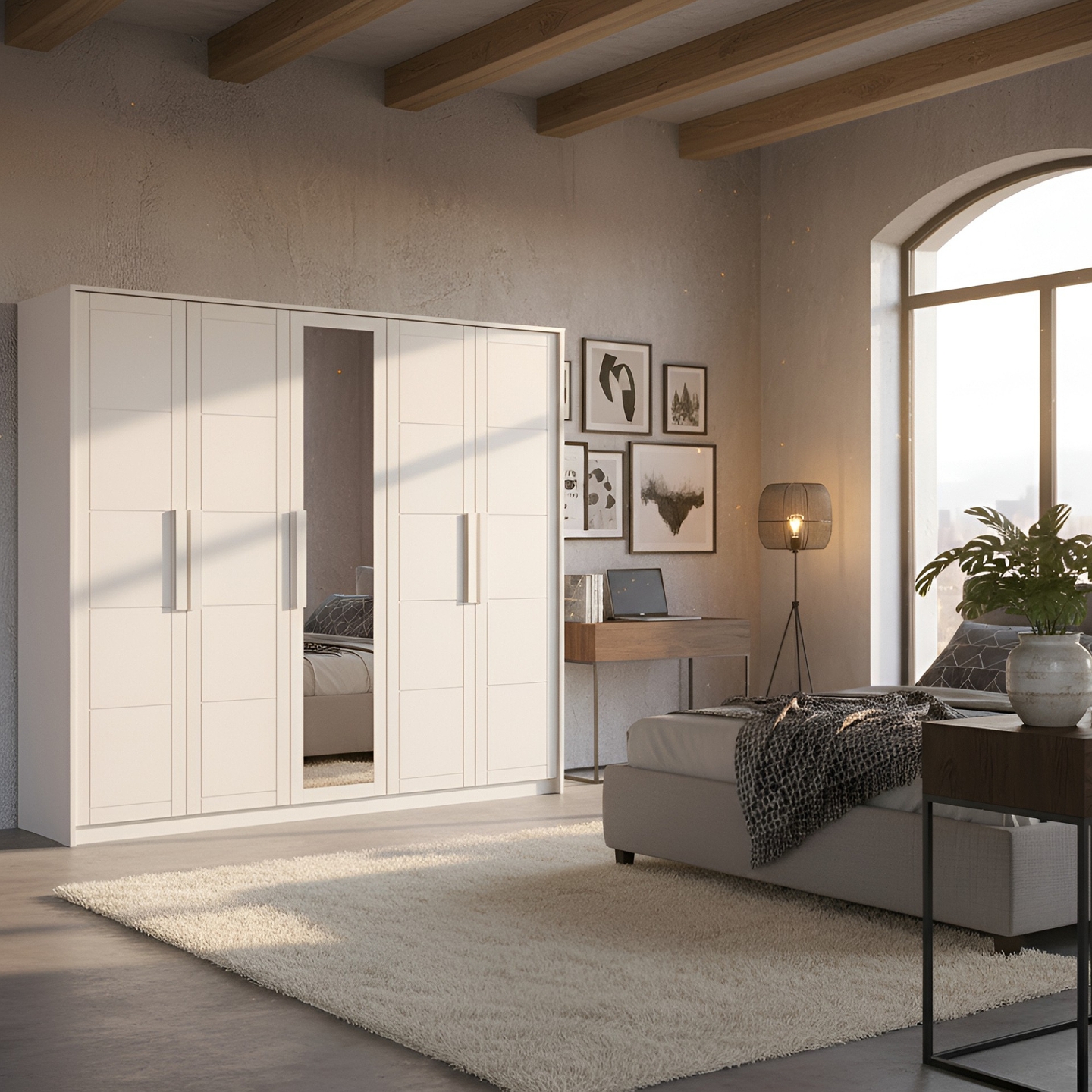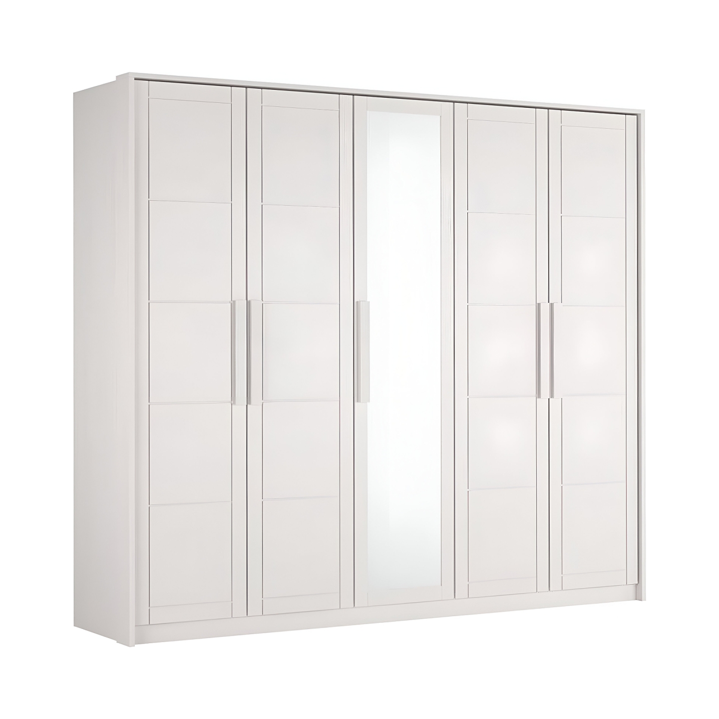 Wprowadź do swojej sypialni elegancję i funkcjonalność dzięki białej szafie bukowej Timo V. Ten imponujący mebel o szerokości ponad 250 cm to idealne rozwiązanie dla osób poszukujących maksymalnej przestrzeni do przechowywania, bez kompromisów w kwestii stylu. Szafa, wykonana z trwałego drewna bukowego i pokryta eleganckim, białym lakierem kryjącym, wniesie do wnętrza poczucie lekkości i nowoczesności. Charakterystyczne kasetonowe fronty oraz duże lustro na środkowym panelu (widoczne na zdjęciu) nie tylko ułatwiają codzienne przygotowania, ale także optycznie powiększają i rozjaśniają przestrzeń. Masywna konstrukcja na bazie naturalnego drewna gwarantuje długowieczność i stabilność, co wyróżnia ten model na tle standardowych szaf z płyty.