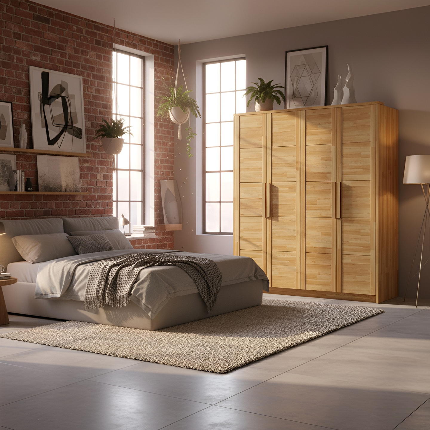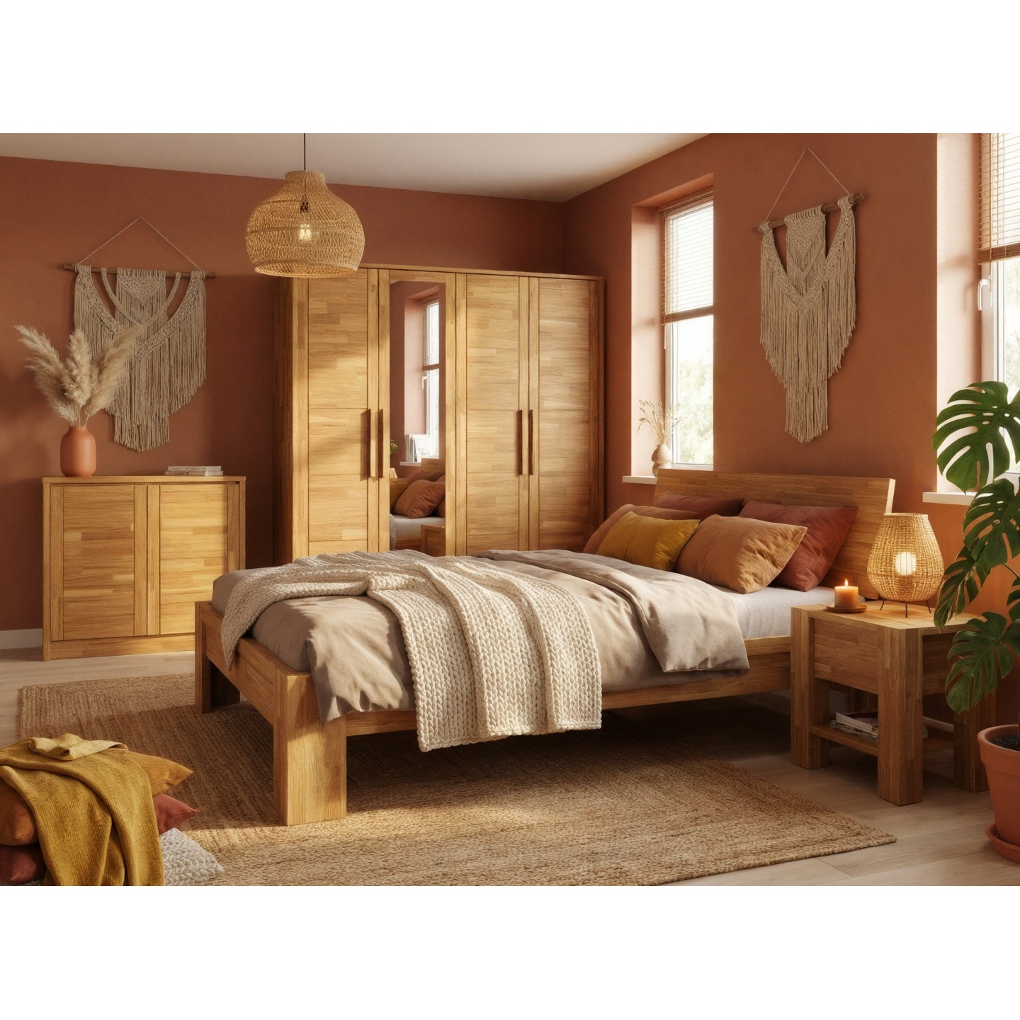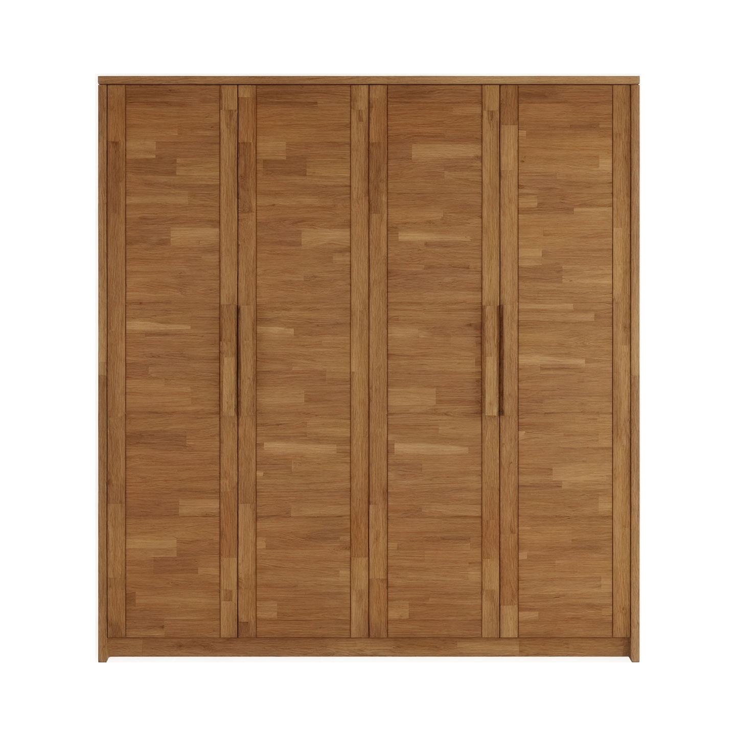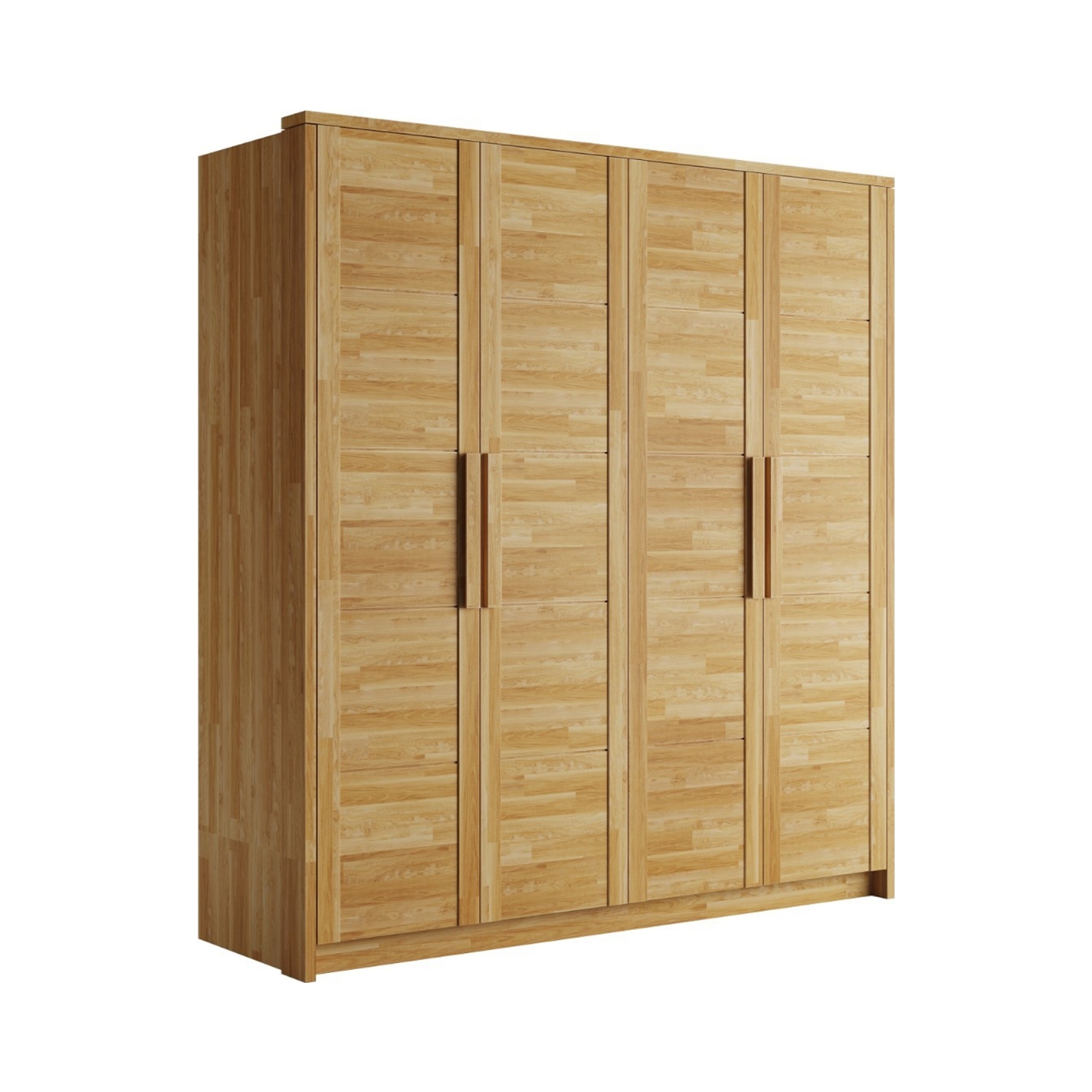 Zadbaj o porządek i naturalny urok w swojej sypialni dzięki szafie dębowej Timo IV. Ten czterodrzwiowy model o szerokości 203 cm to synonim solidności i ponadczasowego designu. Wykonana z wysokiej jakości drewna dębowego, mebel charakteryzuje się unikalną strukturą frontów, stworzoną z klejonych dębowych lameli (jak widać na zdjęciu), co nadaje mu rustykalny, a zarazem nowoczesny charakter. Wykończenie olejowaniem nie tylko pogłębia naturalny, ciepły odcień dębu, ale także doskonale chroni powierzchnię. Dzięki imponującej wysokości 220 cm i głębokości 65 cm, dębowa szafa Timo IV oferuje przestronną, wygodną przestrzeń do przechowywania całej garderoby, idealnie pasując do stylu loftowego, industrialnego czy skandynawskiego.