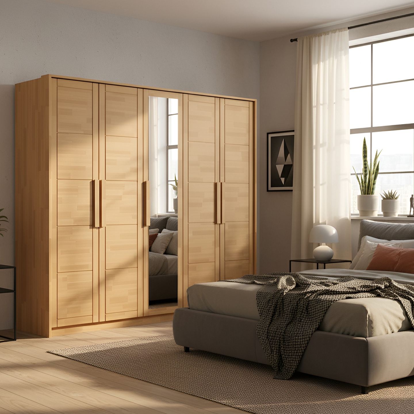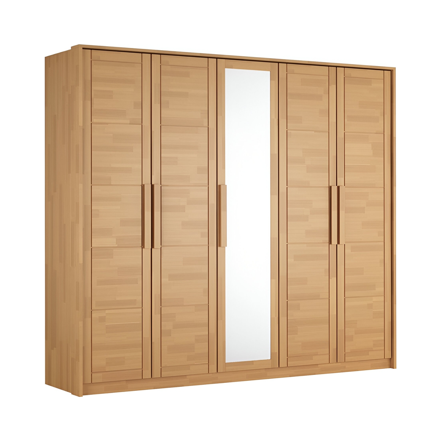 Zapewnij swojej sypialni zarówno ciepło naturalnego drewna, jak i niezrównaną funkcjonalność dzięki szafie bukowej Timo V z lustrem. Ten imponujący, sześciodrzwiowy mebel o szerokości ponad 250 cm to idealne rozwiązanie do przestronnej garderoby, łączące solidność wykonania z eleganckim designem. Szafa została wykonana z wysokogatunkowego drewna bukowego, wykończonego bezbarwnym lakierem, który chroni powierzchnię, jednocześnie wydobywając i podkreślając piękny, naturalny rysunek słojów (widoczny na załączonym zdjęciu frontów z klejonych lameli). Centralnie umieszczone, wysokie lustro na drzwiach nie tylko ułatwia codzienne ubieranie, ale również optycznie powiększa i rozjaśnia pomieszczenie. Bukowa szafa Timo V to inwestycja, która łączy praktyczną organizację przestrzeni z ponadczasową estetyką litego drewna.