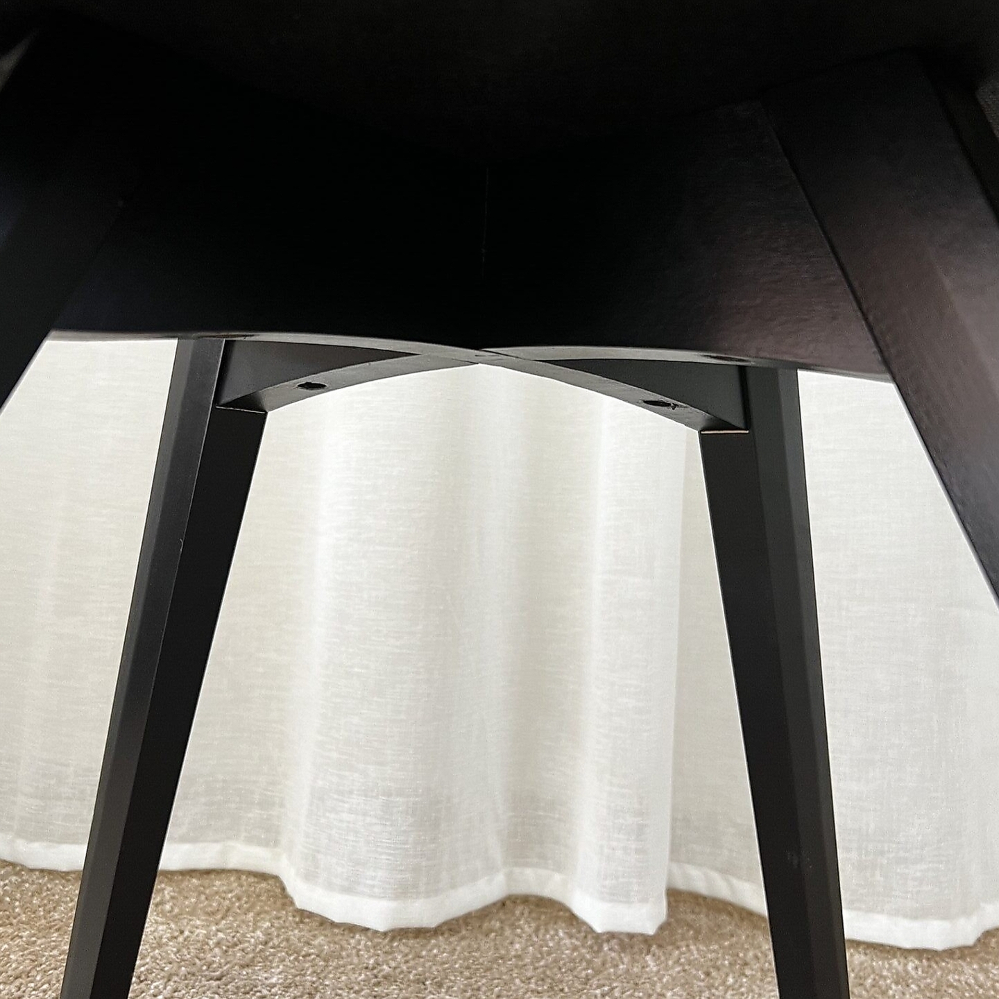 Solidna Konstrukcja: Krzesło wspiera się na stabilnych, drewnianych nogach w kolorze czarnym, co zapewnia trwałość i bezpieczeństwo użytkowania.