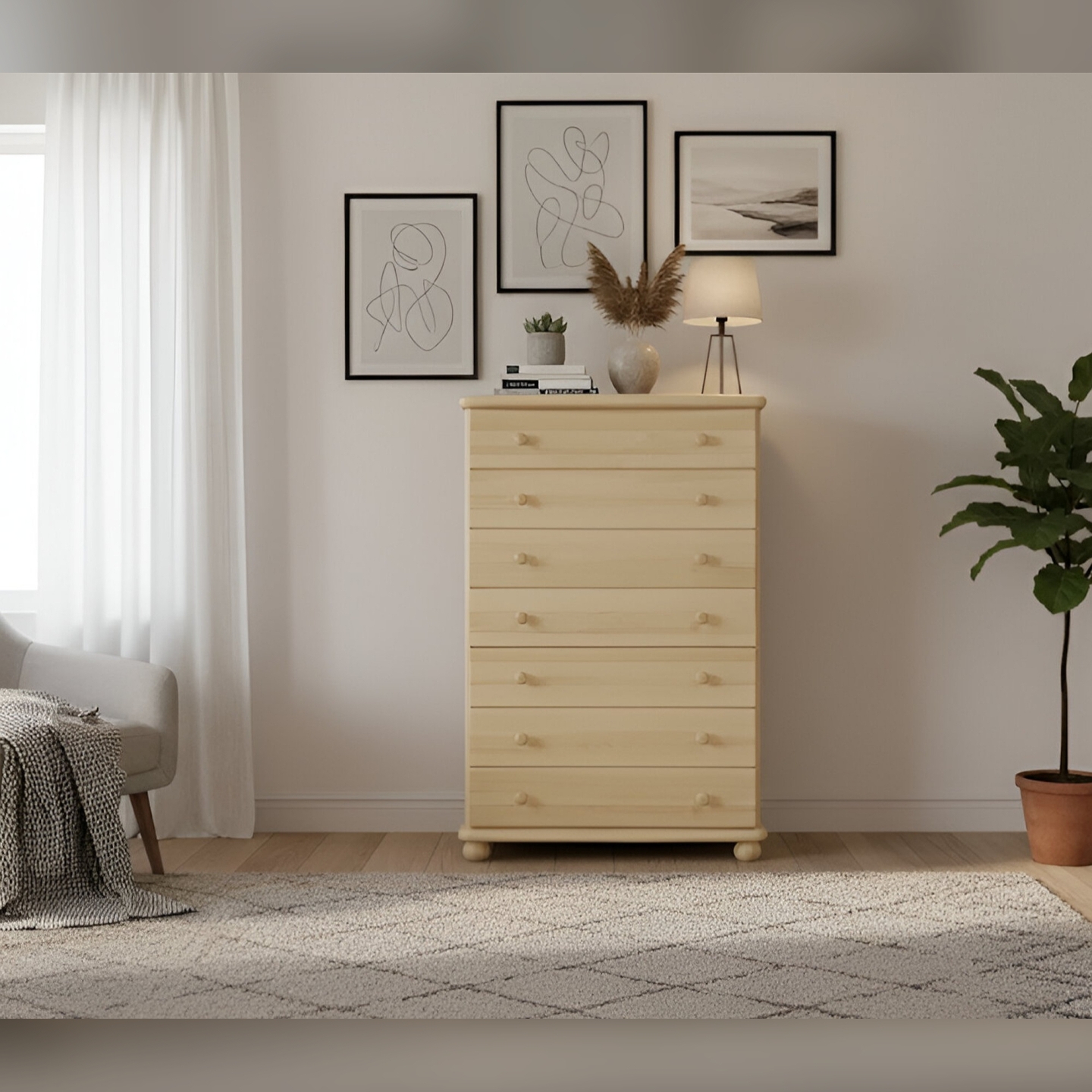 Ta drewniana komoda z szufladami to idealny wybór dla osób, dla których priorytetem jest solidność, naturalne materiały i maksymalna organizacja. Jest to wysoka komoda (powyżej 120 cm), która doskonale sprawdzi się jako główny mebel do przechowywania odzieży w sypialni lub garderobie. Konstrukcja z litego drewna sosnowego, wykończona lakierem bezbarwnym, przyczynia się do zdrowego mikroklimatu w Twoim domu. Mebel jest dostarczany w paczkach, w elementach, wraz z kompletnym zestawem okuć i przejrzystą instrukcją do samodzielnego montażu. Postaw na polskie rzemiosło i ciesz się funkcjonalnością, którą oferuje ta piękna i pojemna komoda, zachowując naturalny i ponadczasowy wygląd drewna.