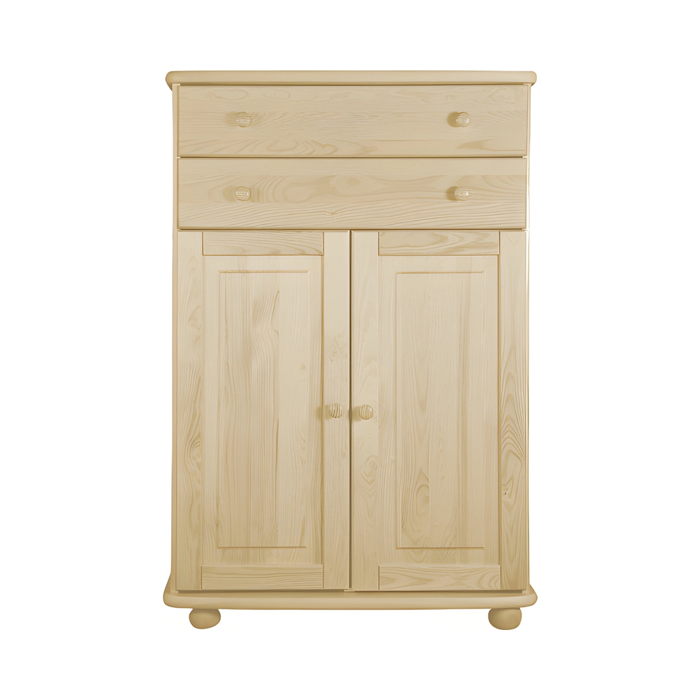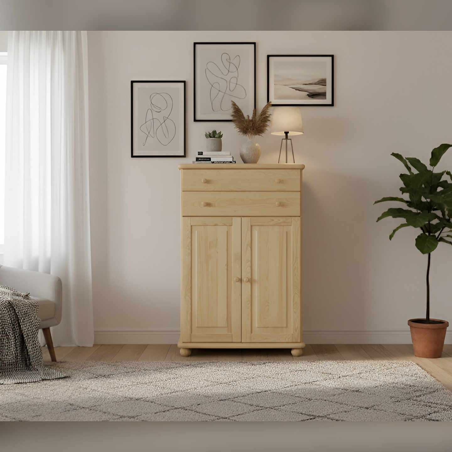 Szukasz kompaktowej, ale pojemnej komody drewnianej, która wniesie ciepło i naturalny styl do Twojego wnętrza? Ta solidna komoda sosnowa z drzwiami i szufladami to idealne połączenie funkcjonalności i estetyki. Mebel jest wykonany w całości z drewna sosnowego, z frontami z bezsęcznego materiału, co gwarantuje długowieczność. Wykończenie **lakierem bezbarwnym** subtelnie zabezpiecza powierzchnię, jednocześnie w pełni eksponując piękny i autentyczny rysunek słojów. Przy wymiarach **85 cm szerokości** i **125 cm wysokości**, jest to optymalny mebel do sypialni, który maksymalizuje przestrzeń do przechowywania.