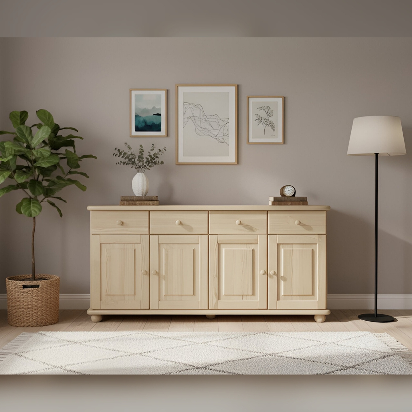 Ta drewniana komoda niska to doskonały wybór dla osób ceniących sobie solidność, naturalne materiały i przemyślane rozwiązania. Jej szeroki blat doskonale nadaje się do eksponowania dekoracji, a zróżnicowane wnętrze pozwala na łatwe uporządkowanie wielu przedmiotów. Konstrukcja z litego drewna sosnowego, wykończona lakierem bezbarwnym, jest gwarancją trwałości i zdrowego mikroklimatu w Twoim domu. Mebel jest dostarczany w paczkach, w elementach, wraz z kompletnym zestawem okuć i przejrzystą instrukcją do samodzielnego montażu. Postaw na polskie rzemiosło i ciesz się funkcjonalnością, którą oferuje ta piękna i pojemna komoda, zachowując naturalny i ponadczasowy wygląd drewna.
