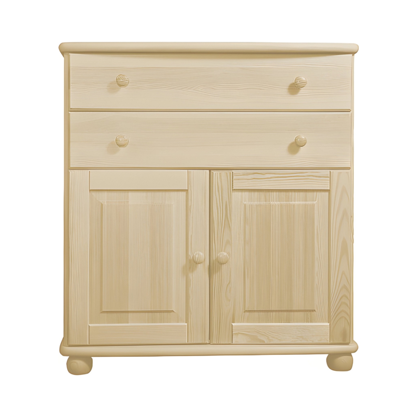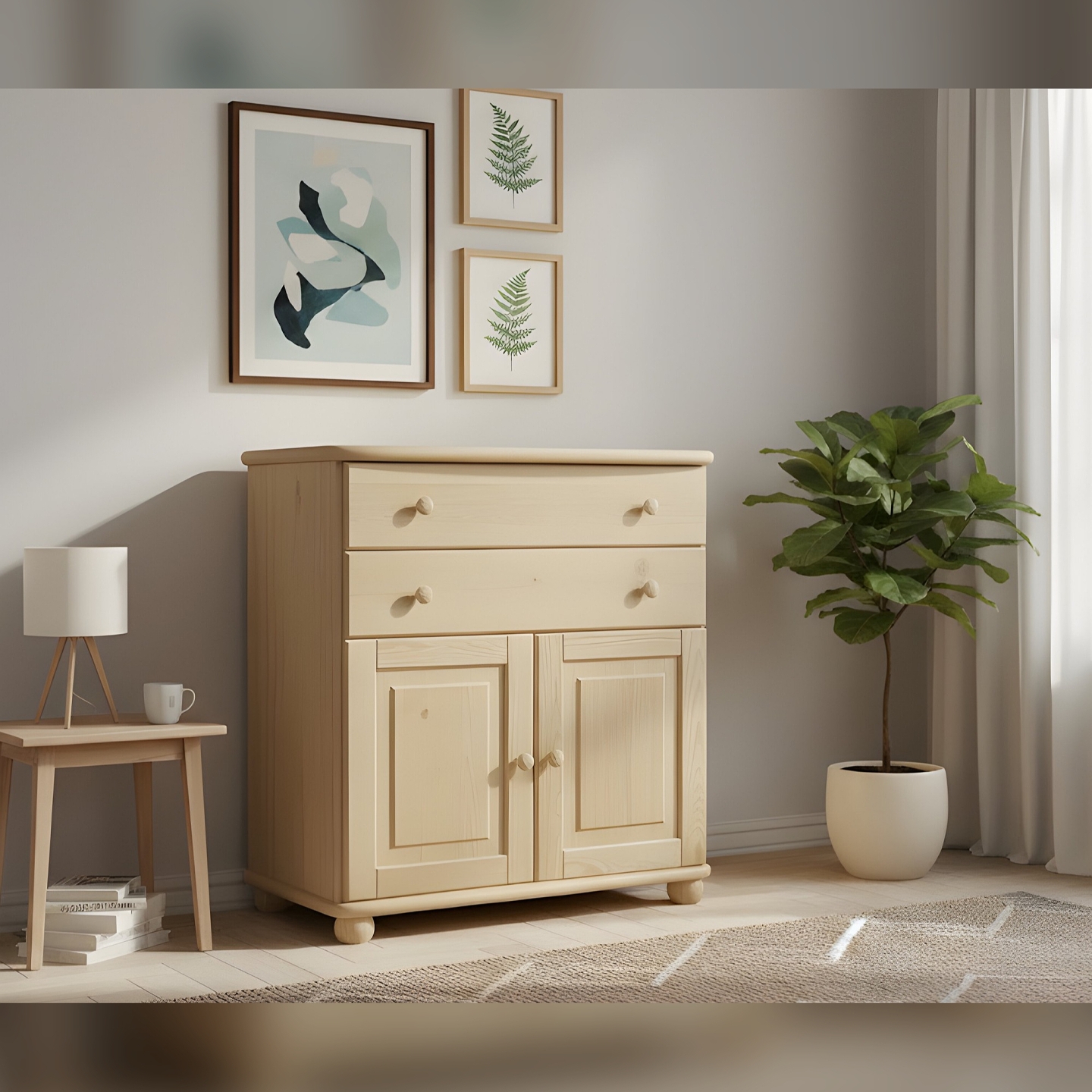 Komoda sosnowa z drzwiami i szufladami – kompaktowa i funkcjonalna w lakierze bezbarwnym