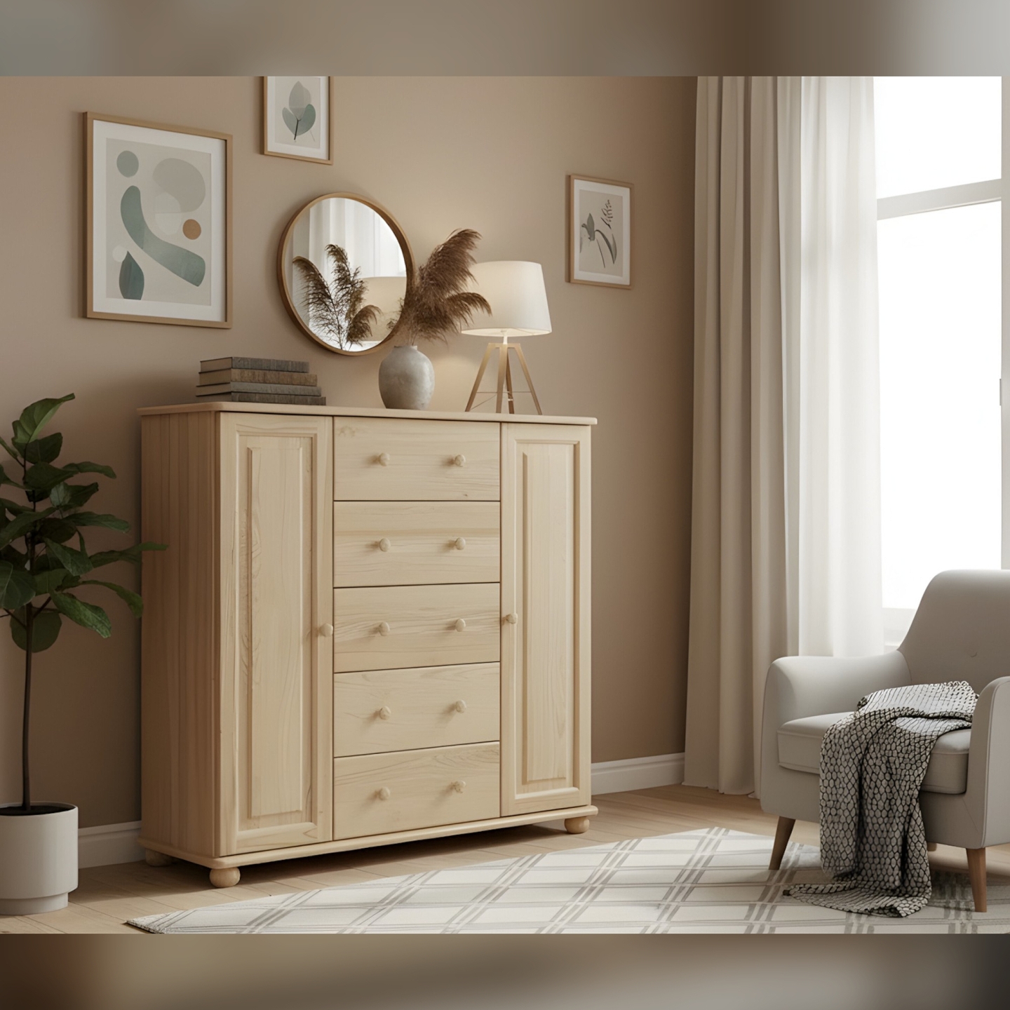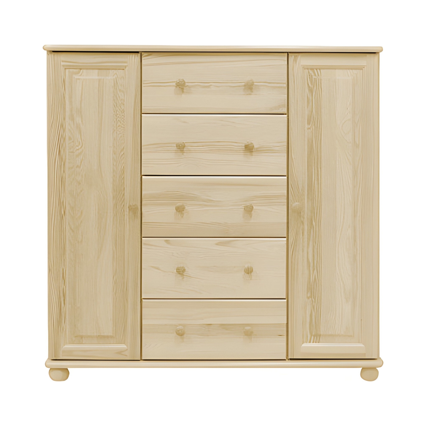 Szukasz przestronnej i solidnej komody drewnianej, która maksymalnie wykorzysta wysokość pomieszczenia? Prezentujemy wysoką komodę sosnową z drzwiami i szufladami, idealną do sypialni. Mebel ten został wykończony lakierem bezbarwnym, który doskonale zabezpiecza drewno, jednocześnie wydobywając jego naturalny, ciepły odcień. Komoda jest wykonana w całości z drewna sosnowego, z bezsęcznych frontów, co gwarantuje jej niezawodną trwałość. Z wymiarami 118 cm szerokości i 122 cm wysokości (powyżej 120 cm), zapewnia maksymalną pojemność w układzie pionowym.