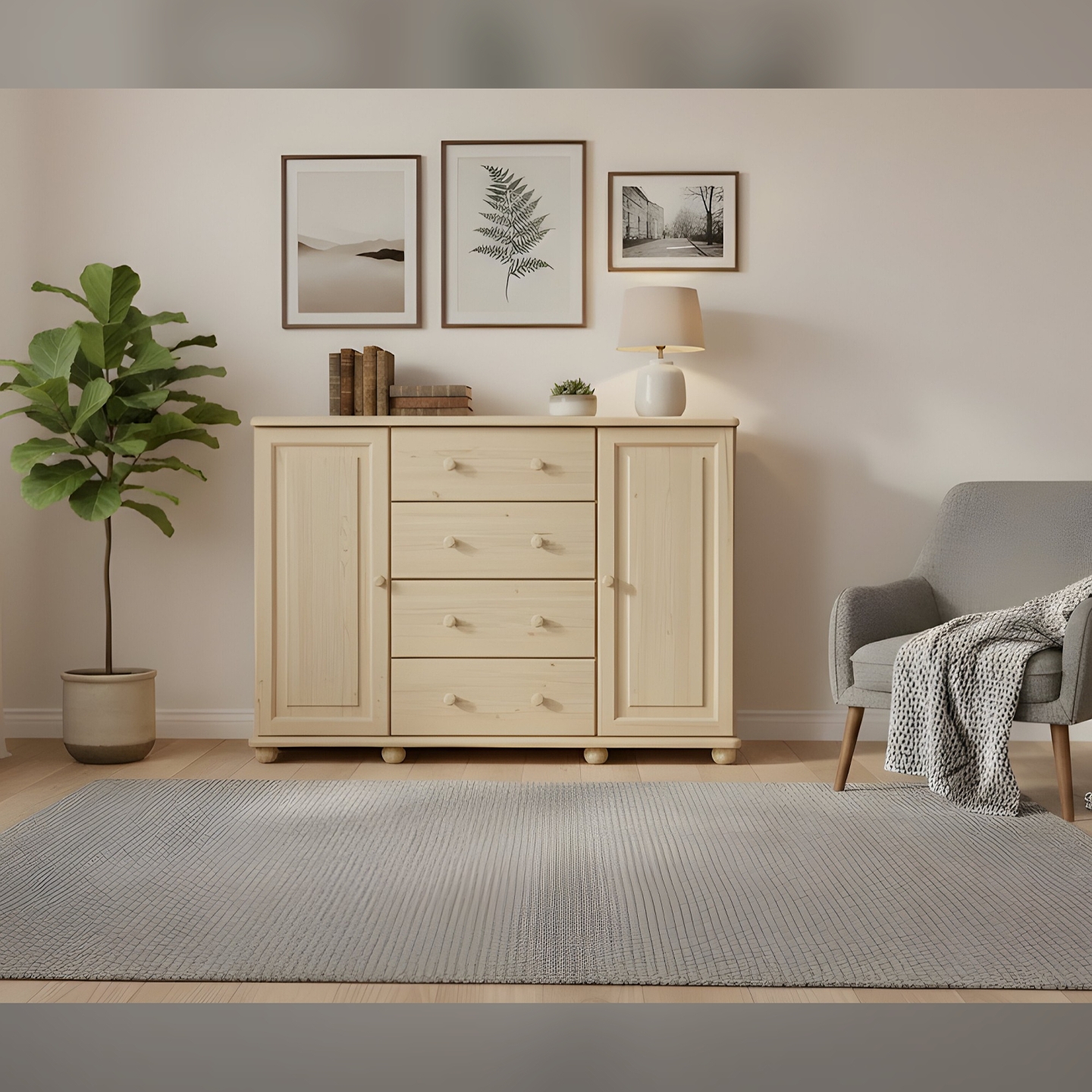Szukasz szerokiej i pojemnej komody drewnianej o idealnej wysokości do salonu lub sypialni? Prezentujemy komodę sosnową z drzwiami i szufladami, która łączy naturalne piękno drewna z dużą funkcjonalnością. Mebel jest wykonany w całości z drewna sosnowego, z bezsęcznych frontów, co gwarantuje jego niezawodną trwałość. Wykończenie lakierem bezbarwnym doskonale zabezpiecza powierzchnię, jednocześnie wydobywając autentyczny rysunek słojów. Z wymiarami 136 cm szerokości i 100 cm wysokości, komoda ta zapewnia komfortowy dostęp do przechowywanych przedmiotów.