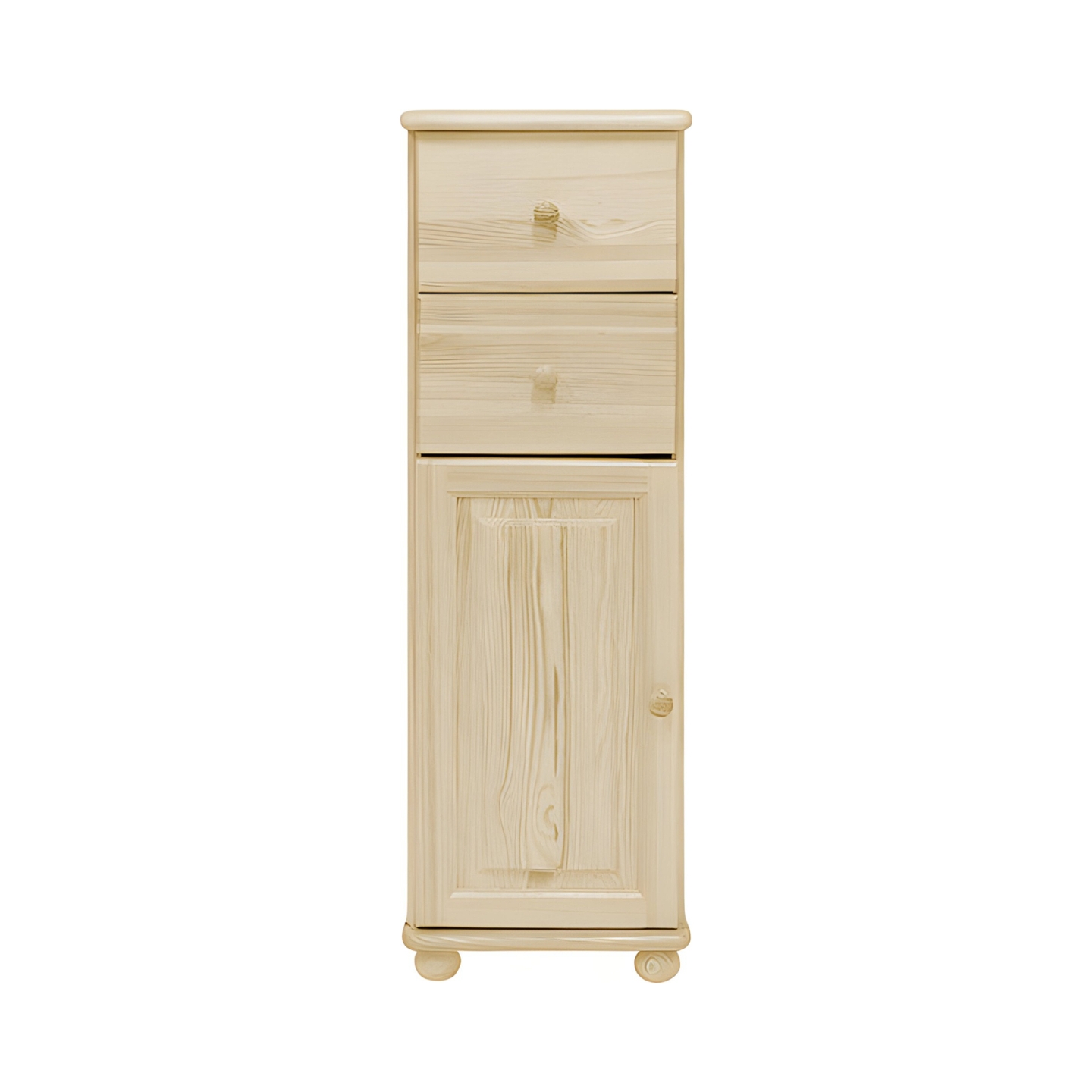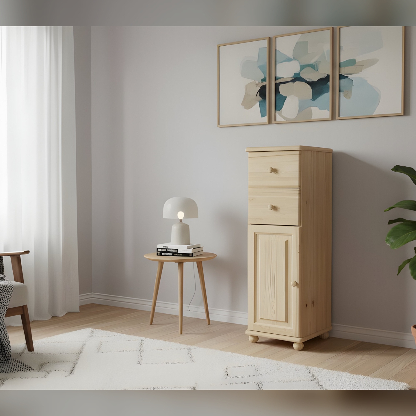 Poszukujesz maksymalnej pojemności i zróżnicowanej organizacji przy minimalnej szerokości? Prezentujemy słupek sosnowy z szufladami i drzwiami – wyjątkowo wąską, ale wysoką komodę drewnianą, która łączy zalety bieliźniarki i słupka. Mebel ten został wykończony lakierem bezbarwnym, który doskonale zabezpiecza drewno, jednocześnie eksponując jego naturalny, ciepły odcień. Komoda jest wykonana w całości z drewna sosnowego, z bezsęcznych frontów, co gwarantuje jej niezawodną trwałość. Z wymiarami 40 cm szerokości i 122 cm wysokości, stanowi mistrzowskie rozwiązanie do pionowej organizacji w sypialni, łazience lub garderobie.