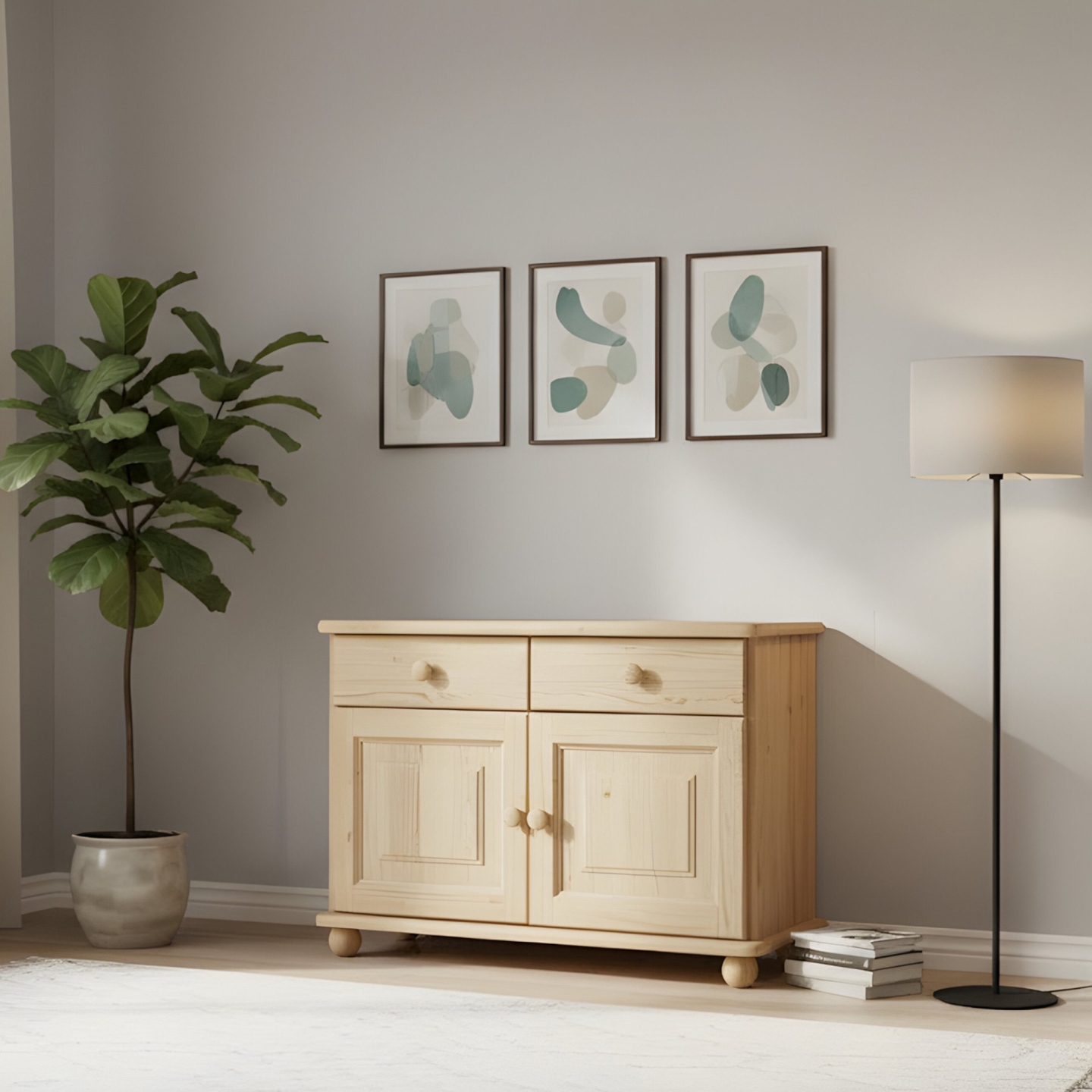 Szukasz szerokiej i niskiej komody drewnianej, która idealnie sprawdzi się w wąskim pomieszczeniu? Prezentujemy płytką komodę sosnową z drzwiami i szufladami. Mebel ten został wykończony lakierem bezbarwnym, który doskonale zabezpiecza drewno, jednocześnie eksponując jego naturalny, ciepły odcień. Komoda jest wykonana w całości z drewna sosnowego, z bezsęcznych frontów, co gwarantuje jej niezawodną trwałość. Z wymiarami 80 cm szerokości i 35 cm głębokości, zapewnia dużą pojemność, nie zajmując wiele miejsca w przejściu.