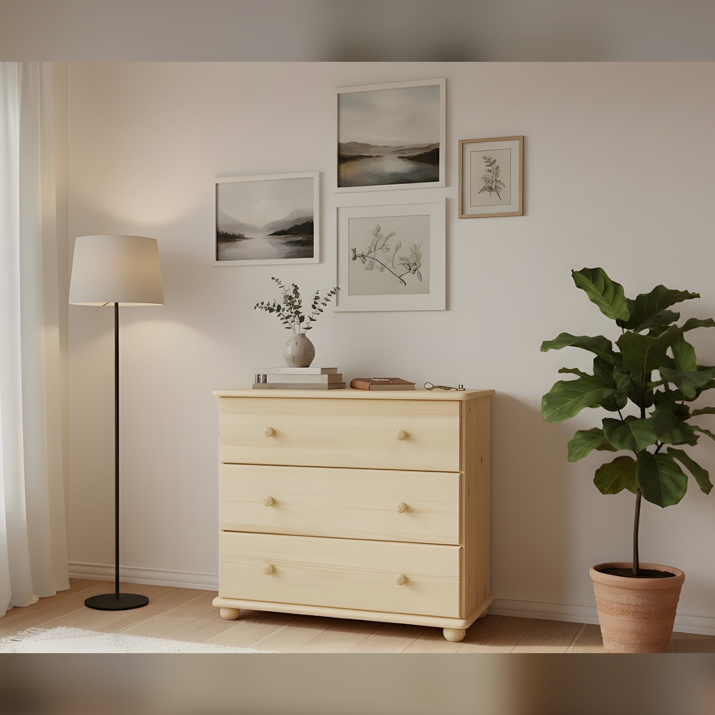 | Materiał wykonania | Drewno sosnowe (fronty bezsęczne, korpus), płyta pilśniowa (tyły i dna szuflad) |
