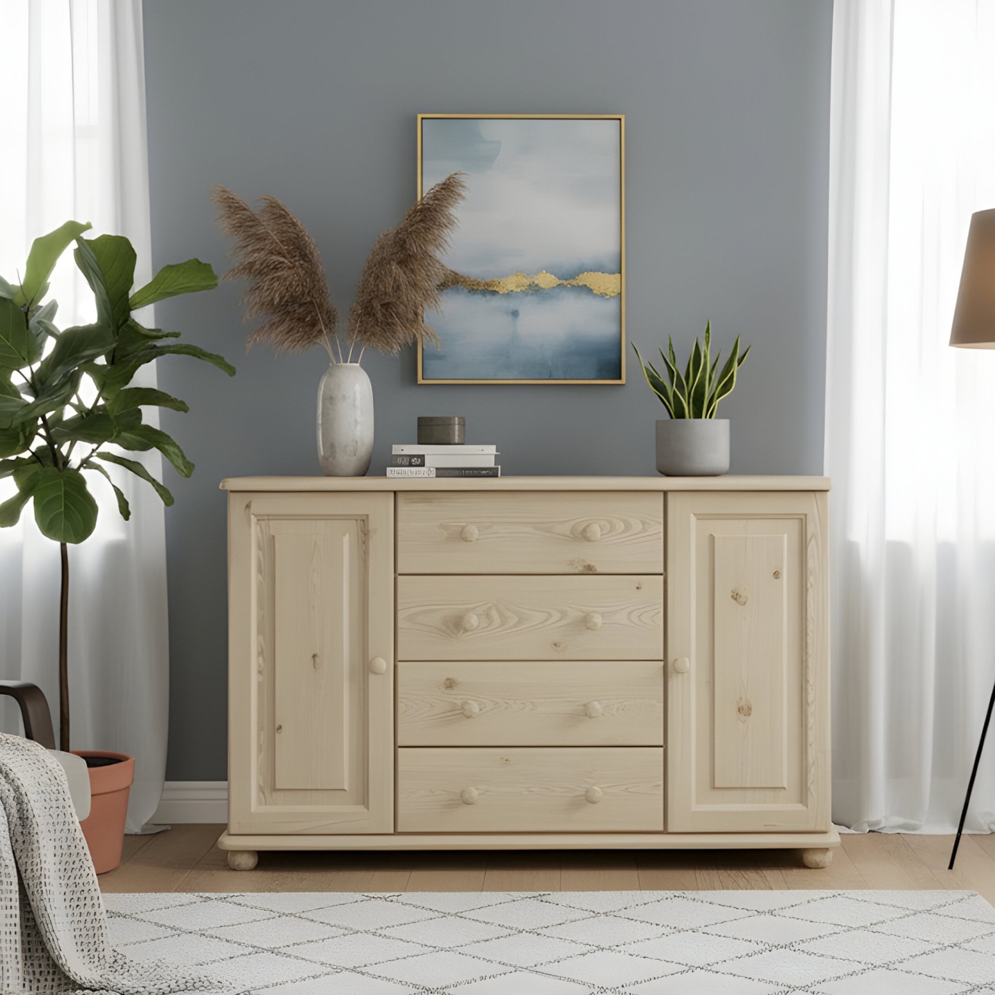 Szukasz dużej, pojemnej i solidnej komody drewnianej, która pomieści całą Twoją garderobę lub zastawę stołową? Prezentujemy szeroką komodę sosnową z drzwiami i szufladami. Mebel ten został wykończony lakierem bezbarwnym, który doskonale zabezpiecza drewno, jednocześnie eksponując jego naturalny, ciepły odcień. Komoda jest wykonana w całości z drewna sosnowego, z bezsęcznych frontów, co gwarantuje jej niezawodną trwałość. Z wymiarami 118 cm szerokości i 78 cm wysokości, oferuje maksymalną przestrzeń do przechowywania przy optymalnej wysokości blatu.
