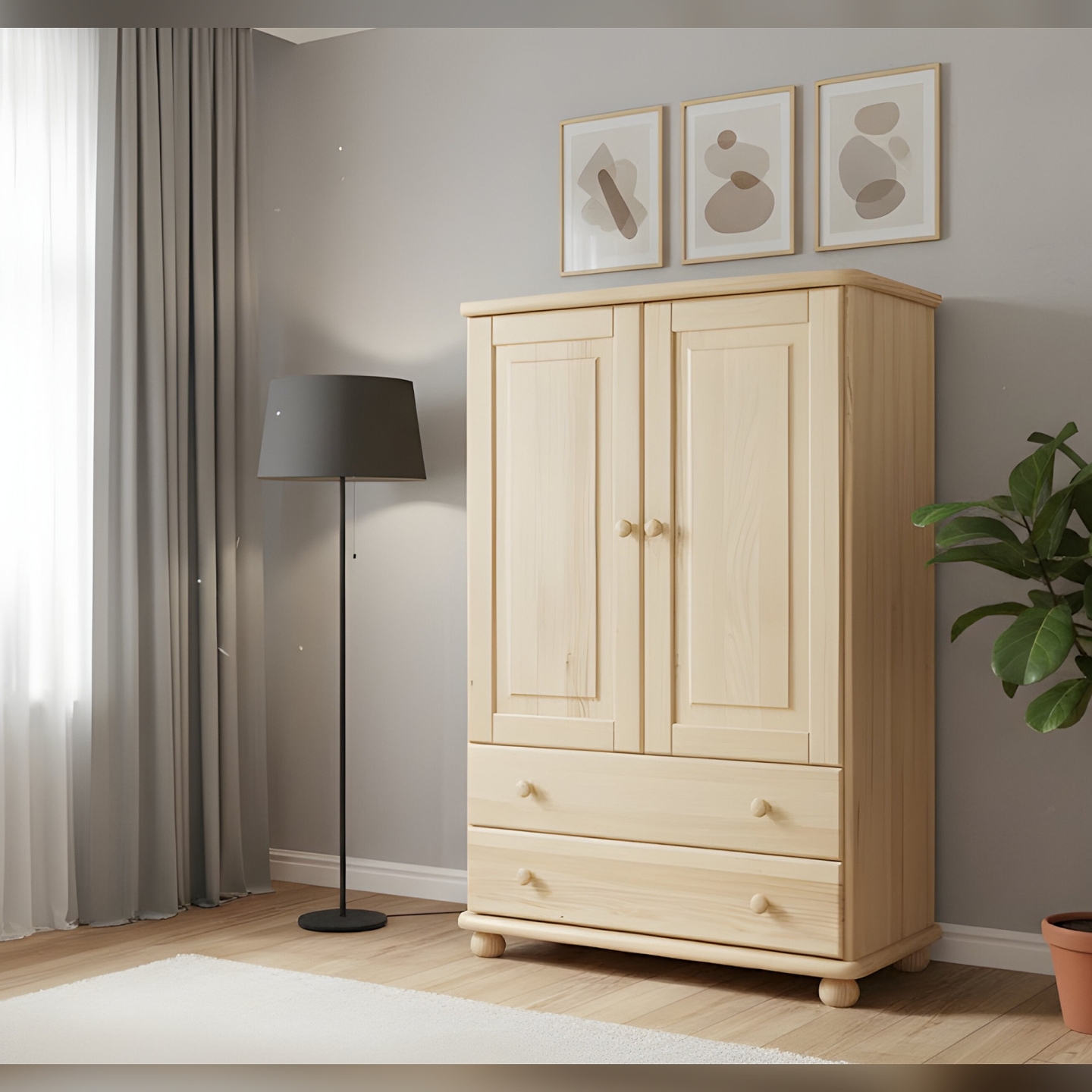 Szukasz wysokiej i pojemnej komody drewnianej, która łączy funkcjonalność szuflad i zamkniętej szafki? Prezentujemy wysoką komodę sosnową z drzwiami i szufladami. Mebel ten został wykonany w całości z litego drewna sosnowego, wykończonego lakierem bezbarwnym. Wysokość 125 cm oraz szerokość 85 cm pozwalają maksymalnie wykorzystać przestrzeń pionową.