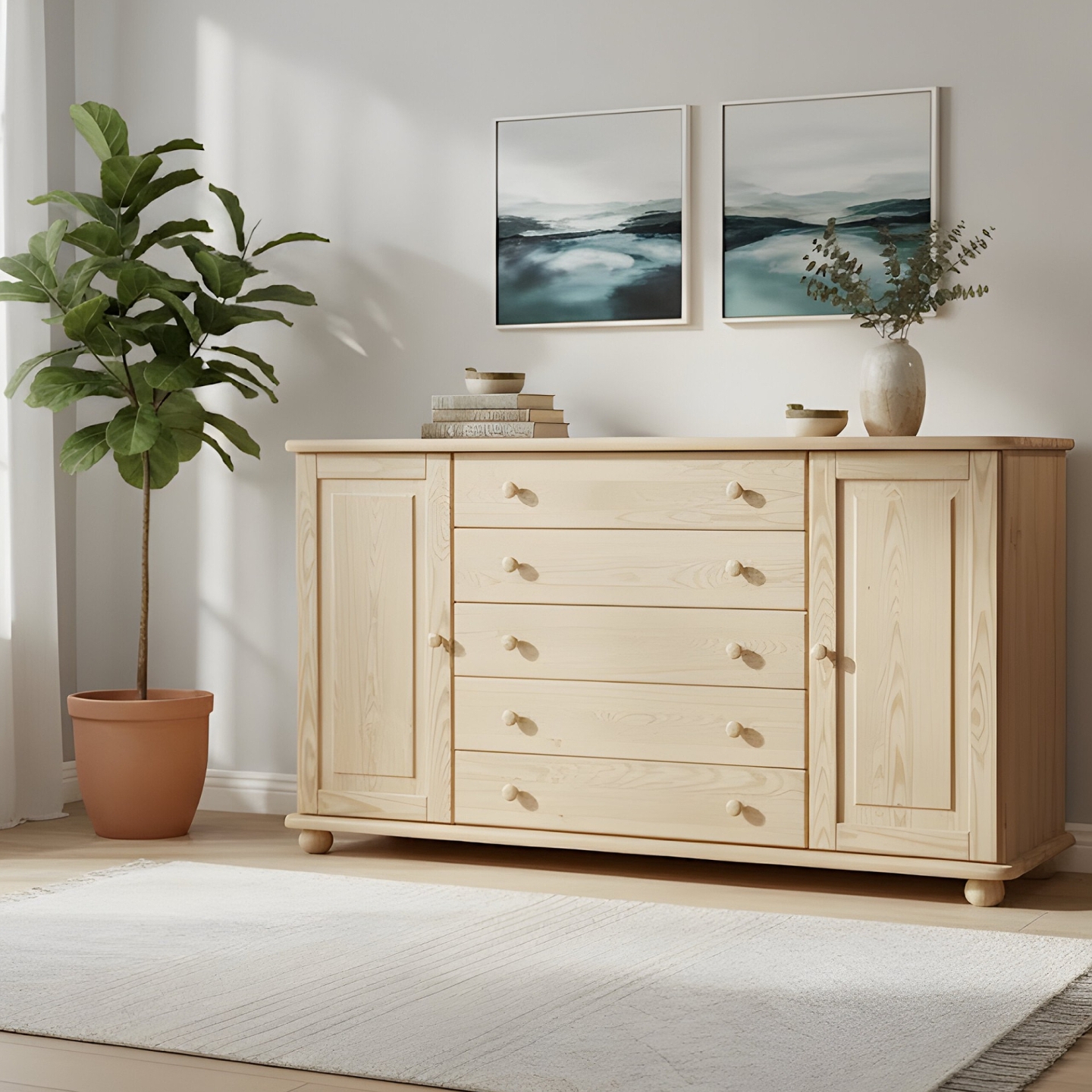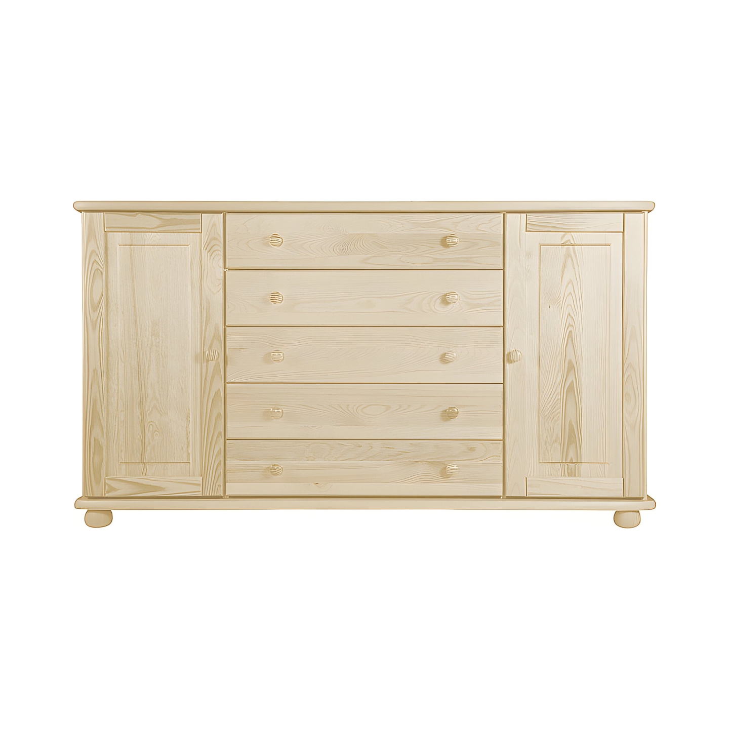 Szukasz ekstremalnie szerokiej i pojemnej komody drewnianej, która stanie się centralnym punktem Twojego salonu lub sypialni? Prezentujemy bardzo szeroką komodę sosnową o długości 165 cm, która harmonijnie łączy szuflady i zamykane szafki. Mebel ten został wykonany w całości z litego drewna sosnowego, wykończonego lakierem bezbarwnym.