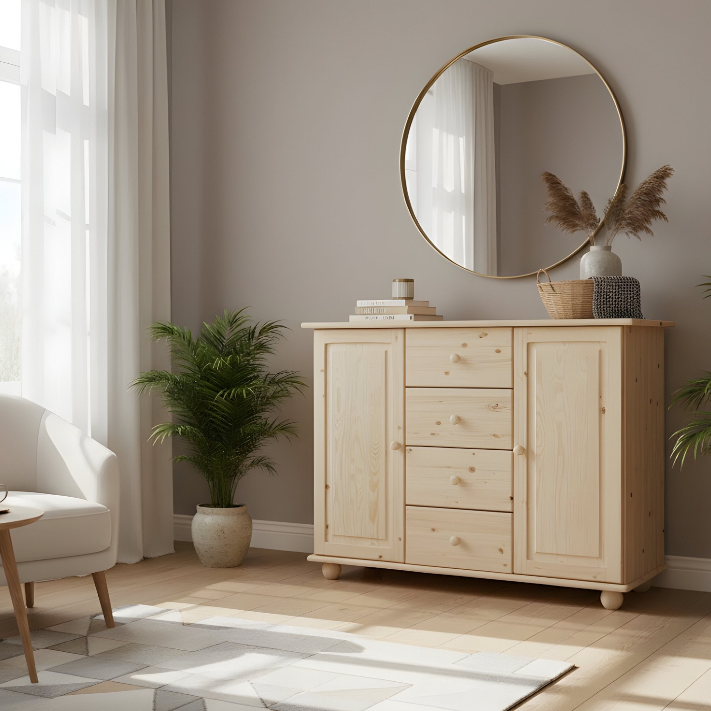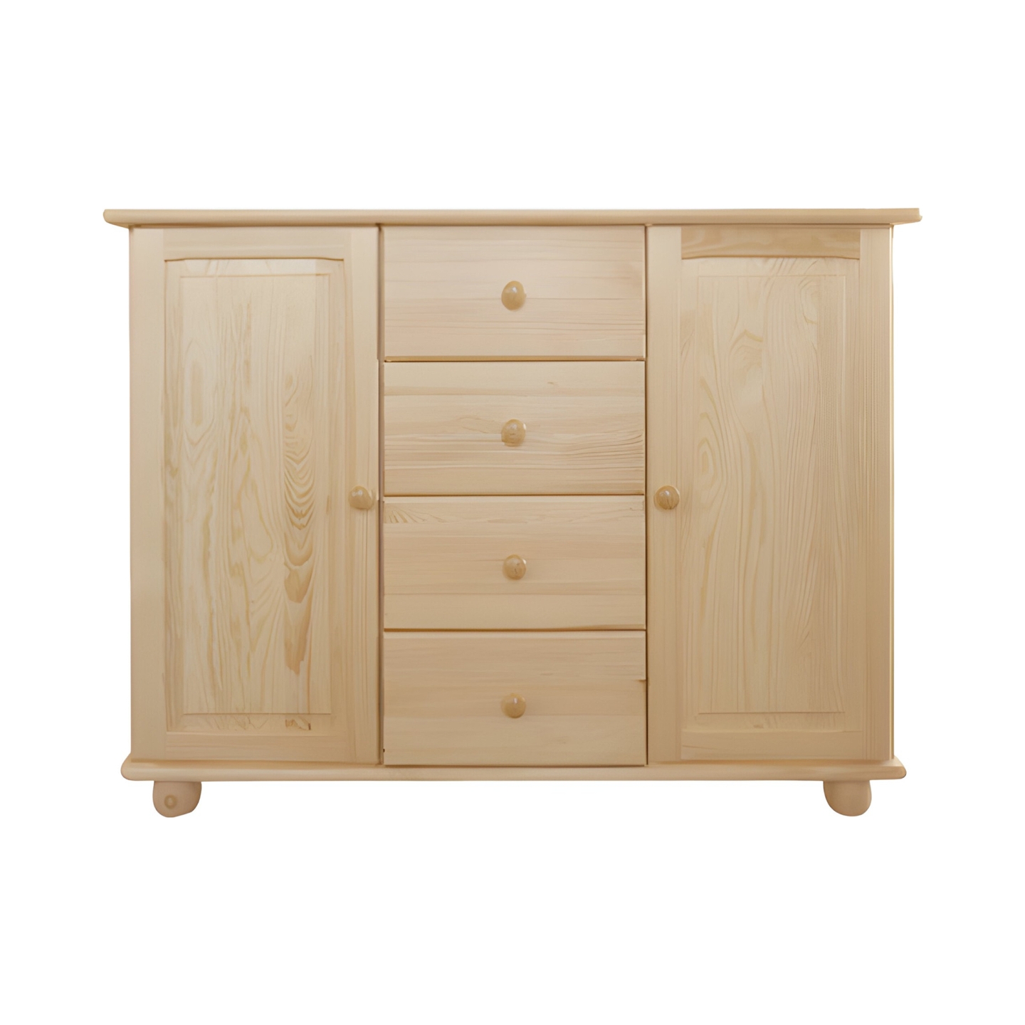 Szukasz szerokiej i pojemnej komody drewnianej, która pomieści zarówno bieliznę, jak i większe przedmioty? Prezentujemy szeroką komodę sosnową z drzwiami i szufladami. Mebel ten został wykonany w całości z litego drewna sosnowego, wykończonego lakierem bezbarwnym. Szerokość 118 cm i optymalna wysokość 86 cm zapewniają dużo miejsca do przechowywania i stanowią solidną podstawę pod telewizor lub dekoracje.