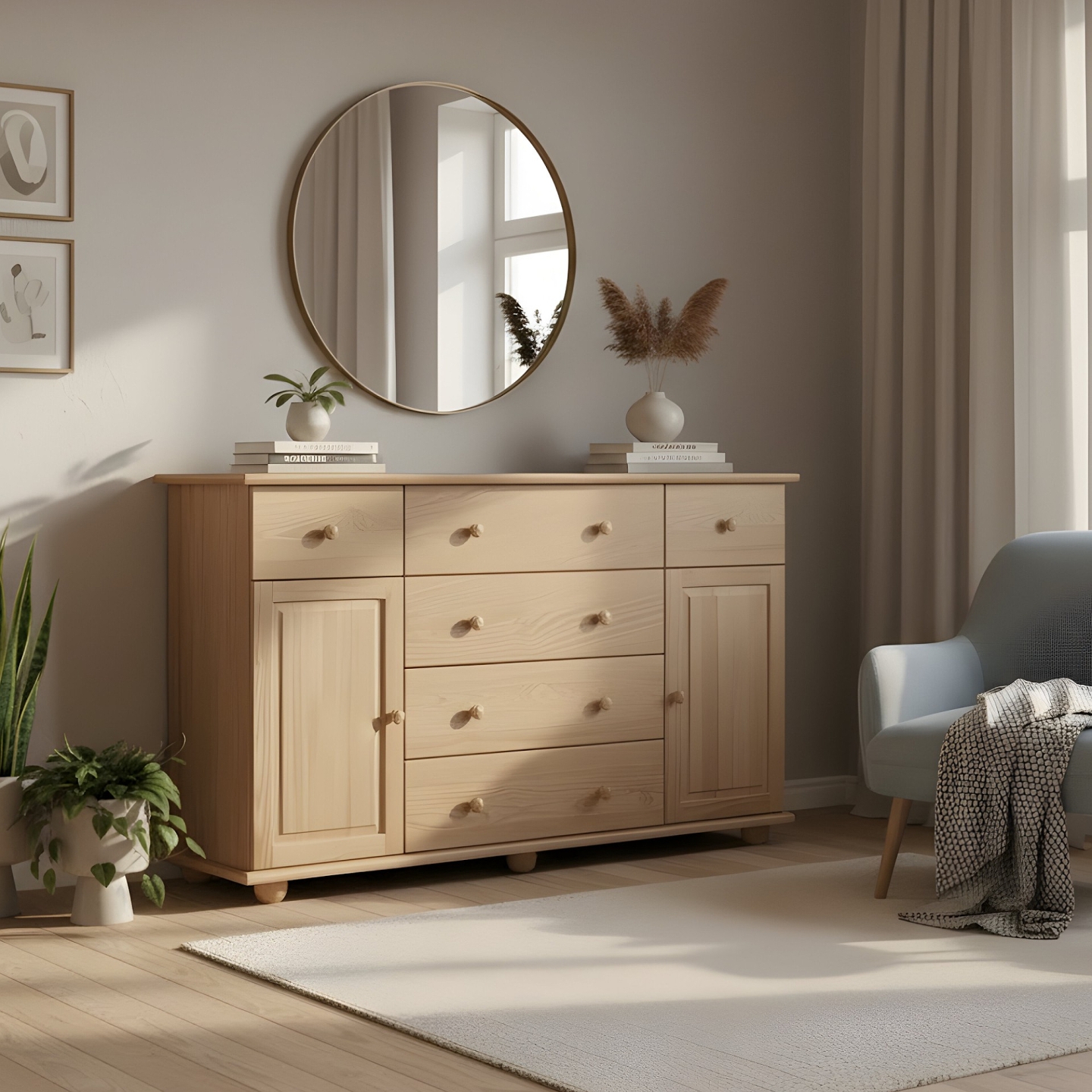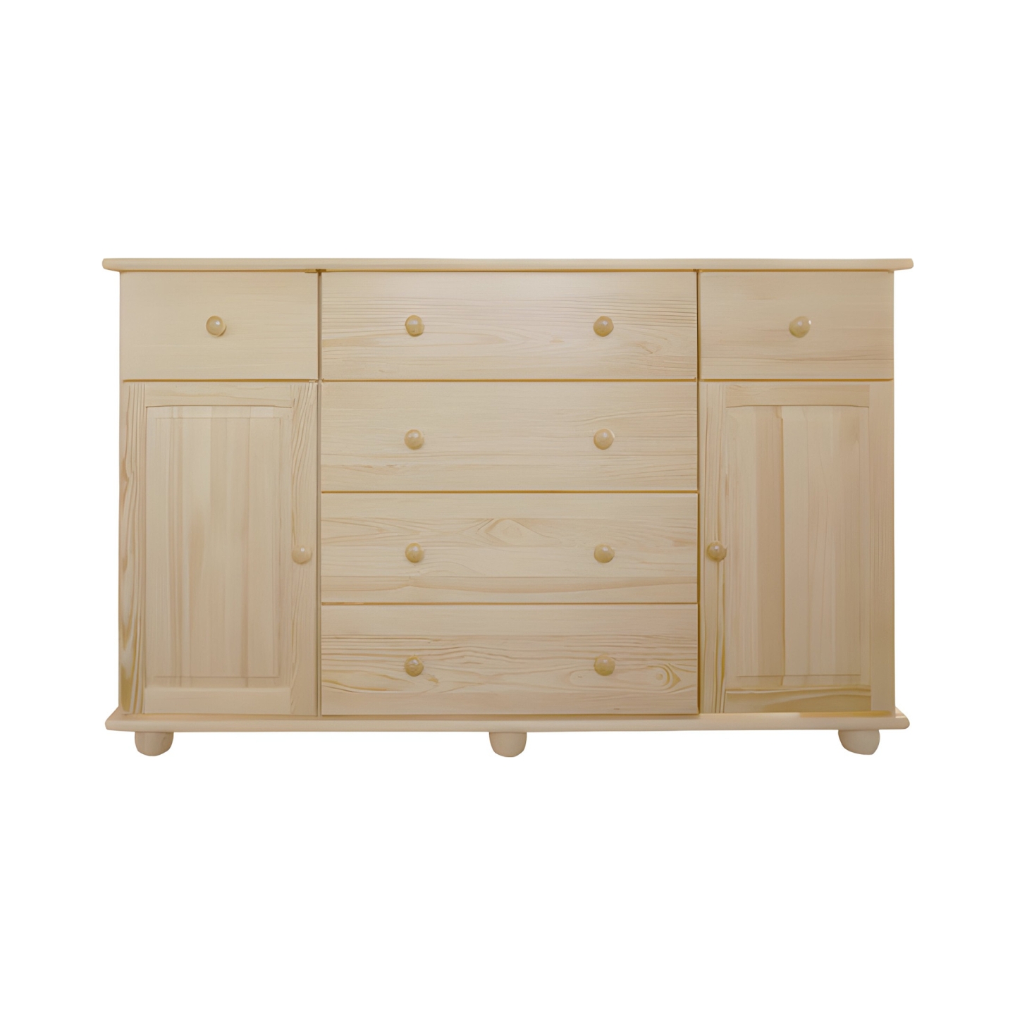Szukasz dużej, imponującej komody drewnianej, która pomieści niemal wszystko? Prezentujemy bardzo szeroką komodę sosnową o długości 150 cm, która harmonijnie łączy szuflady i zamykane szafki. Mebel ten został wykonany w całości z litego drewna sosnowego, wykończonego lakierem bezbarwnym. Szerokość 150 cm sprawia, że jest to idealny mebel do przestronnego salonu, sypialni lub jadalni.