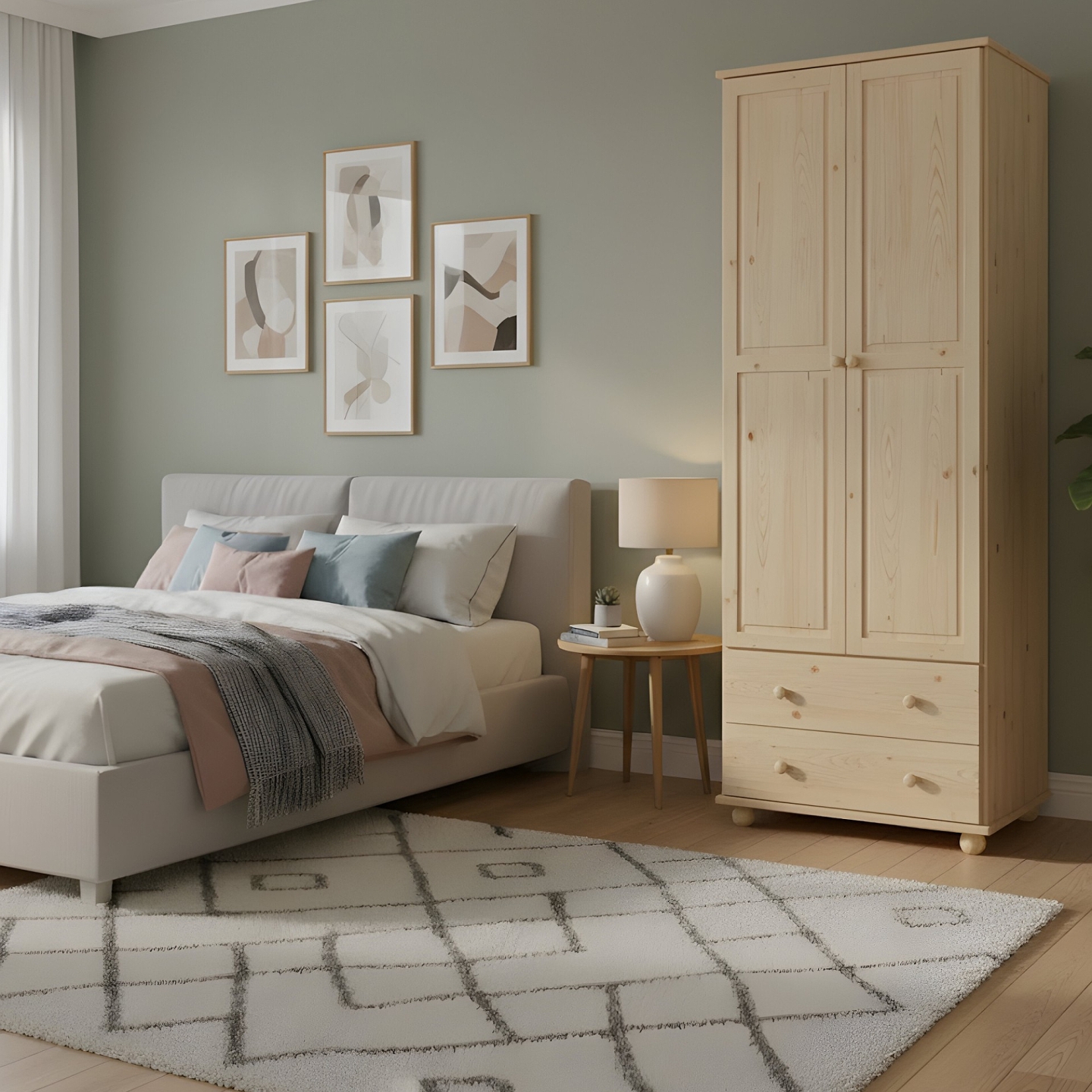 Szukasz wysokiej, klasycznej szafy drewnianej, idealnej do przechowywania wiszącej odzieży? Prezentujemy szafę sosnową z drążkiem i szufladami. Dzięki głębokości 62 cm, szafa zapewnia wystarczająco dużo miejsca, by swobodnie wieszać kurtki i płaszcze. Mebel ten został wykonany w całości z drewna sosnowego, wykończonego lakierem bezbarwnym, który doskonale zabezpiecza drewno, jednocześnie eksponując jego naturalny, ciepły odcień. Z wymiarami 85 cm szerokości i 200 cm wysokości, maksymalnie wykorzystuje dostępną przestrzeń.