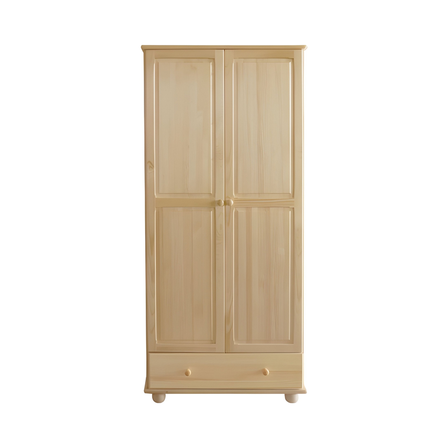 Szafa sosnowa dwudrzwiowa z drążkiem i szufladami – wysoka i pojemna w lakierze bezbarwnym (90x190x57 cm)