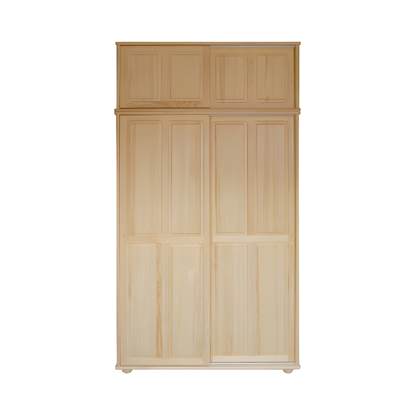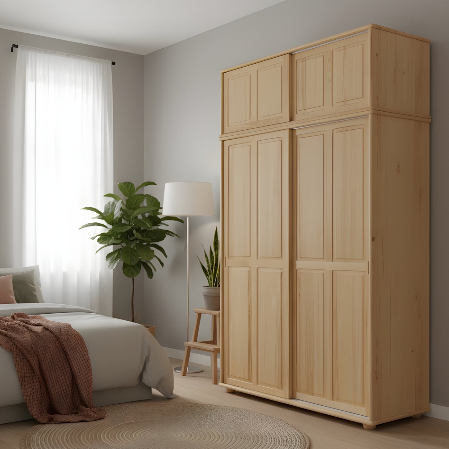 Szukasz szerokiej, bardzo wysokiej szafy sosnowej, która sięga niemal sufitu, maksymalizując przestrzeń do przechowywania? Prezentujemy szafę z drzwiami przesuwnymi i nadstawką. Mebel wykonano w całości z litego drewna sosnowego, wykończonego lakierem bezbarwnym. Łączna wysokość 240 cm (190 cm szafa + 50 cm nadstawka) pozwala na optymalne wykorzystanie pionowej przestrzeni.