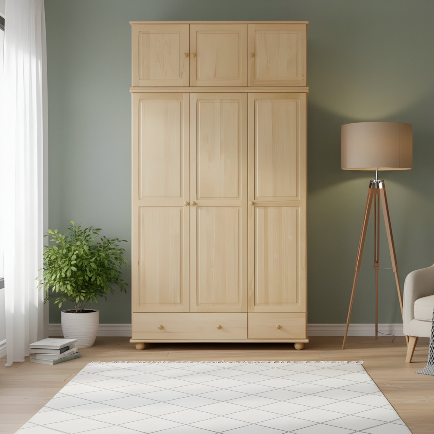Szukasz szerokiej, bardzo wysokiej szafy sosnowej, która sięga niemal sufitu, maksymalizując przestrzeń do przechowywania? Prezentujemy szafę z drzwiami uchylnymi, szufladami i nadstawką. Mebel wykonano w całości z litego drewna sosnowego, wykończonego lakierem bezbarwnym. Łączna wysokość 240 cm (190 cm szafa + 50 cm nadstawka) pozwala na optymalne wykorzystanie pionowej przestrzeni.