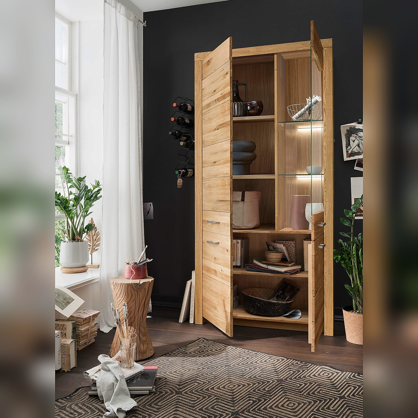 Wysokość 204 cm oraz waga 95 kg przekładają się na wyjątkową stabilność konstrukcji, która nie pracuje pod obciążeniem półek. Lite elementy dębowe zachowują swój naturalny układ słojów i sęków, co sprawia, że każda witryna jest unikatowa.