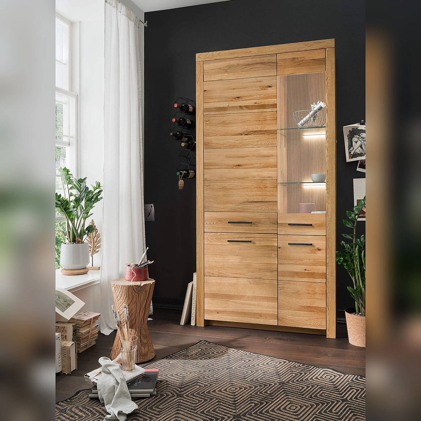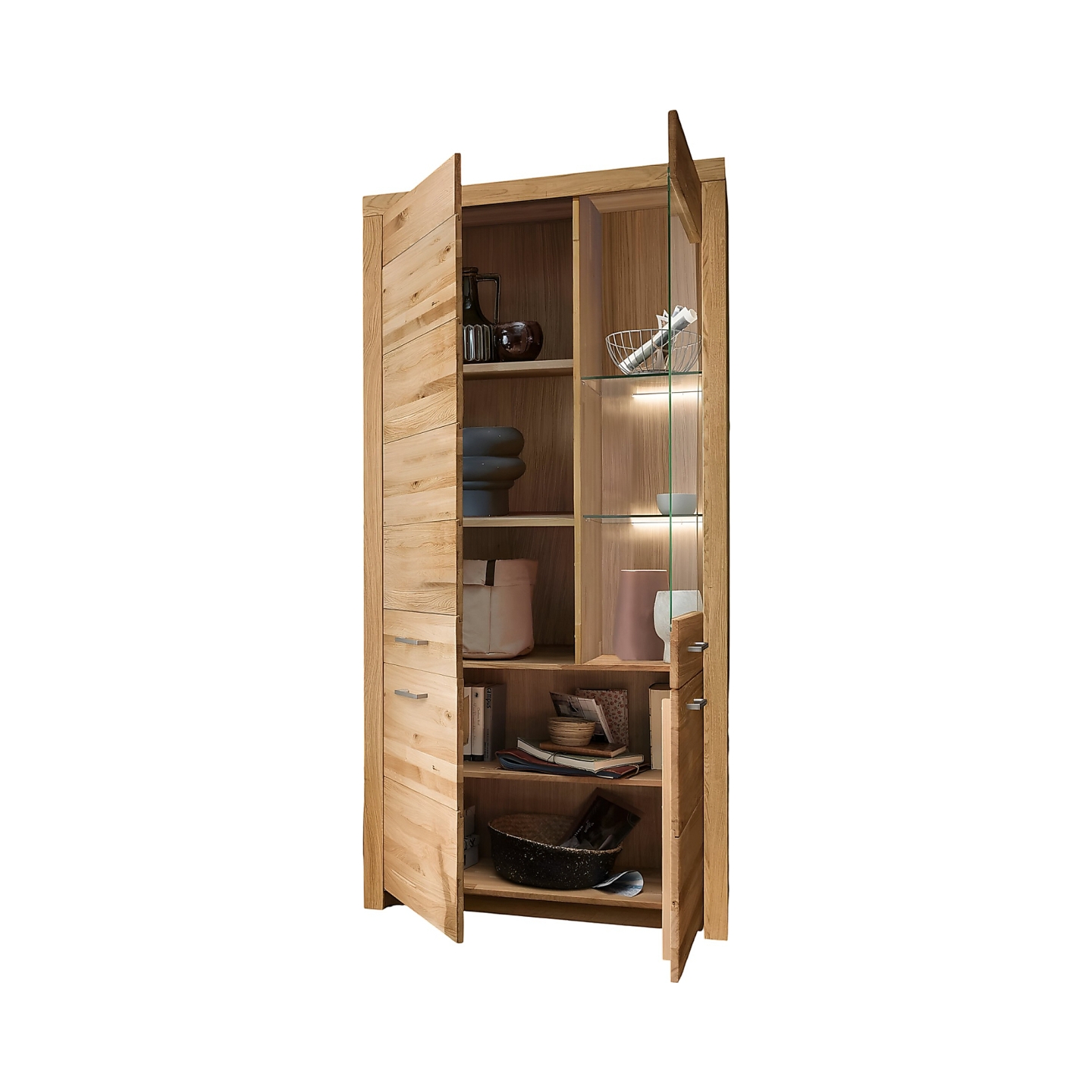 Witryna Dębowa II Prawa Robusto to masywny mebel wykonany w całości z litego dębu, zaprojektowany z myślą o długowiecznym i intensywnym użytkowaniu. Wykończenie bezbarwnym olejem podkreśla naturalny rysunek słojów oraz zróżnicowaną strukturę drewna, nadając wnętrzu ciepły i szlachetny charakter. Mebel jest dostarczany w całości zmontowany, dzięki czemu po dostawie jest od razu gotowy do użytkowania.