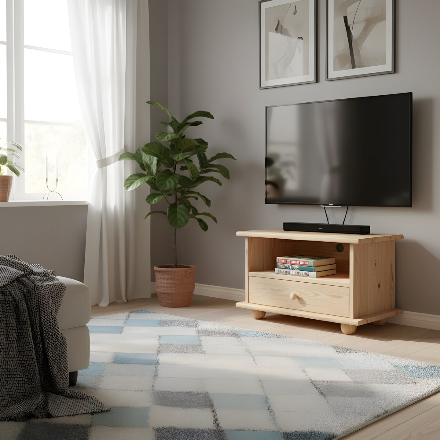 Szukasz kompaktowej, klasycznej szafki RTV drewnianej? Prezentujemy sosnową szafkę pod sprzęt, idealną do małych i średnich salonów. Mebel ten został wykonany w całości z litego drewna sosnowego, wykończonego lakierem bezbarwnym. Wąska szerokość 72 cm i niska wysokość 45 cm sprawiają, że idealnie wpasuje się pod telewizor, nie dominując przestrzeni.