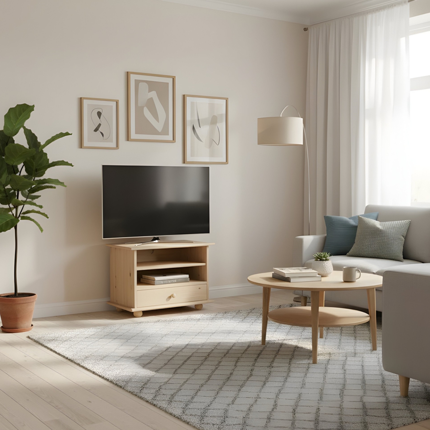 Szukasz kompaktowej, ale wyższej szafki RTV drewnianej, idealnej do ergonomicznego ustawienia telewizora i sprzętu w małym salonie? Prezentujemy sosnową szafkę pod sprzęt o wysokości 65 cm. Mebel ten został wykonany w całości z litego drewna sosnowego, wykończonego lakierem bezbarwnym. Wąska szerokość 72 cm sprawia, że idealnie wpasuje się w niewielkie przestrzenie.
