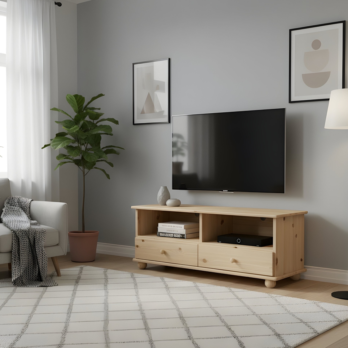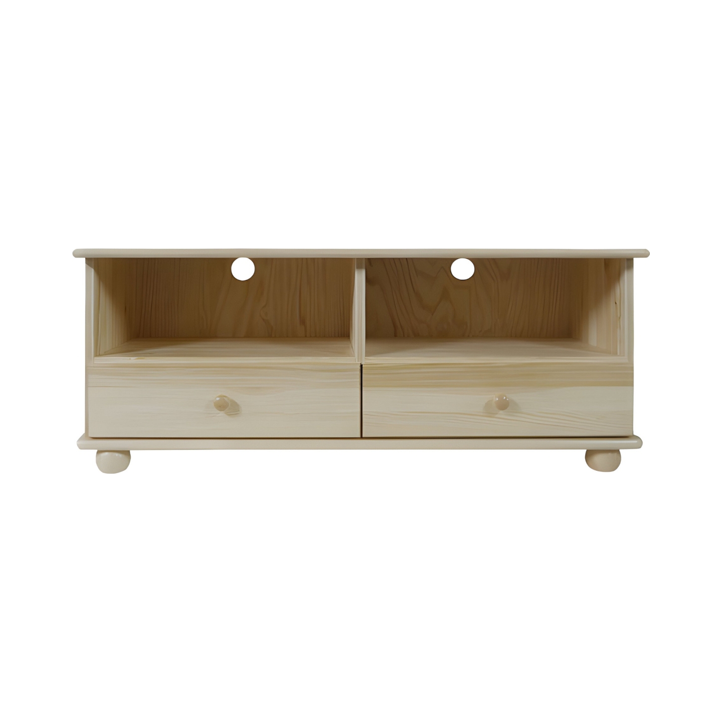 Szukasz szerokiej, stabilnej i funkcjonalnej szafki RTV drewnianej, idealnej do salonu? Prezentujemy sosnową szafkę RTV o szerokości 120 cm, wykonaną w całości z litego drewna sosnowego, wykończonego lakierem bezbarwnym. Kompaktowa wysokość 48 cm w połączeniu z szeroką i głęboką powierzchnią (42 cm) sprawia, że jest to doskonałe miejsce na każdy telewizor i sprzęt multimedialny.
