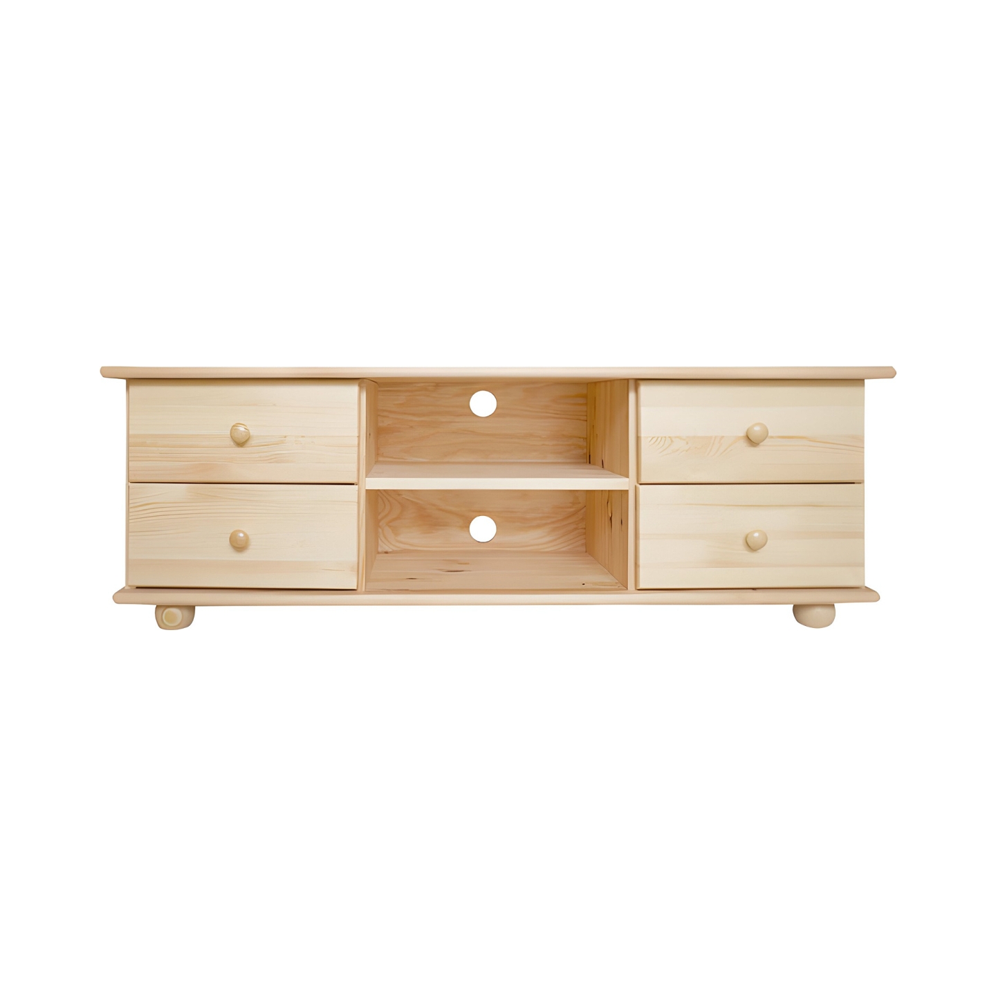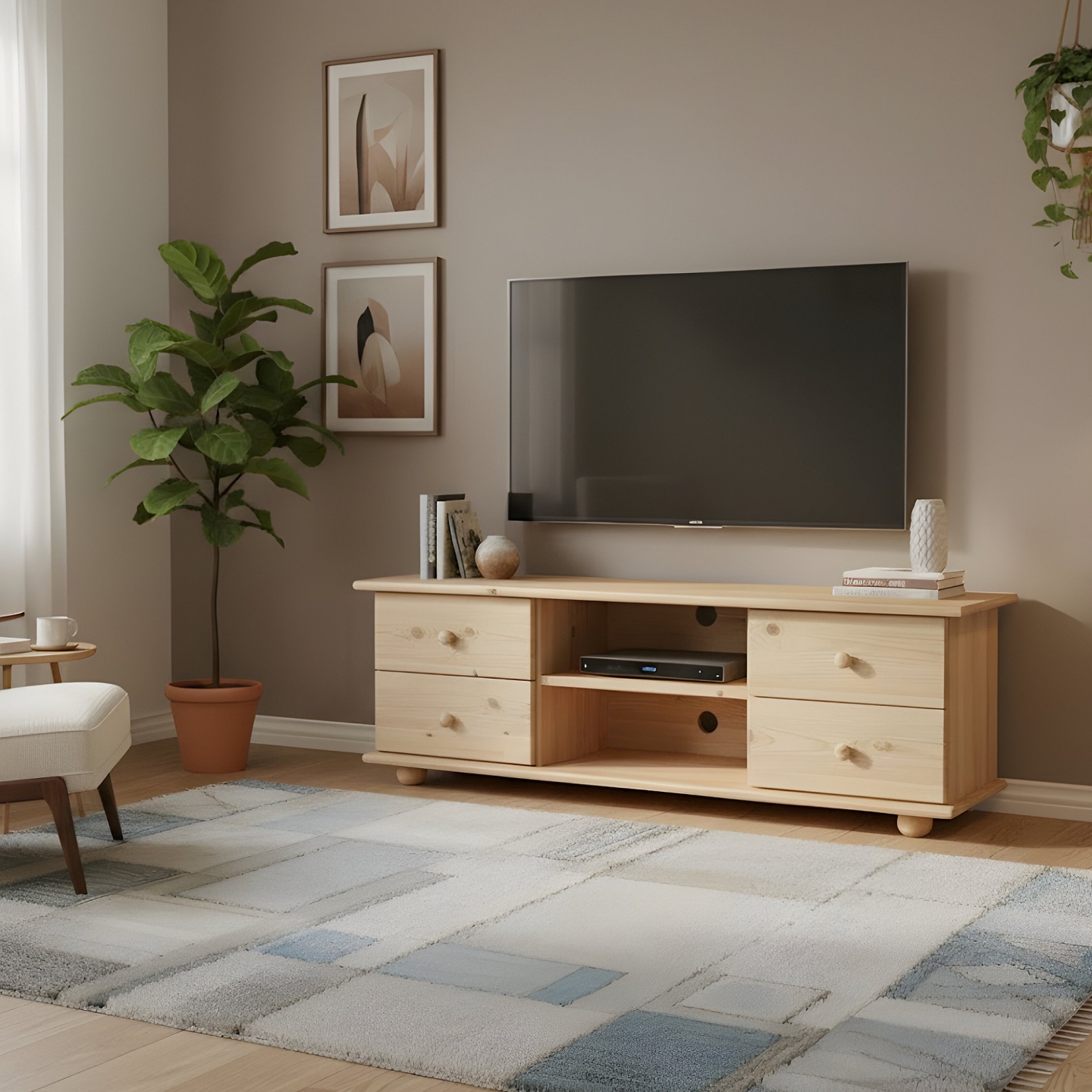 Szukasz szerokiej i stabilnej szafki RTV drewnianej, która pomieści duży telewizor oraz sprzęt audiowizualny, zapewniając łatwy dostęp? Prezentujemy sosnową szafkę RTV o szerokości 142 cm, wykonaną w całości z litego drewna sosnowego, wykończonego lakierem bezbarwnym. Niska wysokość 48 cm i szeroka powierzchnia czynią ją idealnym elementem do nowoczesnego, ale ciepłego salonu.