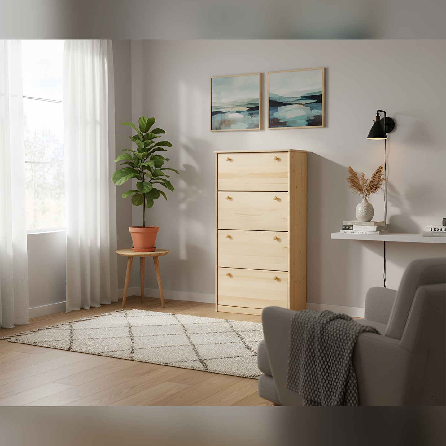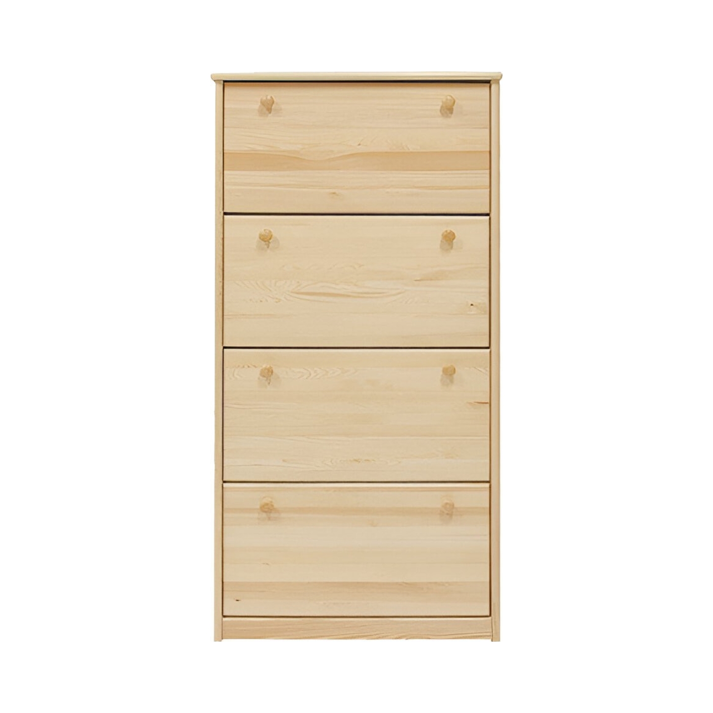 Szukasz wysokiej, ale niezwykle płytkiej szafki na buty drewnianej, która pomieści dużą ilość obuwia, nie blokując wąskiego przejścia? Prezentujemy sosnową szafkę na buty o wysokości 150 cm i głębokości zaledwie 29 cm, wykonaną w całości z litego drewna sosnowego, wykończonego lakierem bezbarwnym. Trzy kosze uchylne efektywnie wykorzystują pionową przestrzeń.