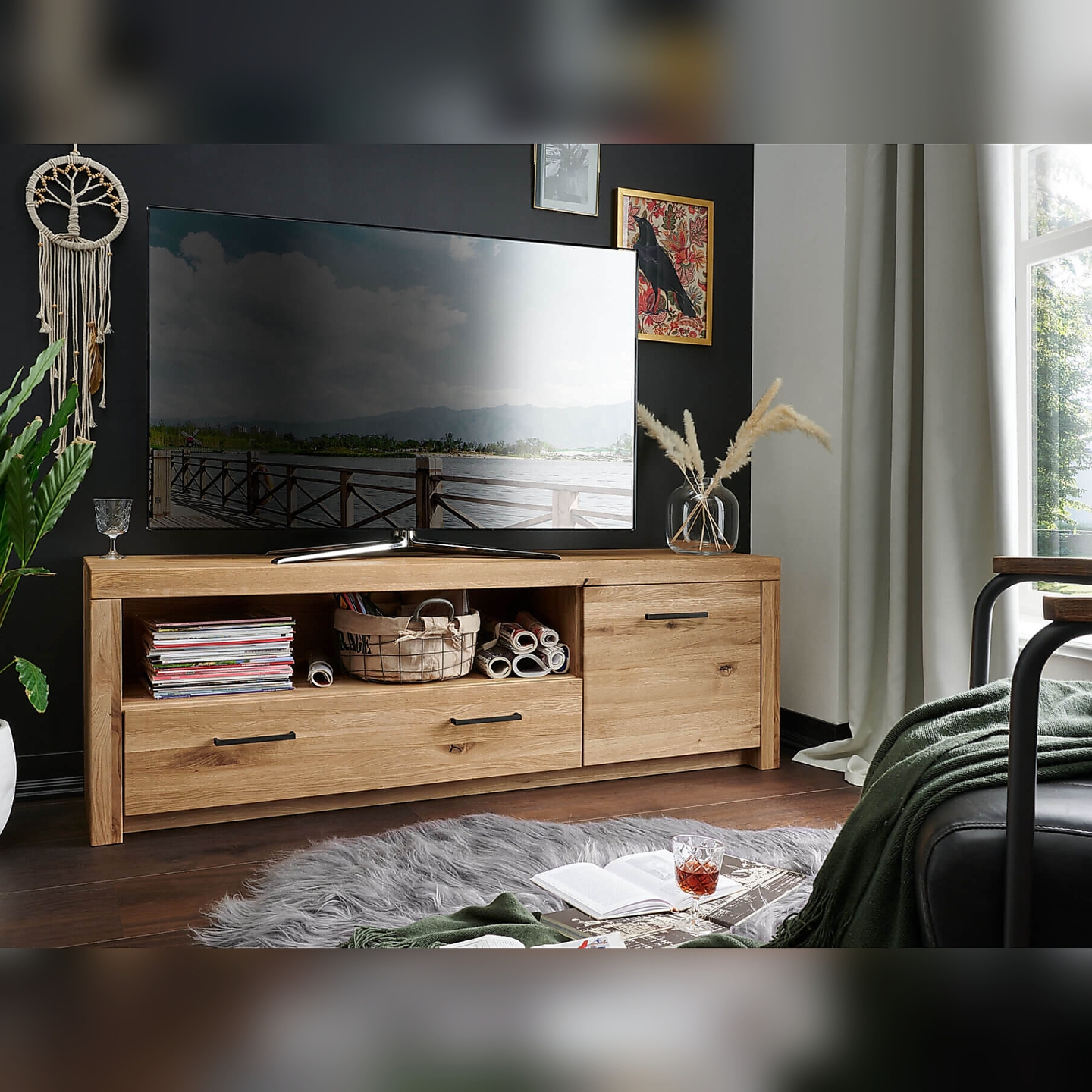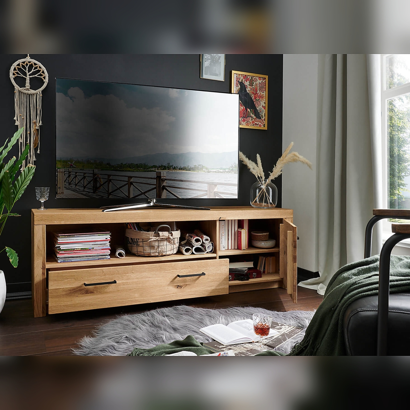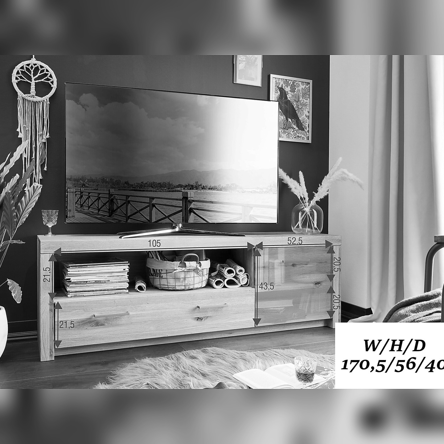👉 Szerokość 170,5 cm – wygodne miejsce na duży telewizor i sprzęt.
