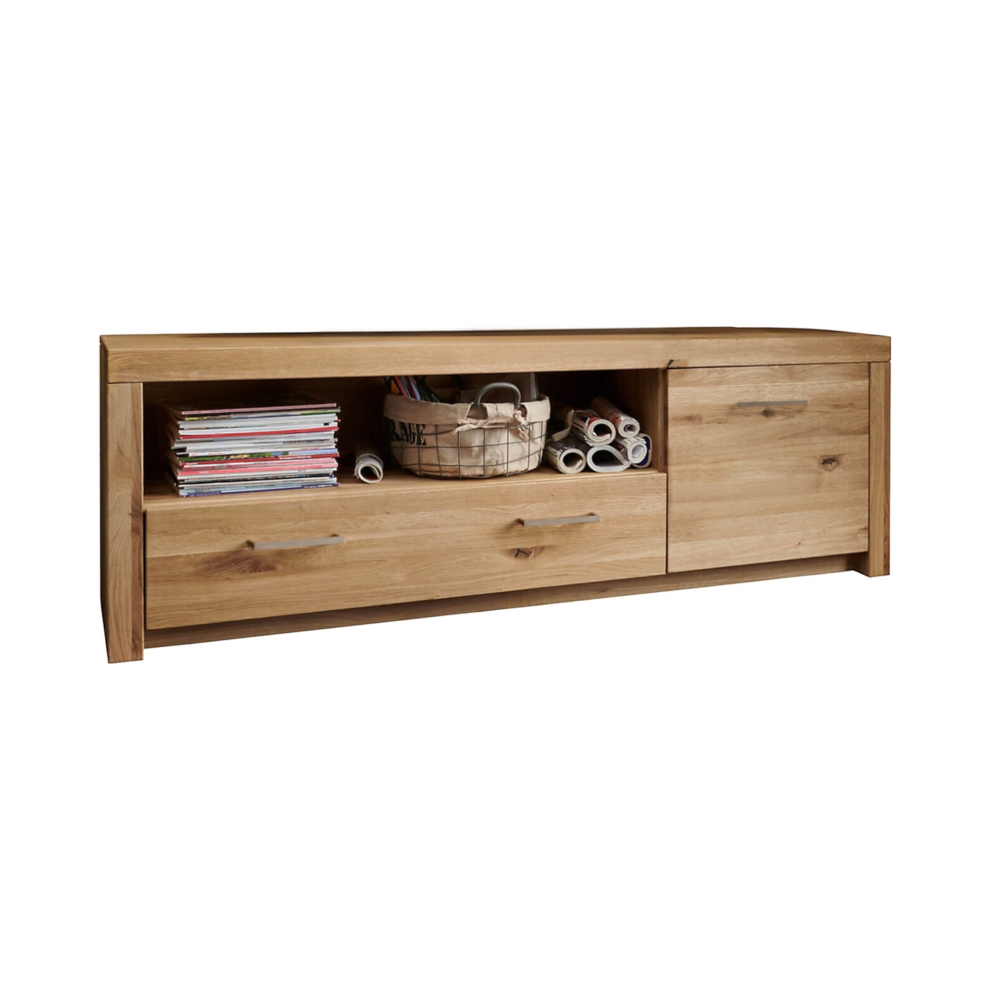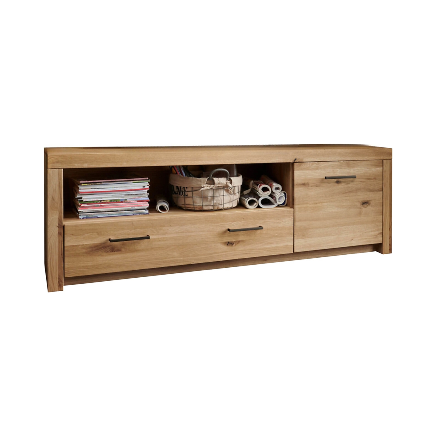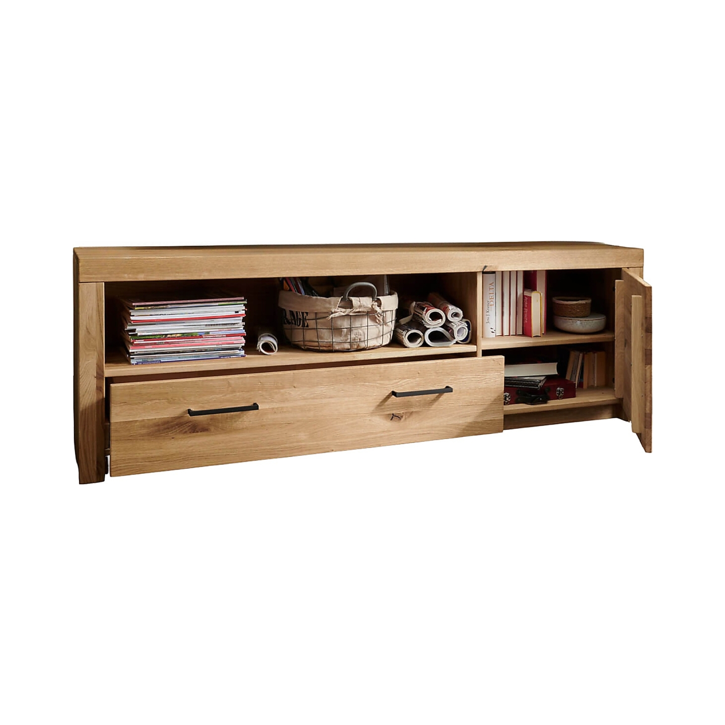 👉 Praktyczny układ – otwarta półka, szuflada i zamykana szafka.