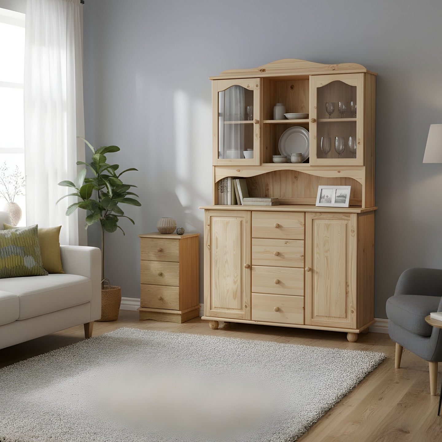 | Nazwa mebla | Kredens sosnowy z przeszkloną górą i szufladami |